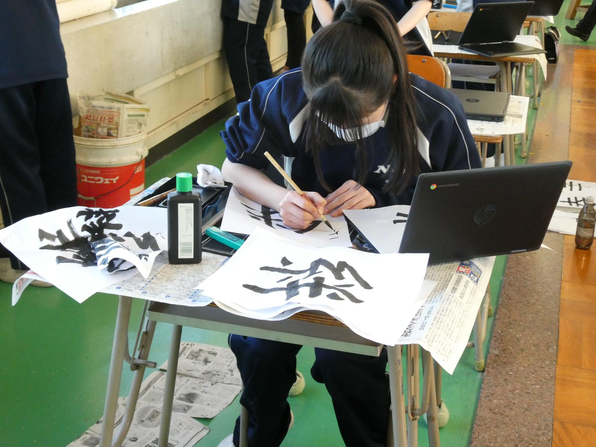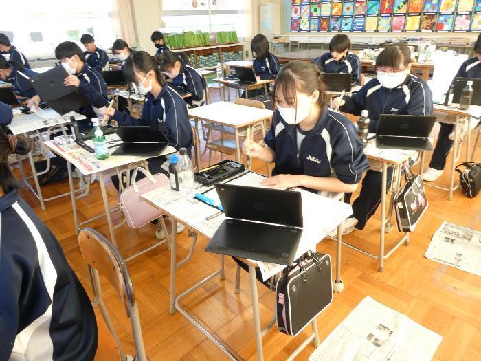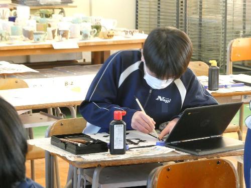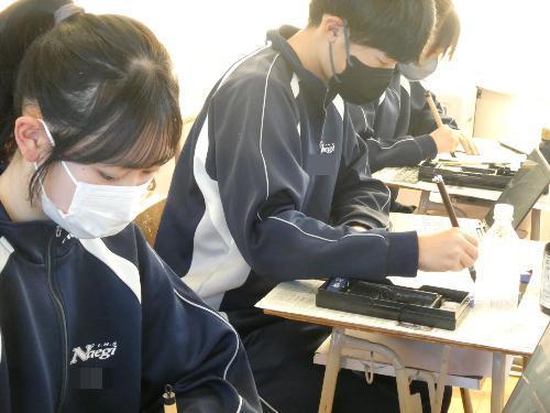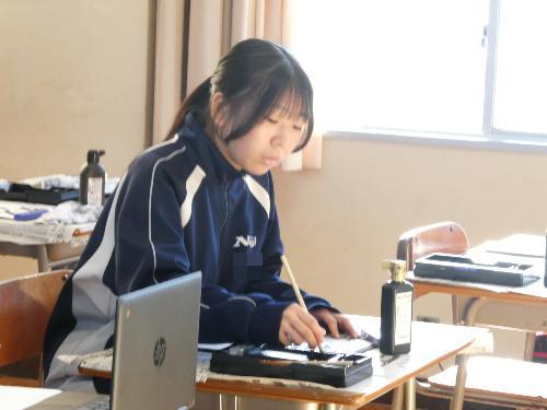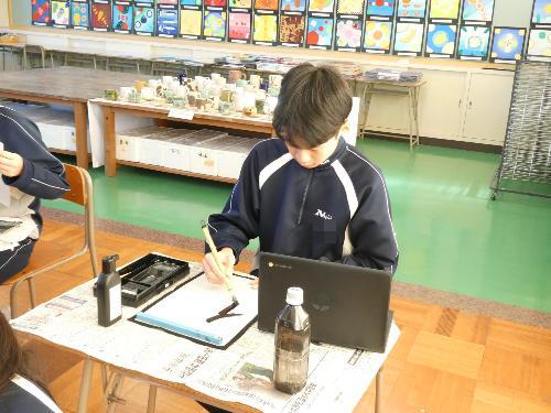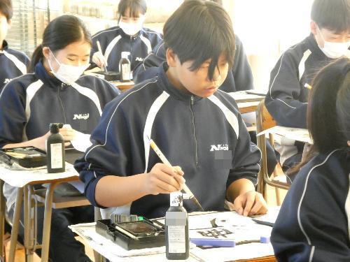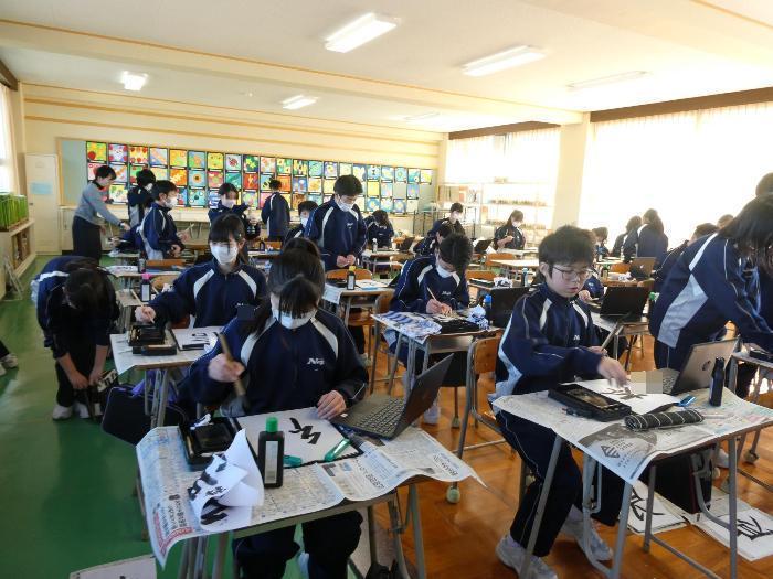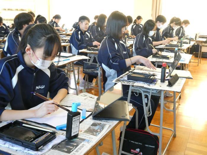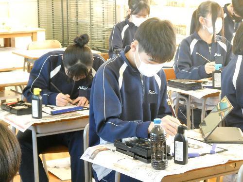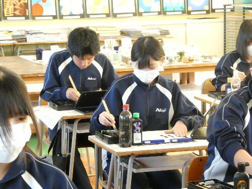 1時間目から5時間目まで、美術室では国語で書き初めの授業が行われました。1年、2年、そして3Aの5クラスです。3Bは来週行う予定です。