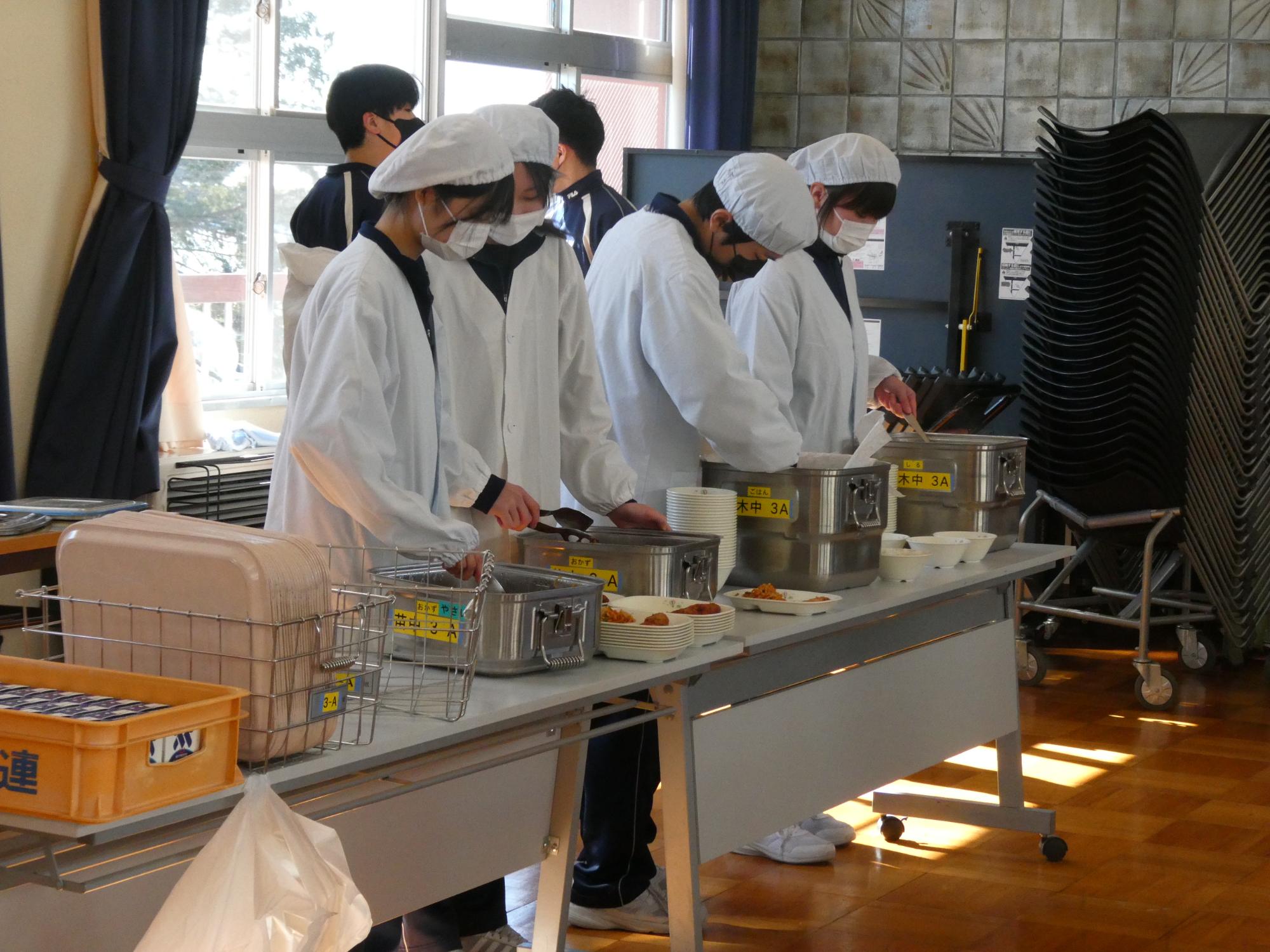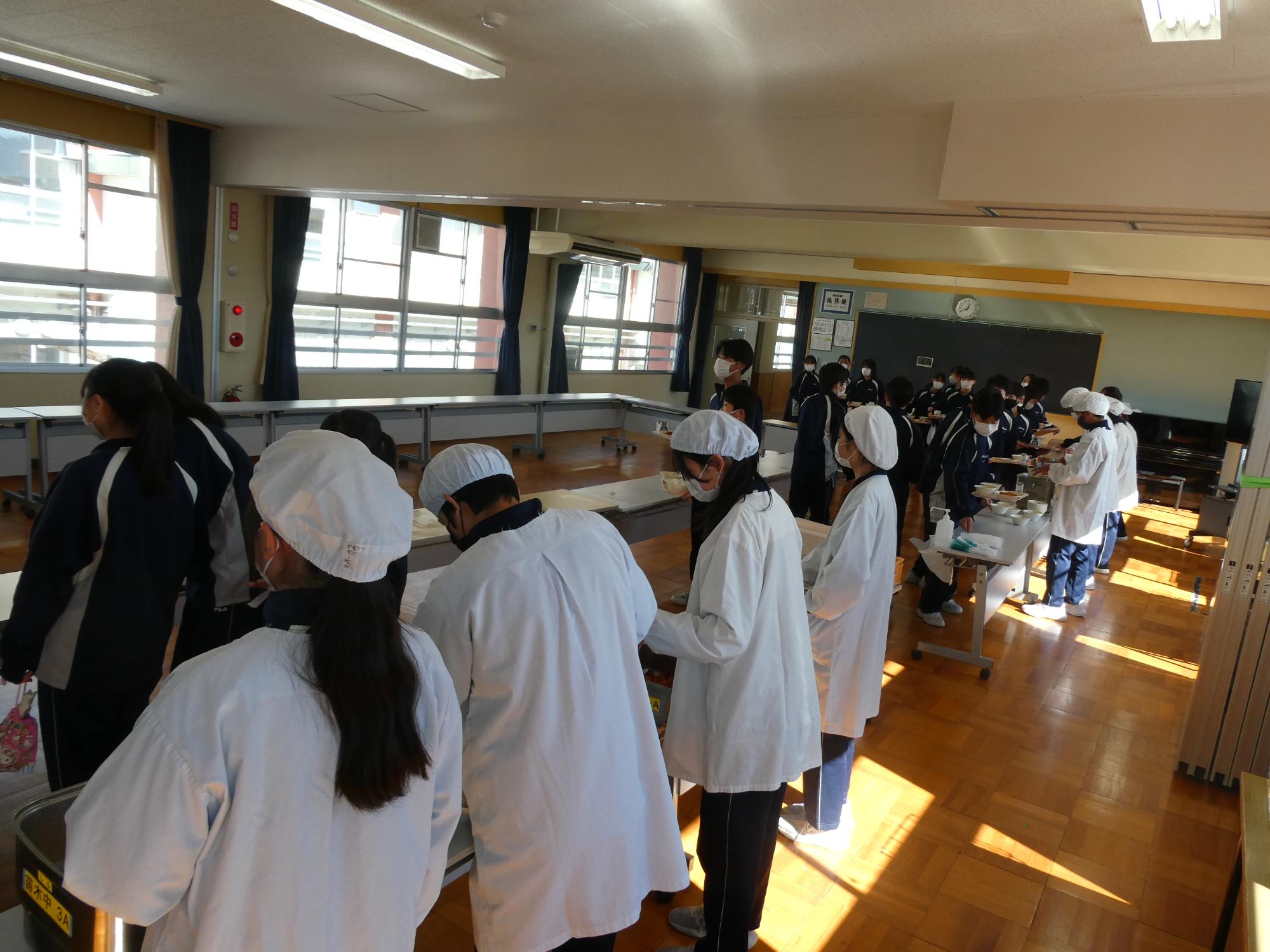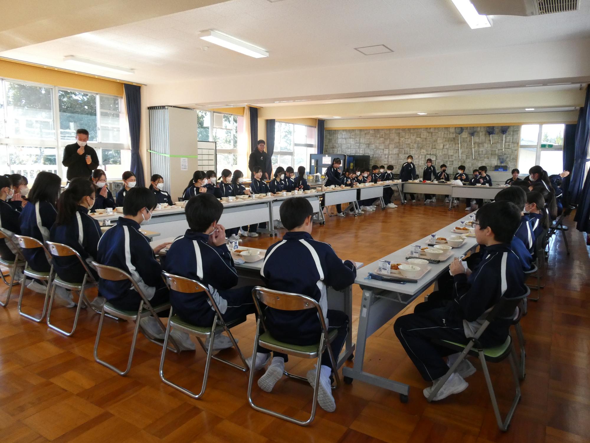 給食委員長は、最初、全校で給食という考えもあったようですが、体育館では寒すぎる、机イスが足りない、ということで2クラスずつの給食イベントになりました。