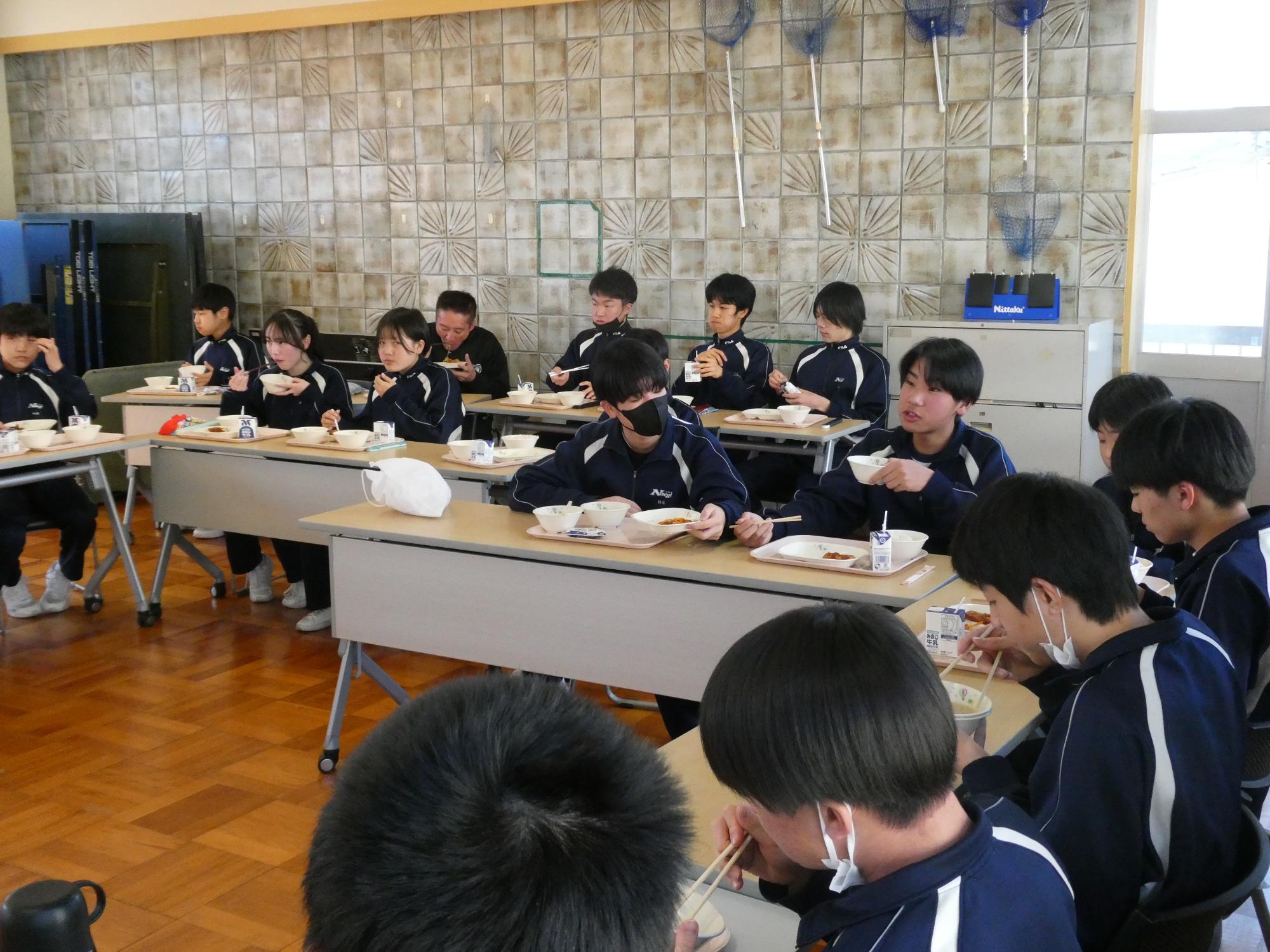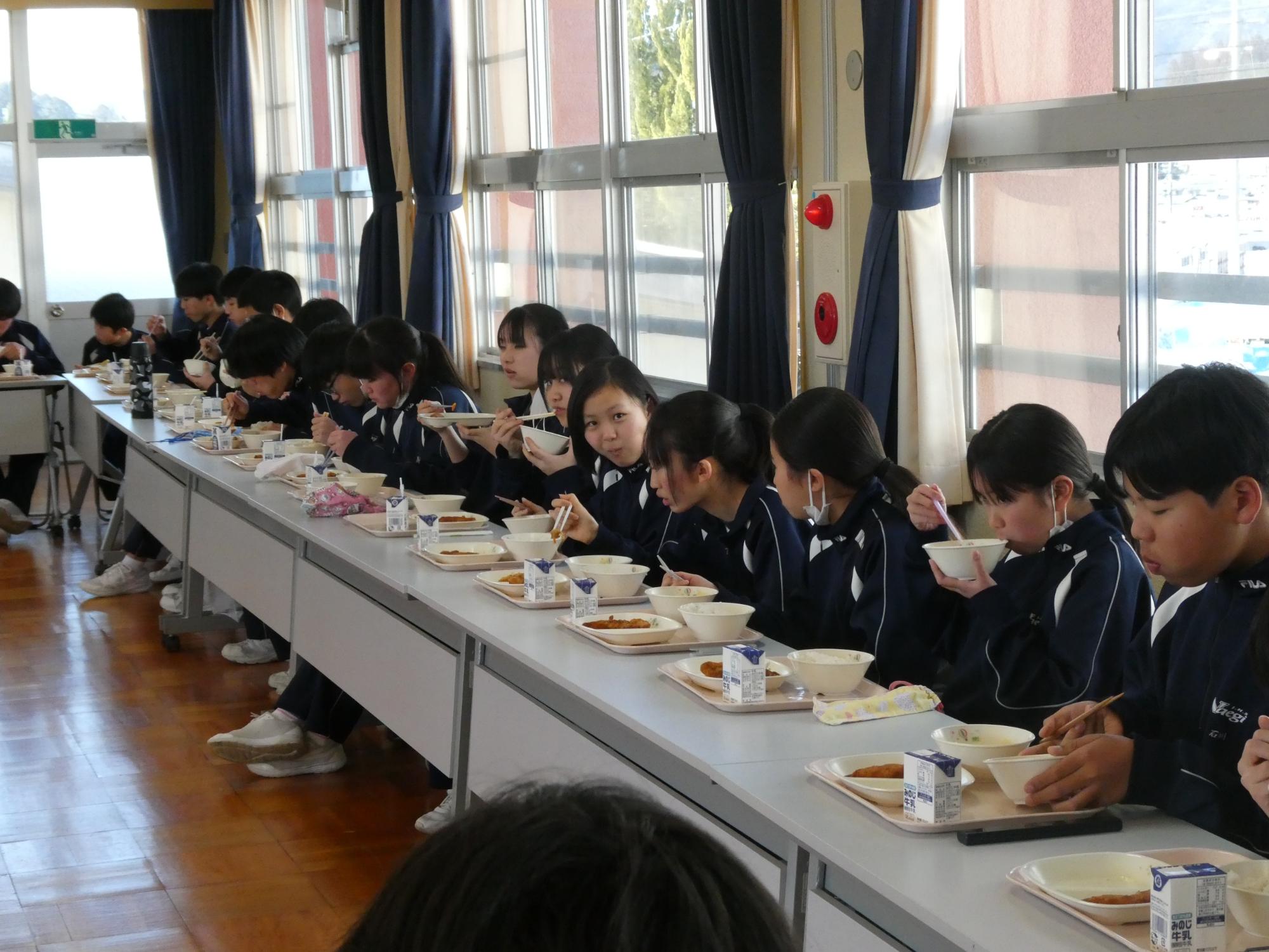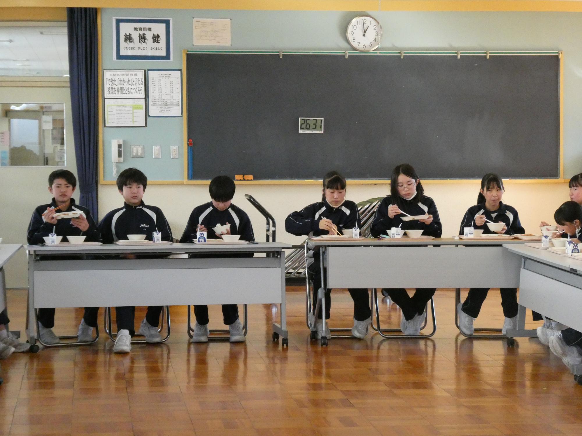 給食委員長は、最初、全校で給食という考えもあったようですが、体育館では寒すぎる、机イスが足りない、ということで2クラスずつの給食イベントになりました。