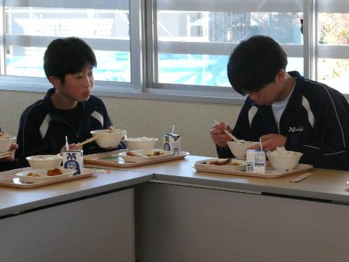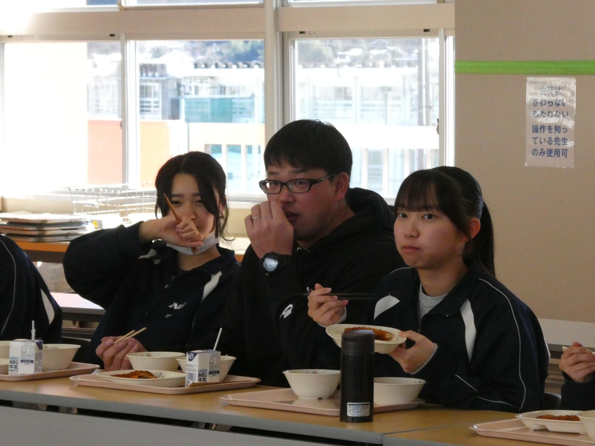 ぎゃあぎゃあ騒ぎながら食べるわけではないので、毎日やっている合唱練習よりもよほど安全かも。教室3つ分の広さがある空間に2クラスなので、教室内よりも密度はかなり低い。