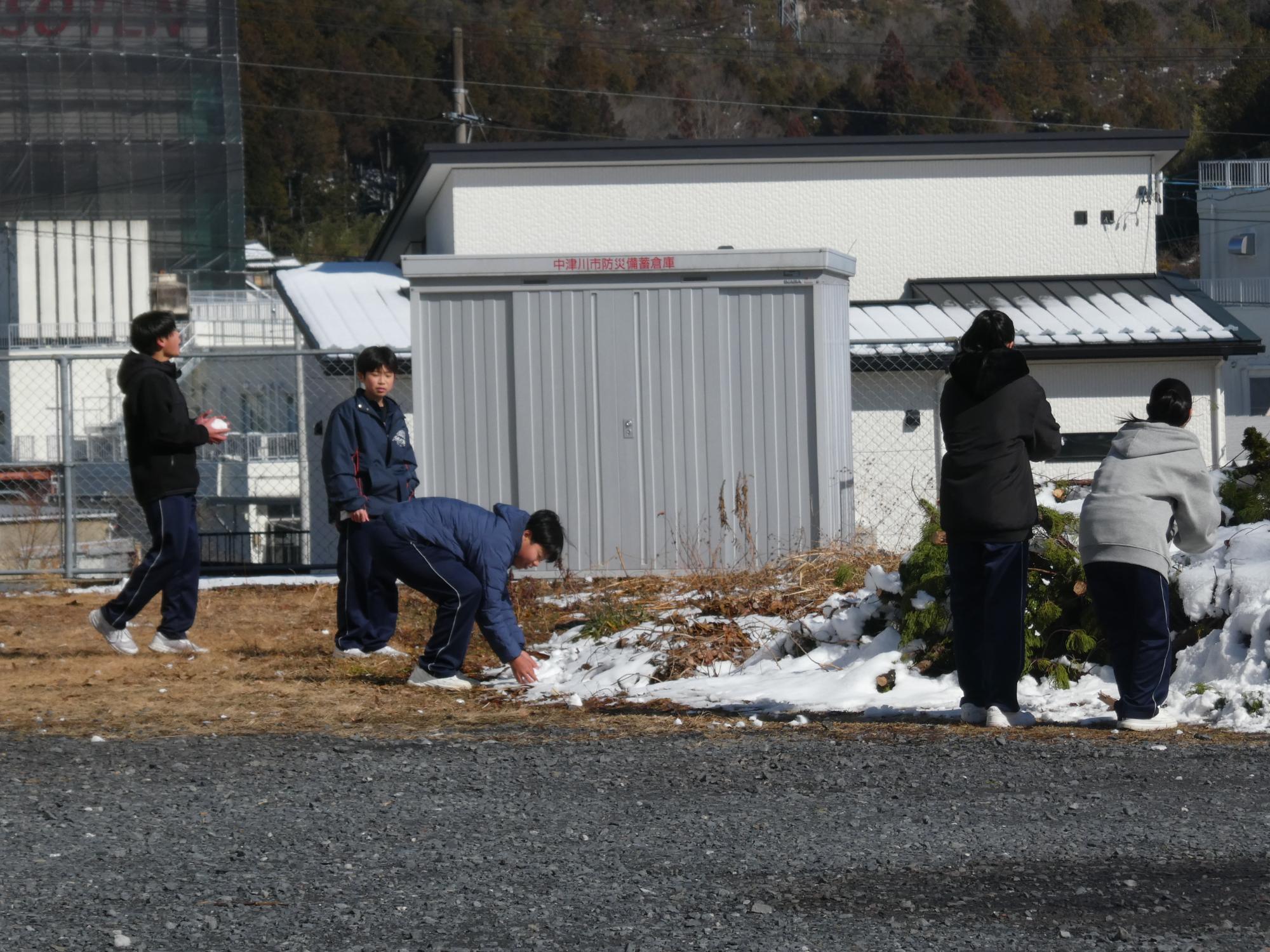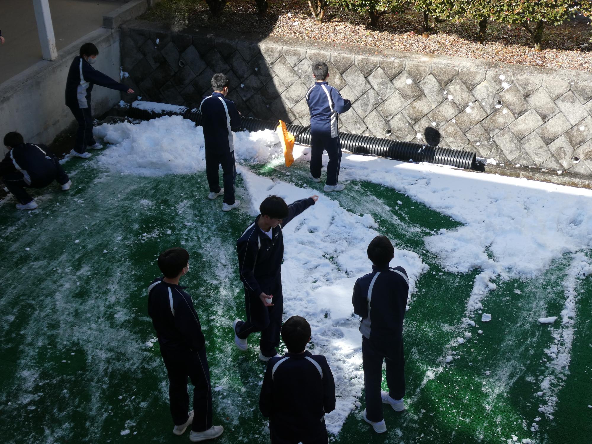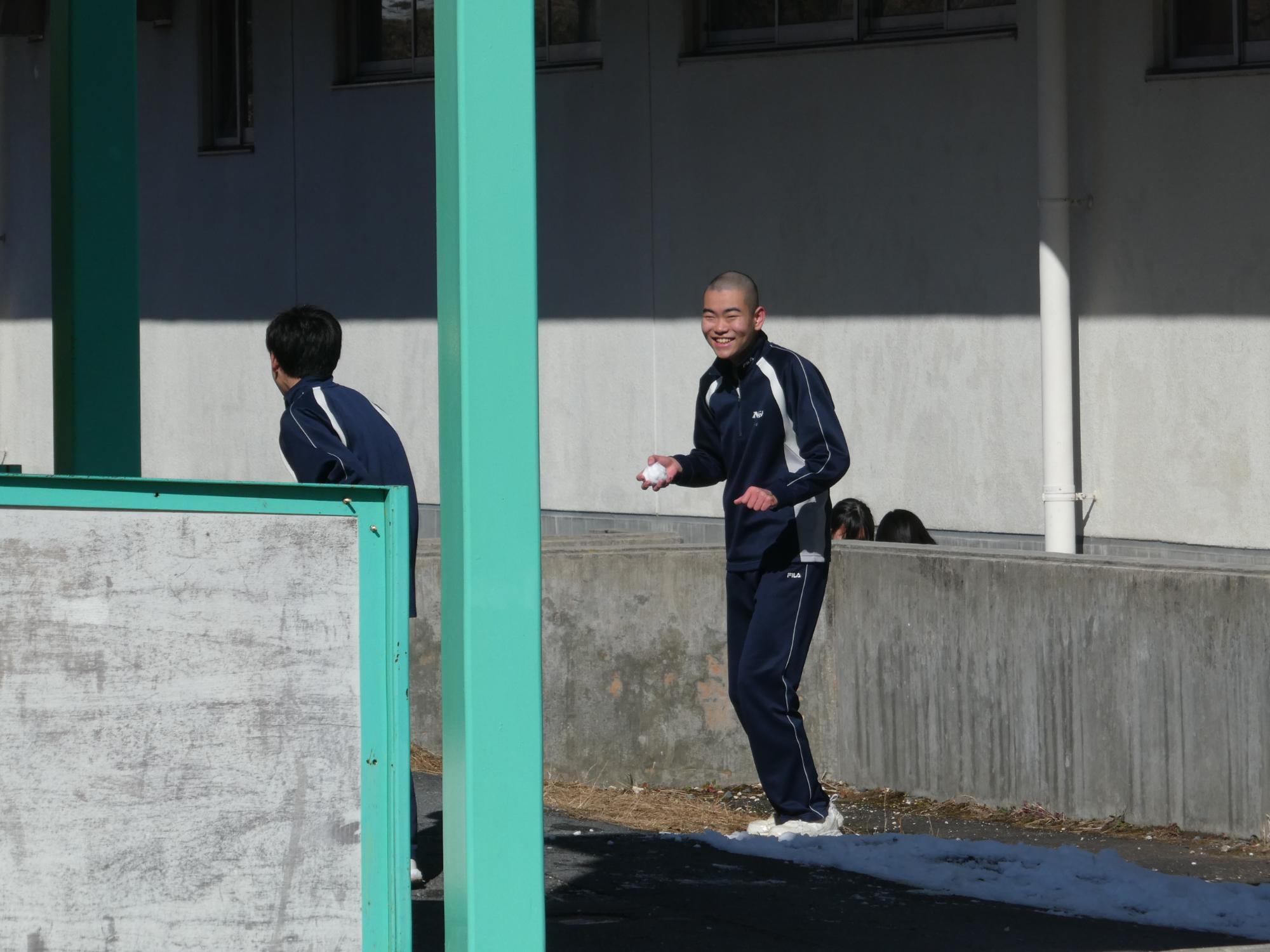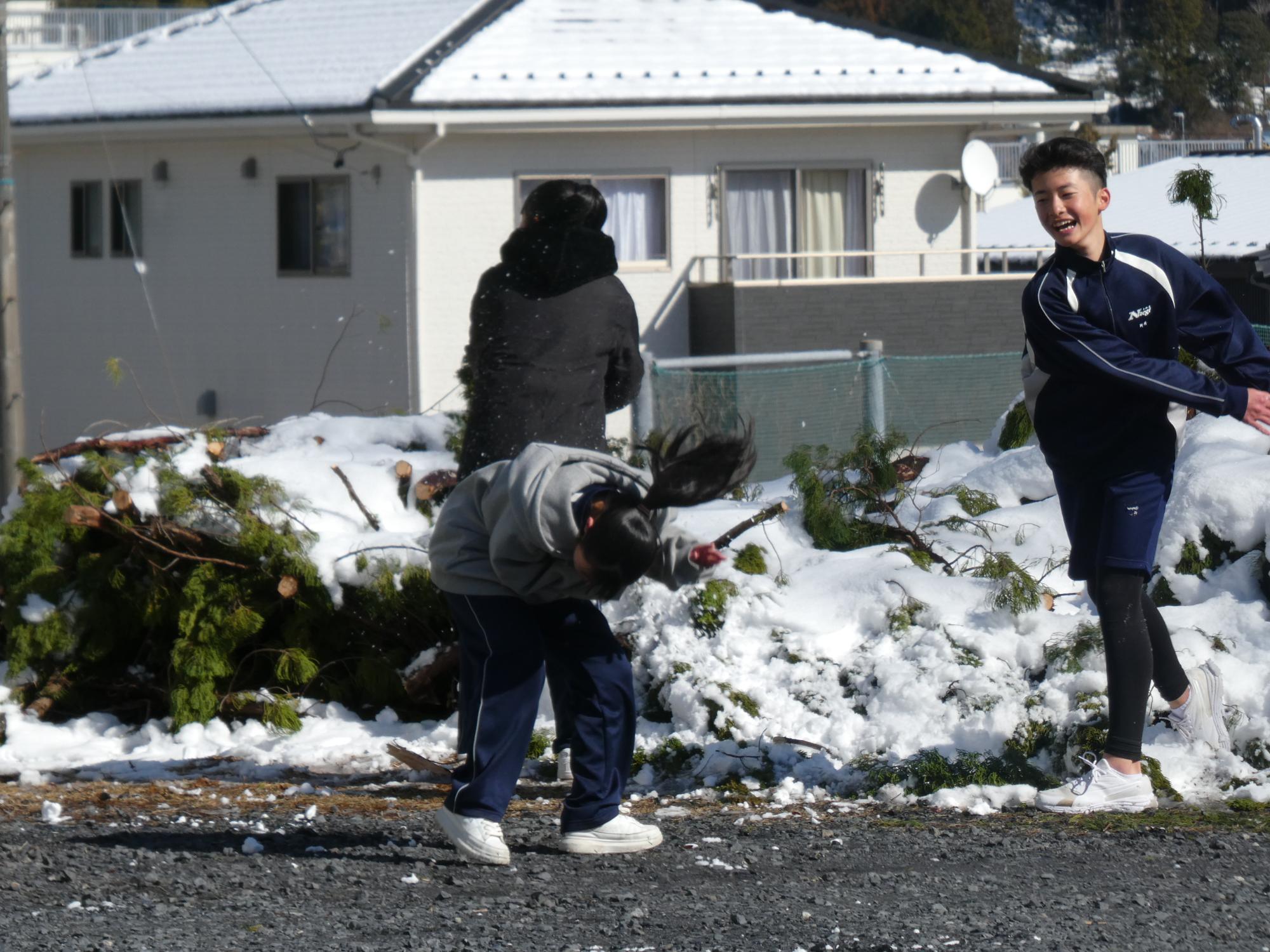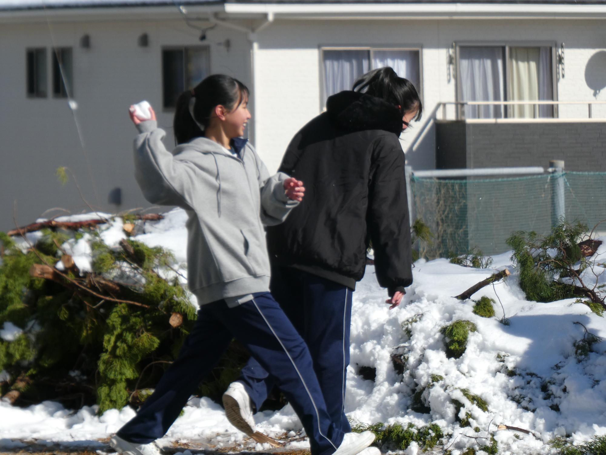 体育館とグラウンドの間の駐車場では、1年生が雪合戦