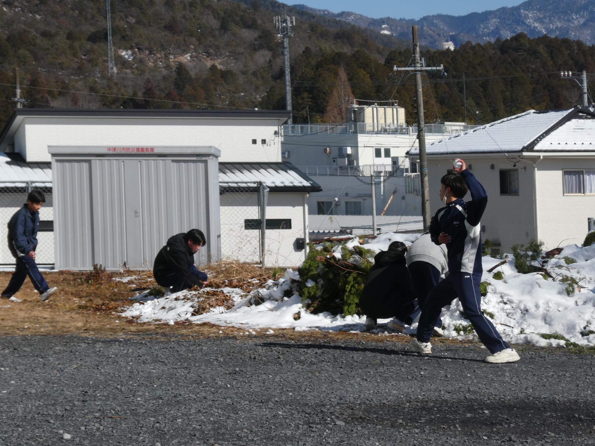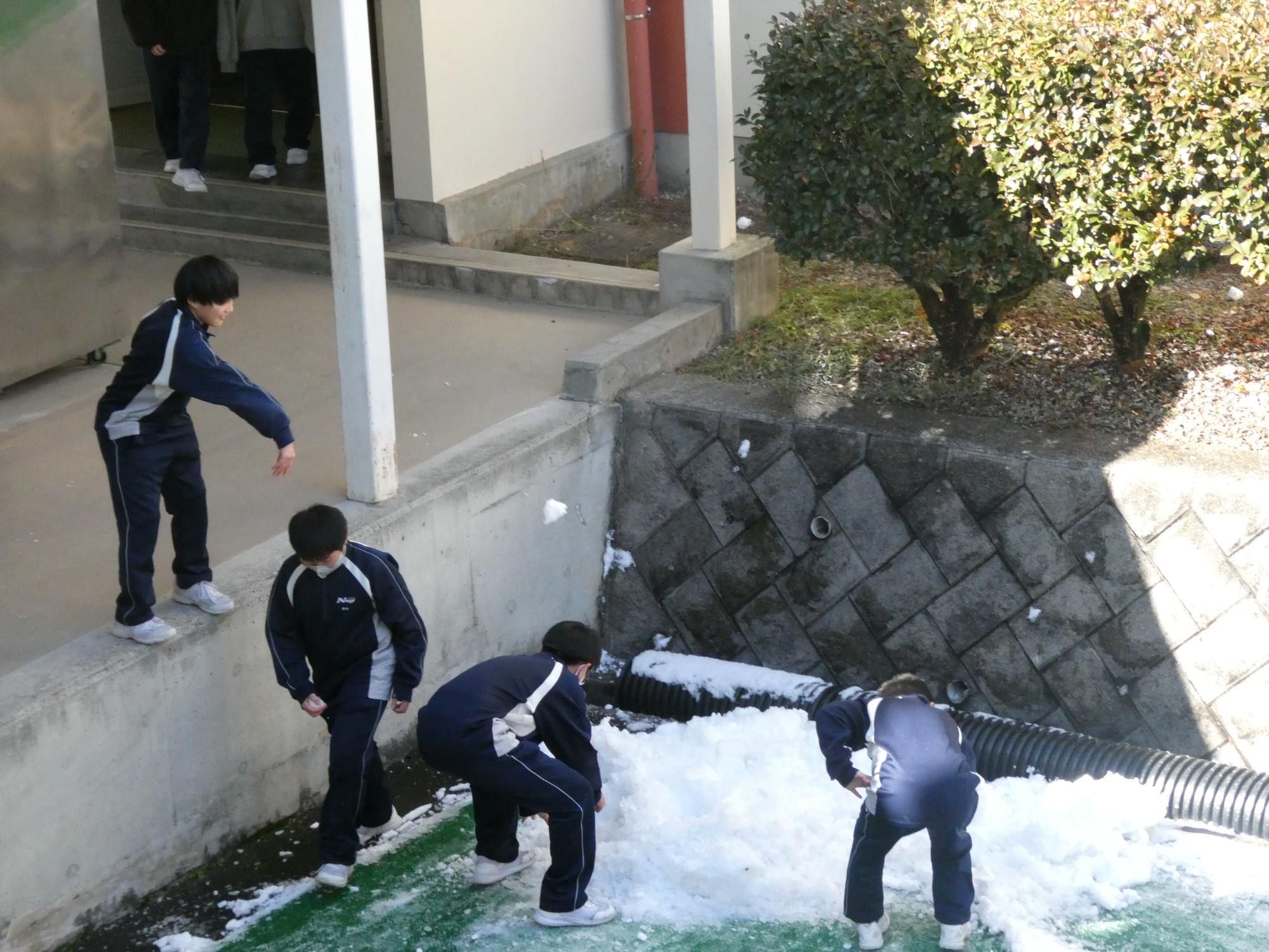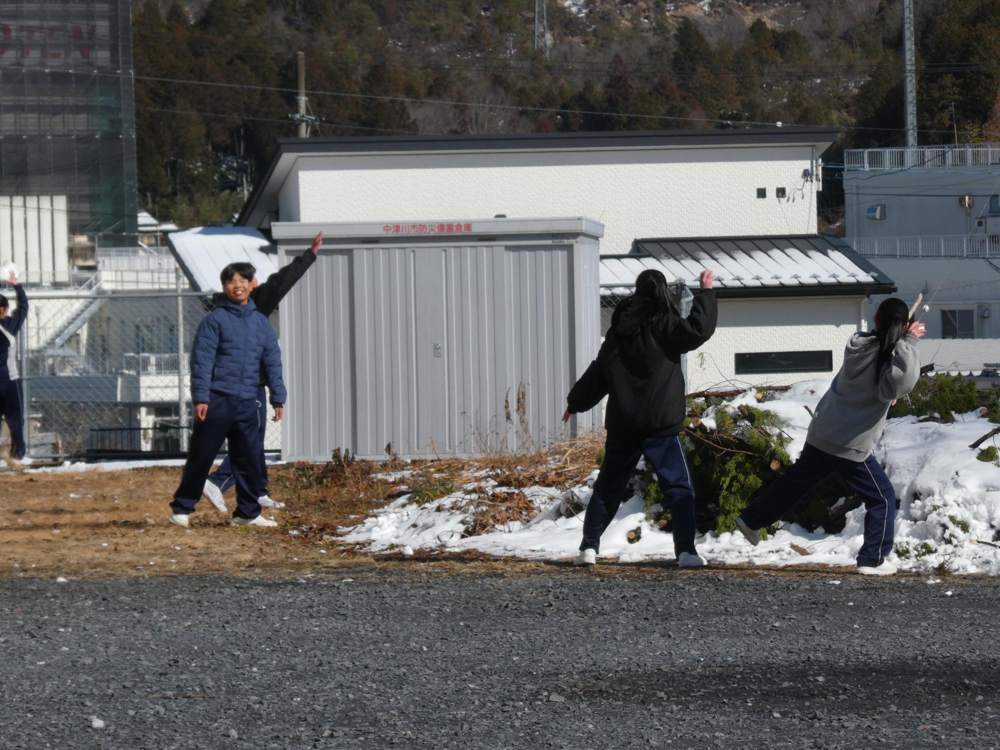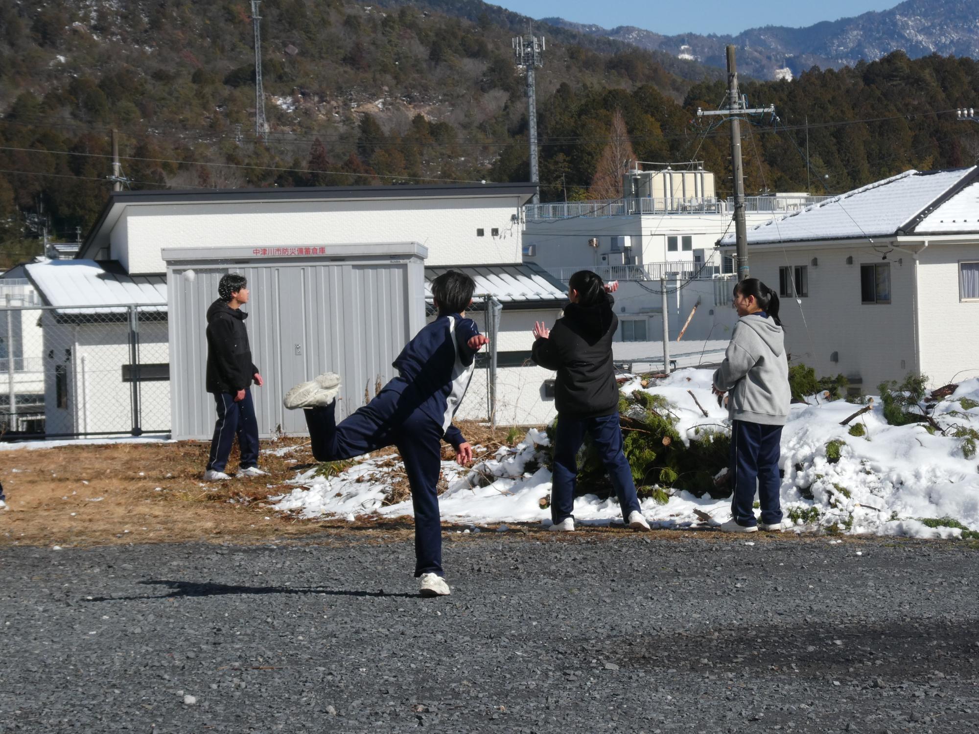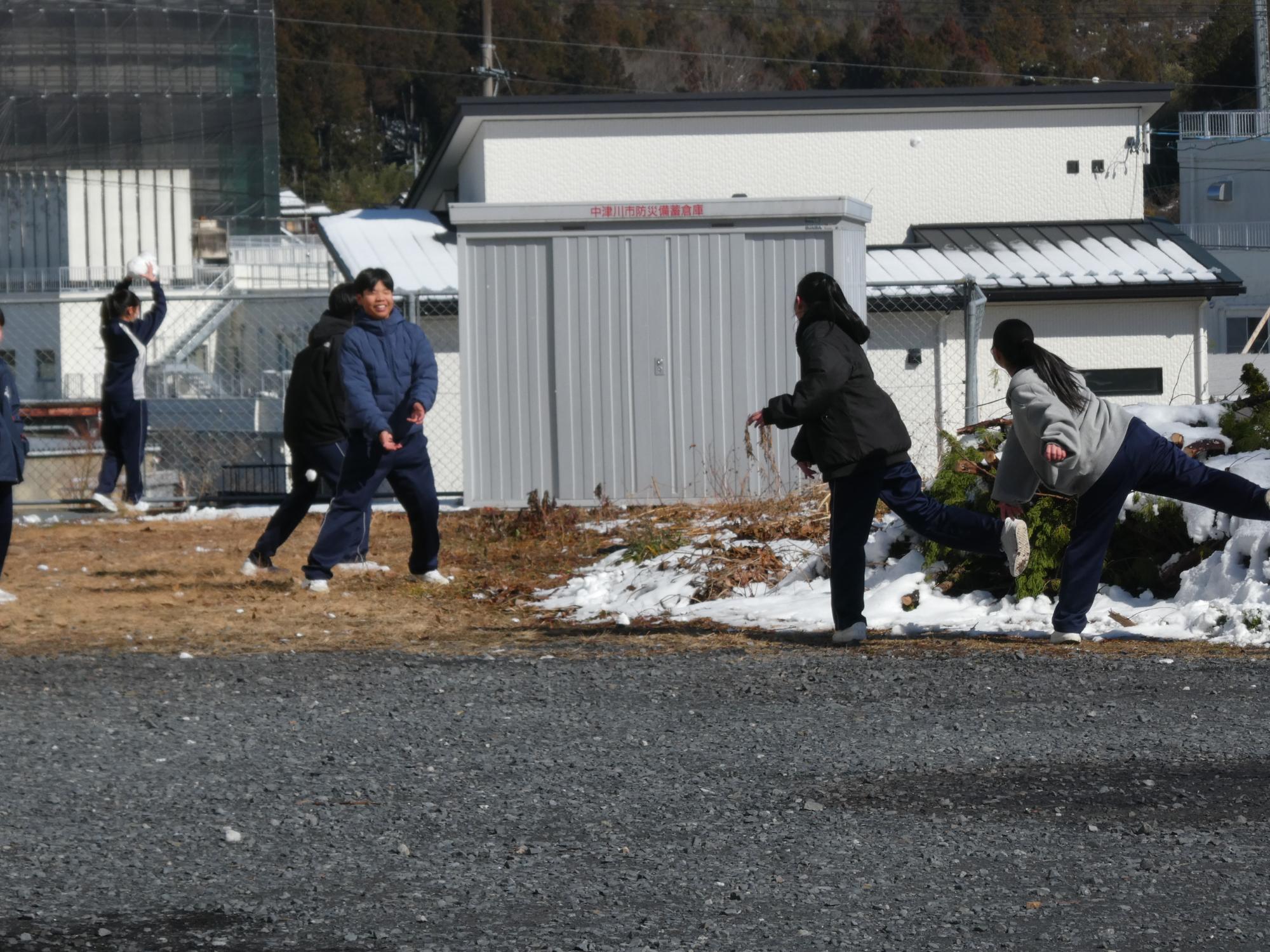 体育館とグラウンドの間の駐車場では、1年生が雪合戦