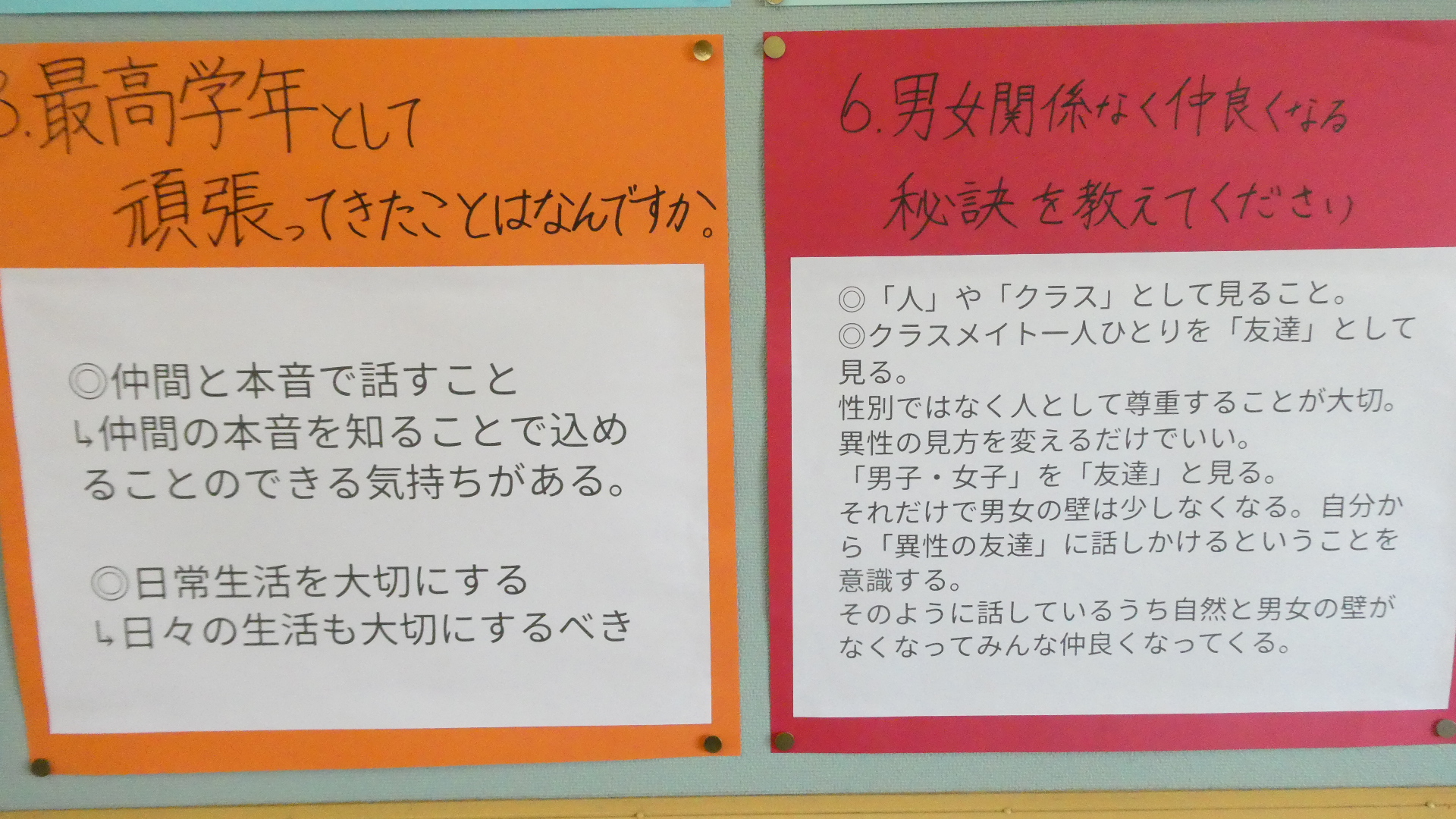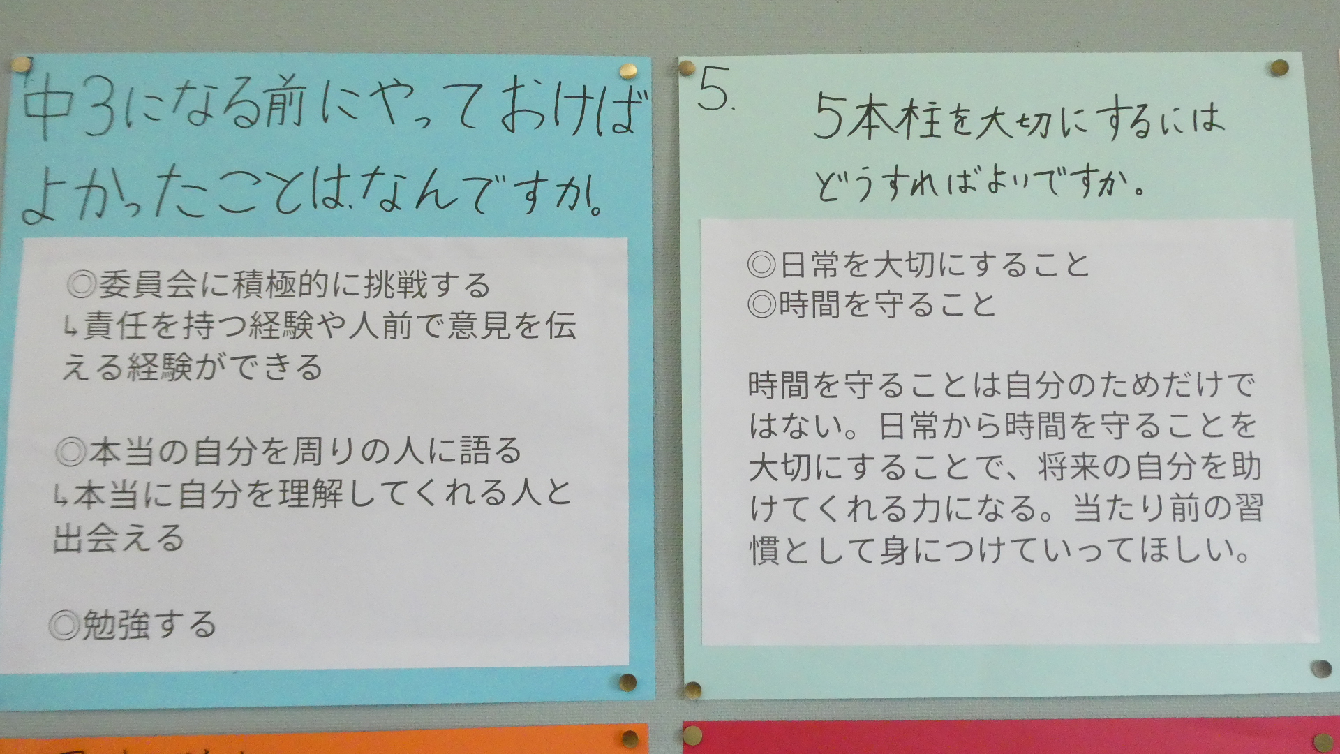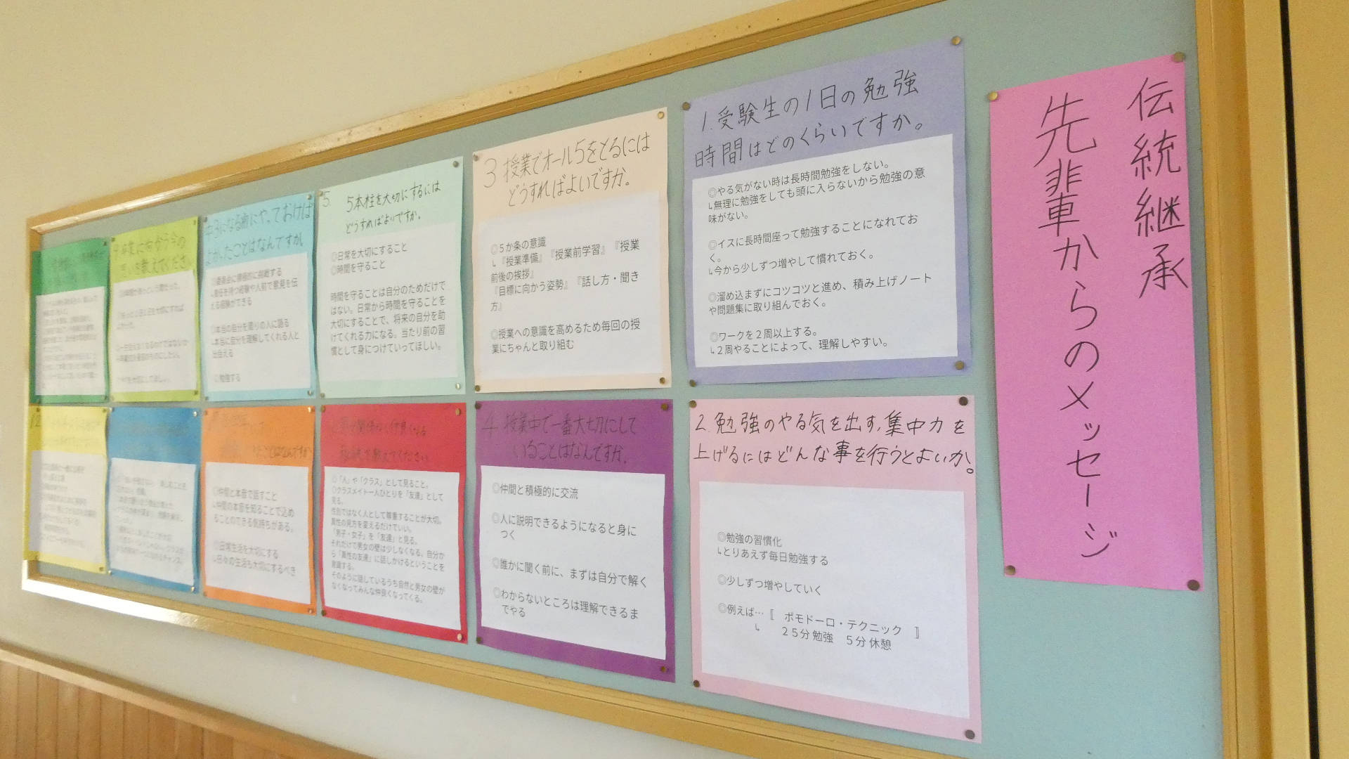 3月18日「3年生からのメッセージ」 更新日:2026年03月31日 2月末に行われた「伝統を引き継ぐ会」で、在校生からの質問に3年生が答えた。 それを聞いて、聞きっぱなしでは、伝統を引き継ぐことにならない。自分たちの生活や学校づくりに活かしてこそ、引き継いだことになる。 2年生の進級プロジェクトの、継承プロジェクトチームが、あの日語った3年生の言葉を文字にして、廊下に掲示しました。