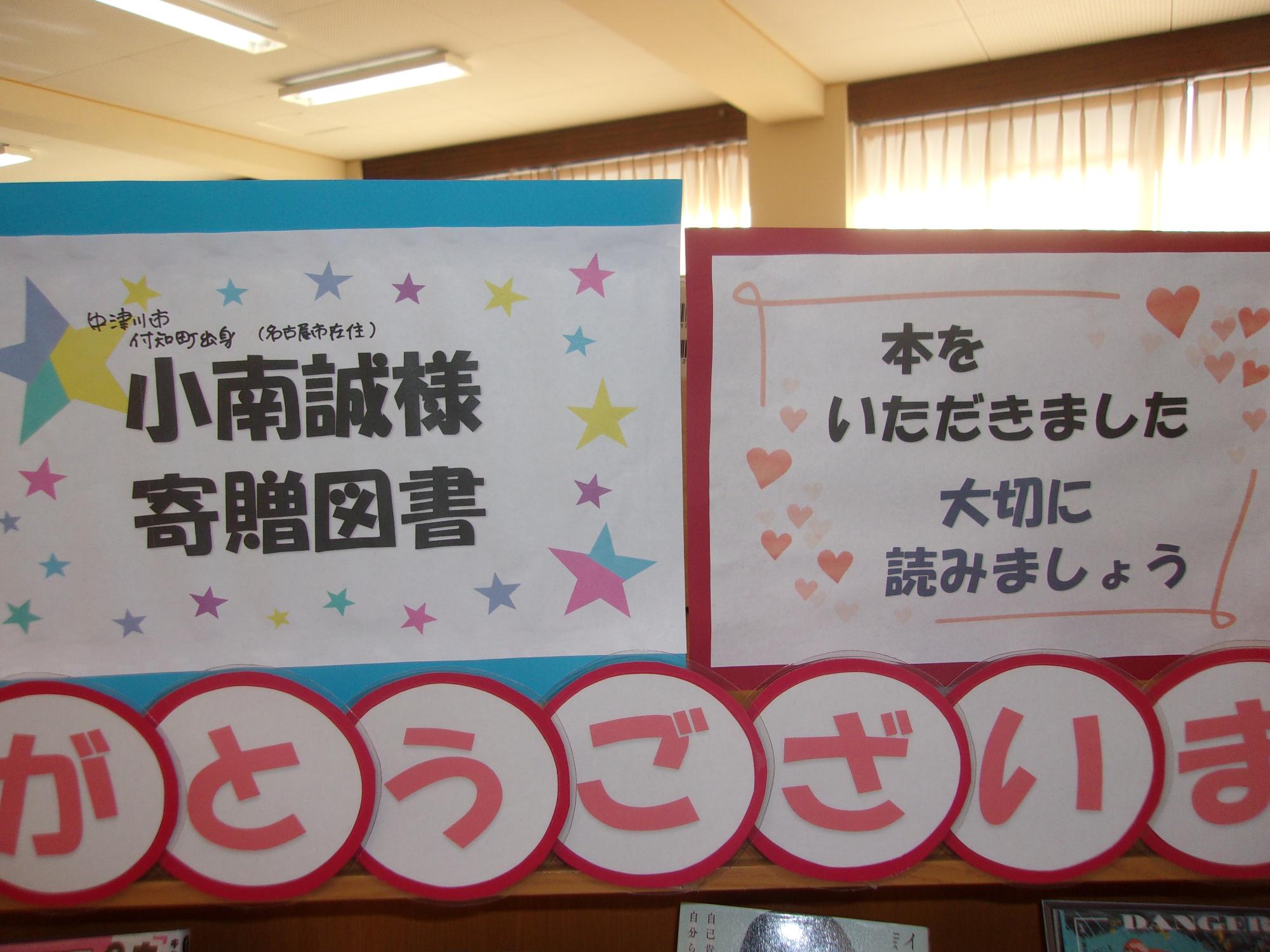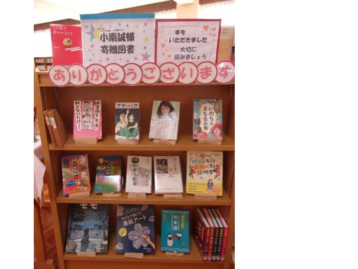 感謝の気持ちを、小南様からの図書寄贈コーナーの設置と、お手紙、そして、このホームページでのご紹介で、表したいと思います。