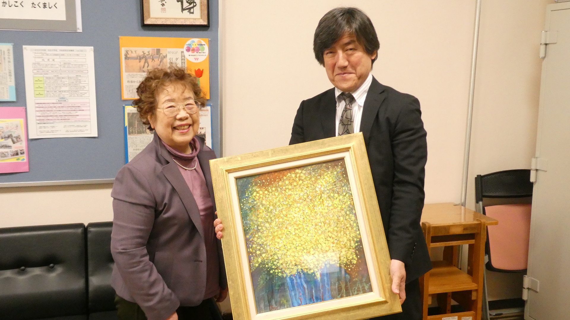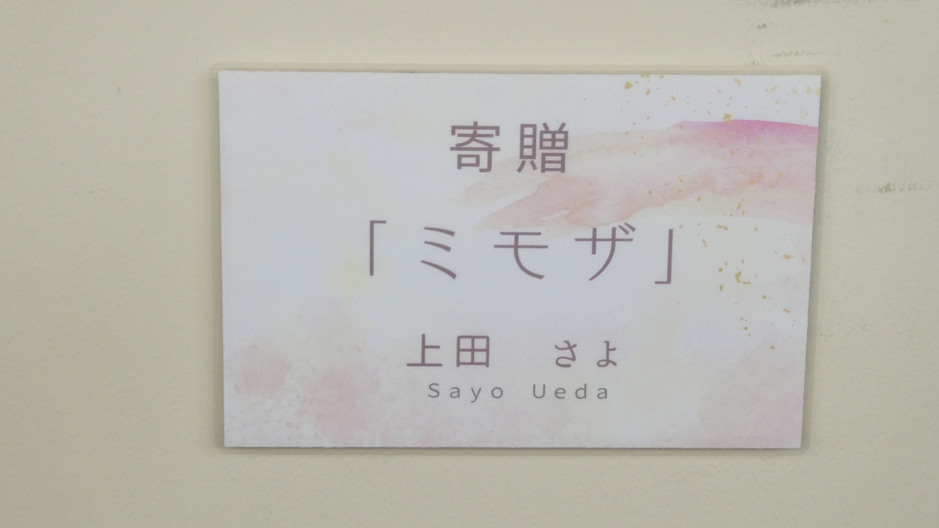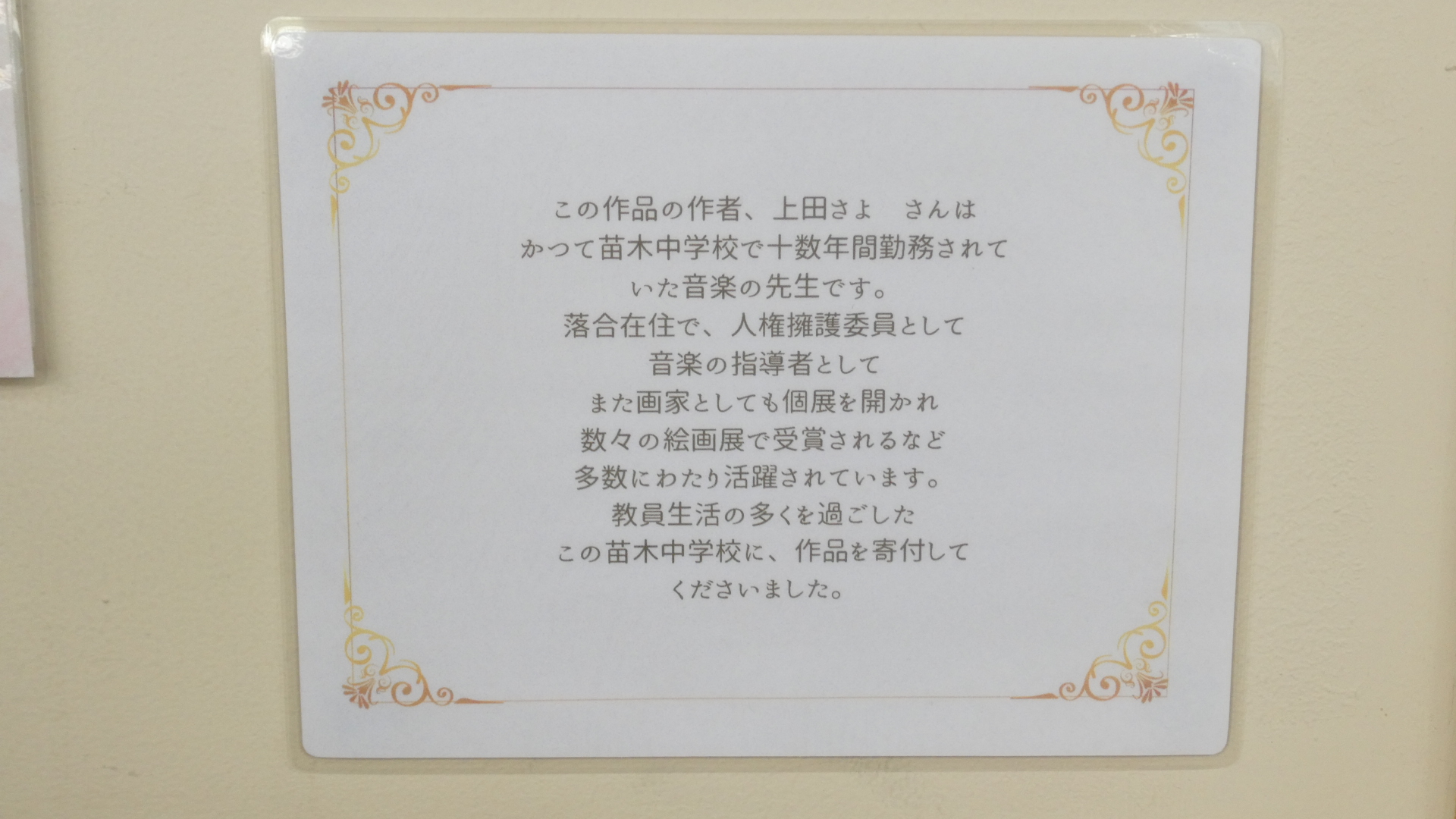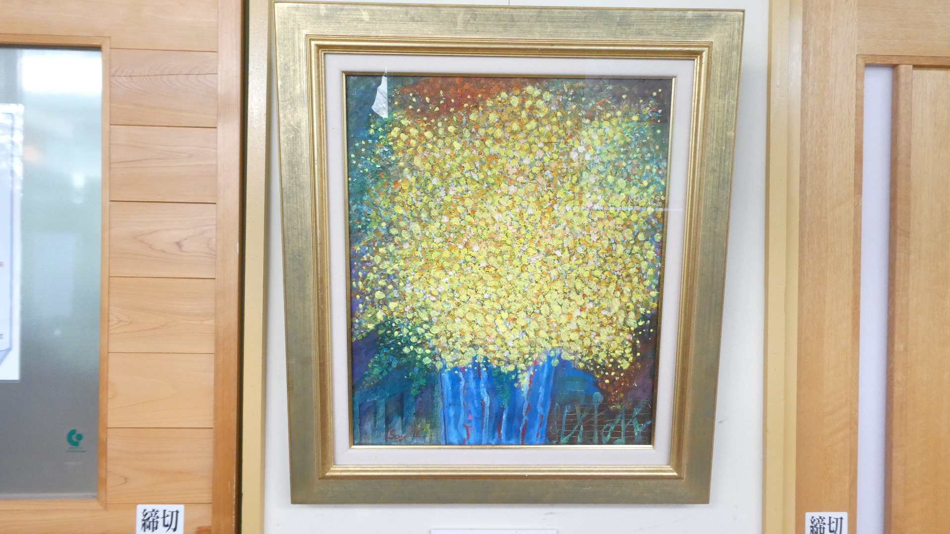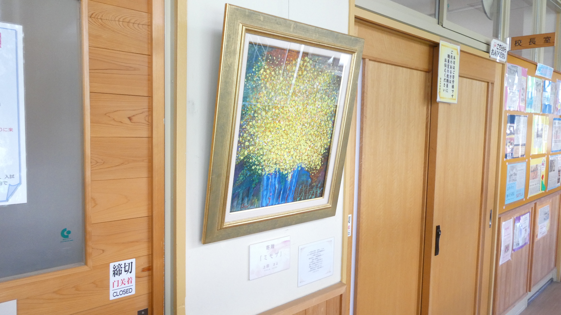 三点の素敵な絵の中で、明るくてきれいな、この「ミモザ」の絵を選ばせていただきました。個展を開かれ、様々な展覧会でも受賞されているさよ先生ですから、結構な価格が付くのでしょうが、あえて苗木中に寄贈をしてくださいました。