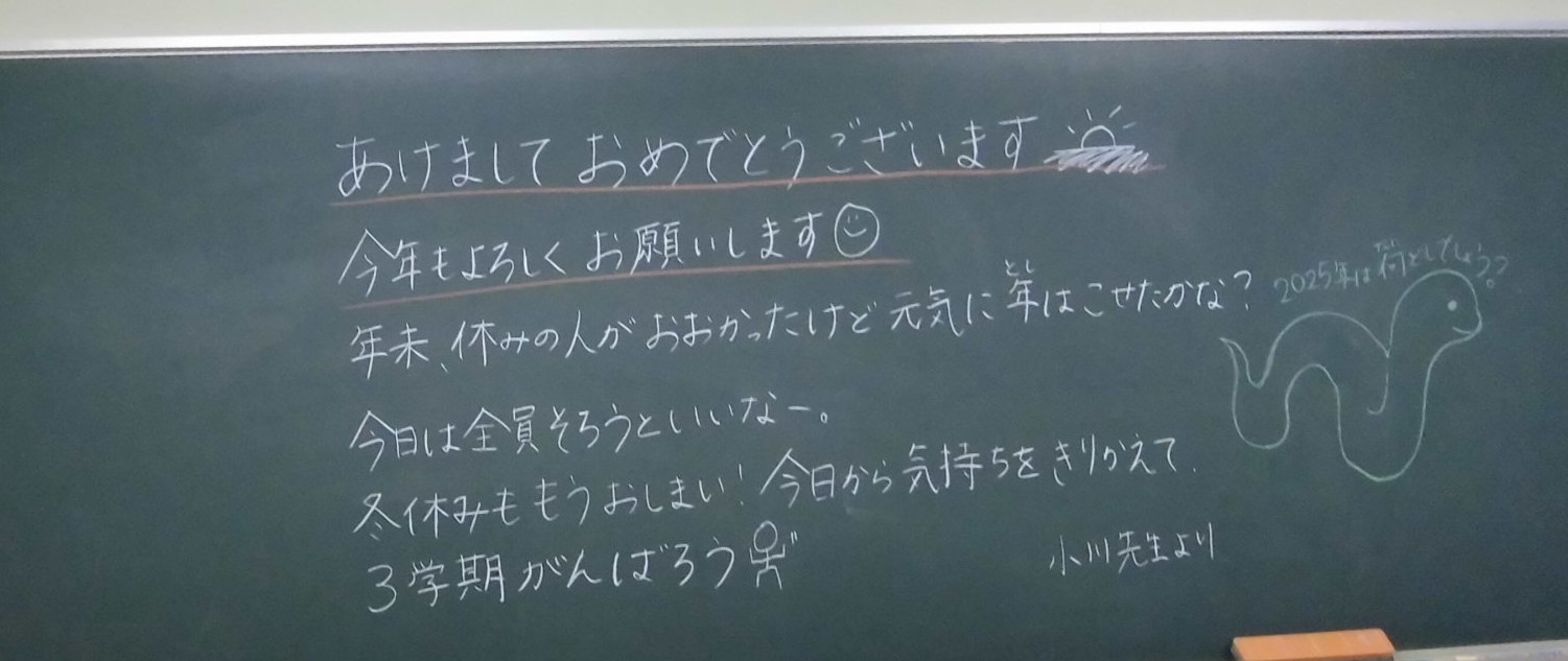 1月8日(水曜日)、冬休み明けの学校には、子どもたちの元気な声が響いていました。冬休み明け集会の校長先生のお話では、「成功」の反対は「チャレンジしないこと」だから、三つのこと(「学校スイッチon」「チクチク言葉・行動0」「さきがけあいさつ」)を意識して頑張ってほしいと激励をもらいました。その後の学級活動では、「冬休みに楽しかったこと」や「2025年にがんばりたいこと」をクラスの仲間と交流しました。笑顔で照れくさそうに話す姿がとても初々しく、素敵な1年のスタートをきることができました。