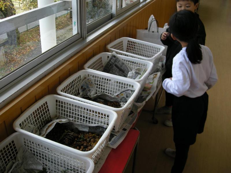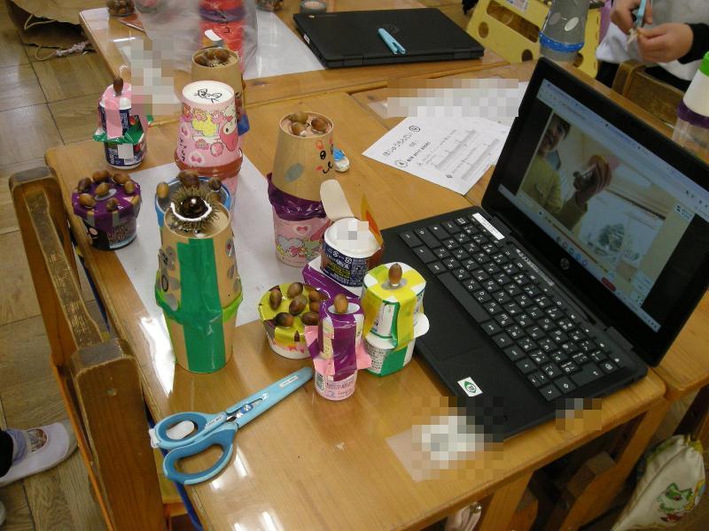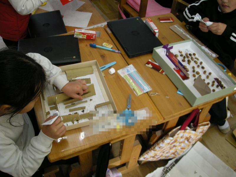 11月21日 1年生生活科「あきのおもちゃづくり」 更新日:2025年11月25日 1年生が生活科の授業で「あきのおもちゃづくり」を行いました。家から持ってきた箱や1年生みんなで拾いに行ったどんぐりを組み合わせて、グループで協力しながらオリジナルのおもちゃをつくることができました。