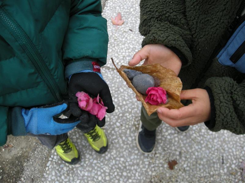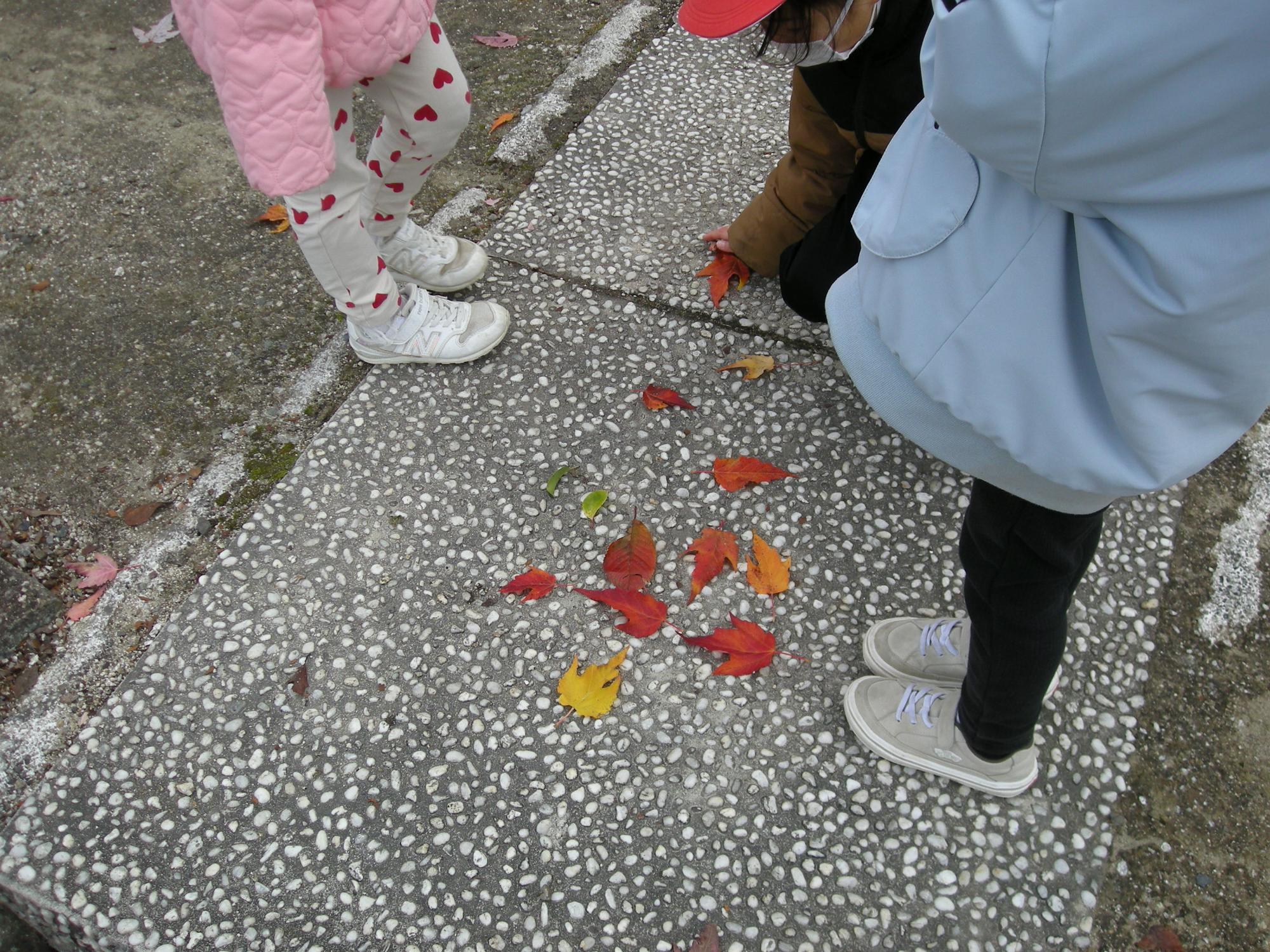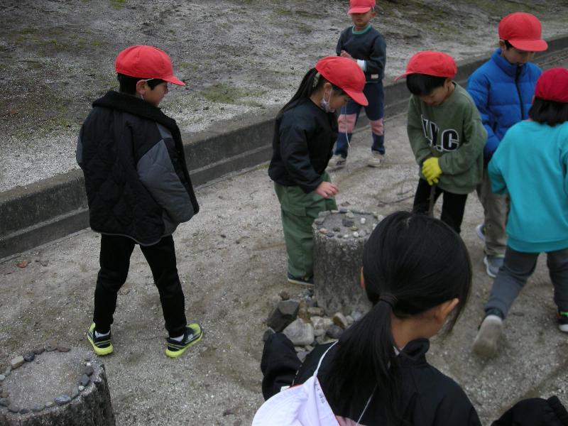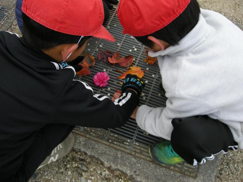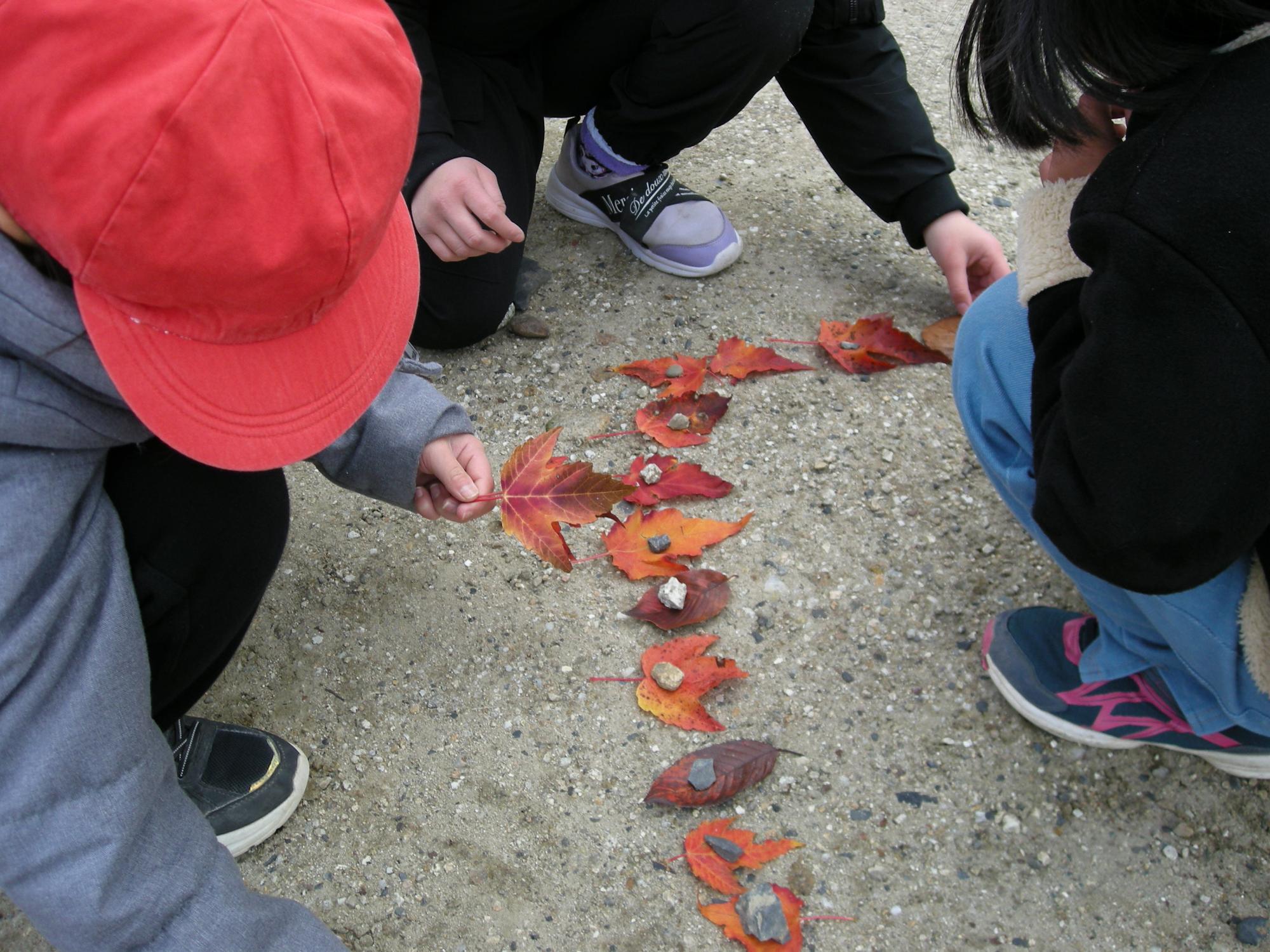 12月5日 1年生生活科「あきからふゆにむかうこうえん」 更新日:2025年12月05日 今年度2回目の本町公園の訪問です。6月の暑い時期に夏の公園の様子を見学しましたが、今日は寒くなってきたこの時期の本町公園がどう変化したのかを確かめたり、公園内の落ち葉や石を並べたりつないだりしながら、仲間と協力して作品づくりを行いました。