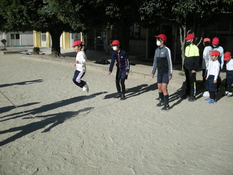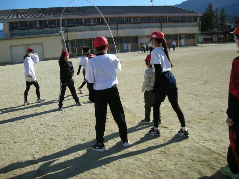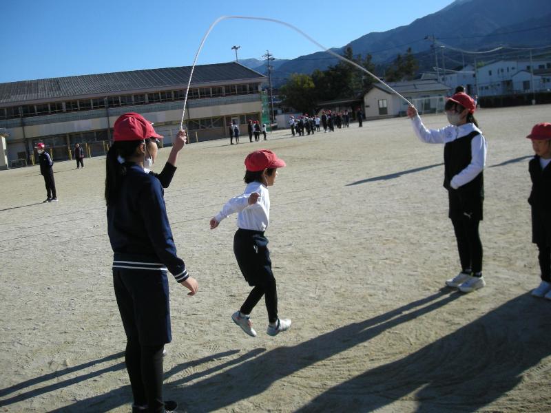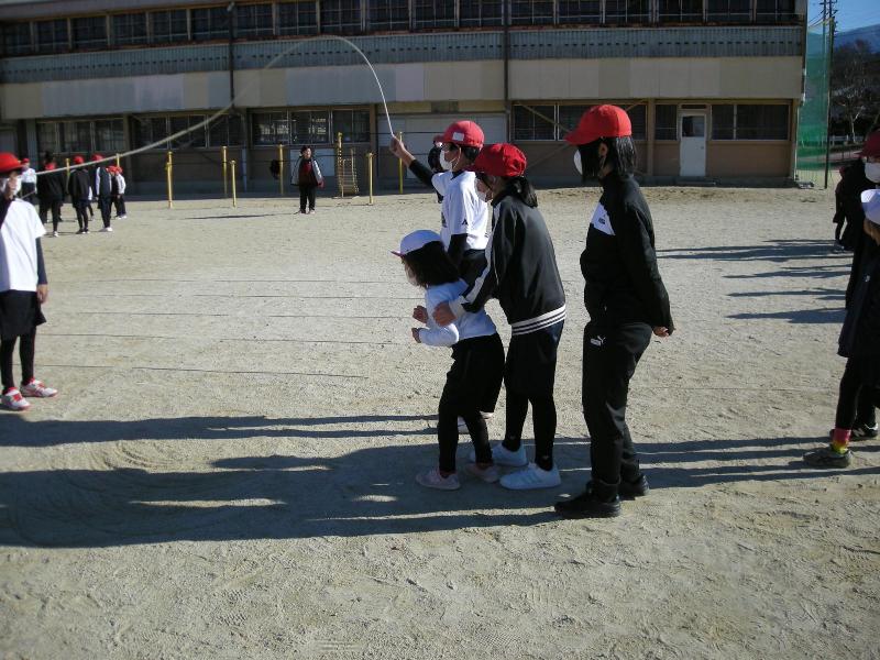 12月12日 1年生、6年生から大縄跳びを学ぶ 更新日:2025年12月12日 2時間目に6年生から大繩の跳び方を教えてもらいました。8の字跳びの入るタイミングが1年生にとっては難しかったですが、6年生が入るタイミングをはかる声をかけたり、背中をそっと押したりしていました。