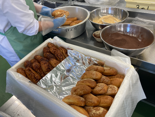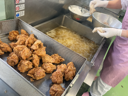 本校のおいしい給食は4人の調理員さんが作ってくださっています。仕事内容は4人でローテーションしながら、7時半ごろに業者から食材を受け取ることから始まります。その後、野菜や肉類を切ったり、焼いたり、煮込んだりの調理します。午後からは片付けをするなど大変な仕事を毎日やってくださっています。調理員さんたちにやりがいを聞くと、「給食が好きで食べてくれることがいい」や「食缶が空だと嬉しい」などとおっしゃっていました。