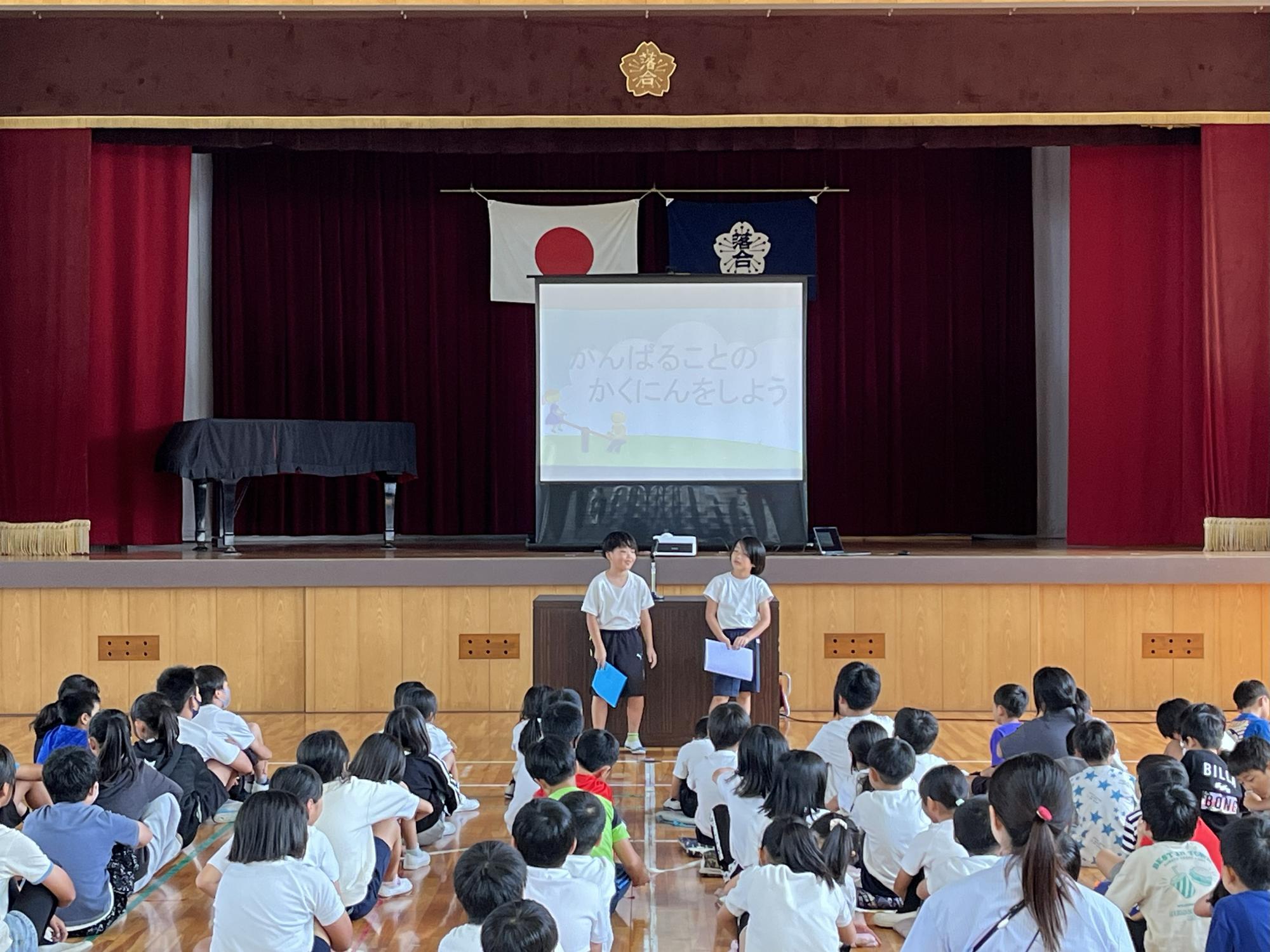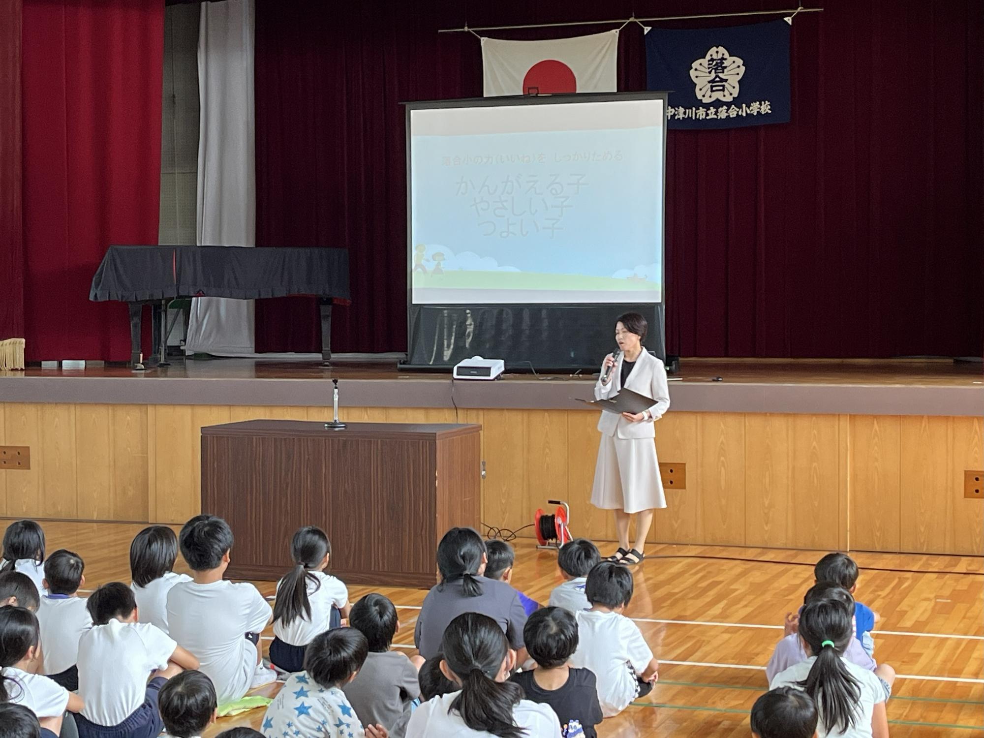 学校長の話では、前期の振り返り児童アンケートの結果発表がありました。落合小学校の学校教育目標の具現に向けて取り組んでいることの達成度を確認し合いました。どの取組も「できている・時々できている」割合が8割以上(全校児童数で100人以上)で途中経過としてはまずまずでした。学年ごとの特徴として、1年生は「体を進んで動かす」、2年生は「命を守る行動ができる」、3年生は、「落合の行事に進んで参加」、4年生は「困っている人を助ける」、5年生は「いいね見つけができる」、6年生は「自分の役割が進んでできる」の項目が9割以上の子が「できている」と回答し、各学年での活動の成果が表れていました。