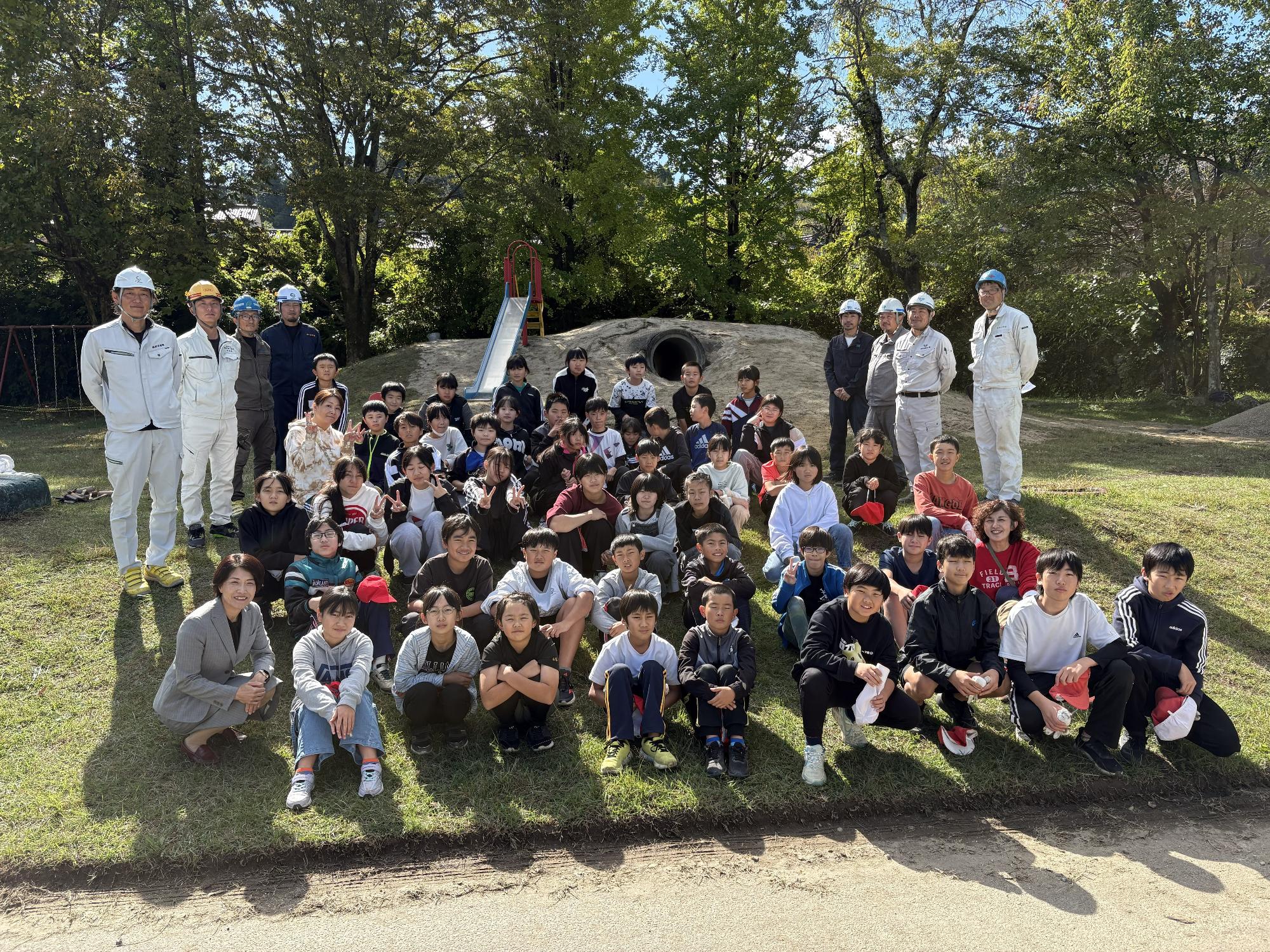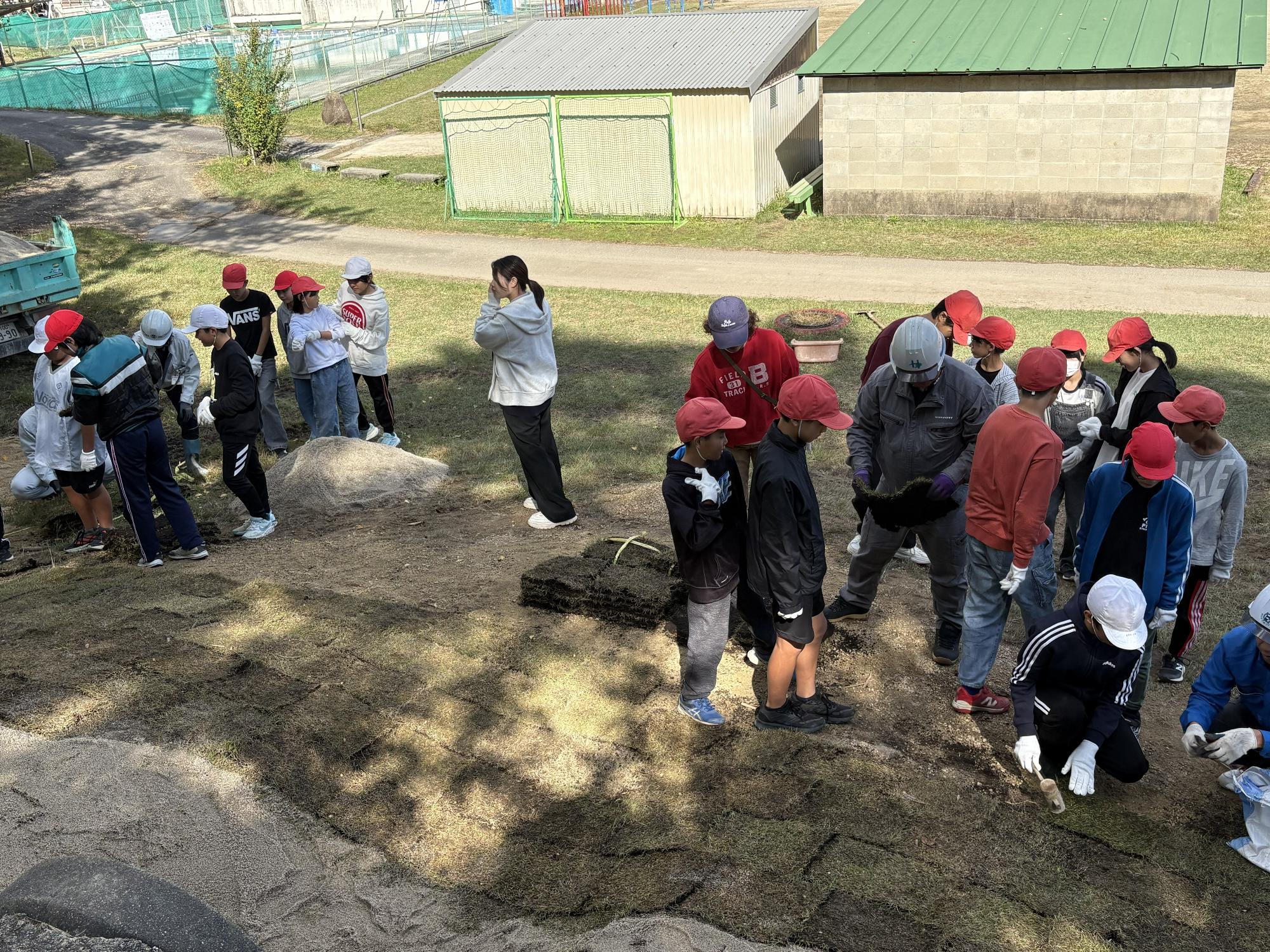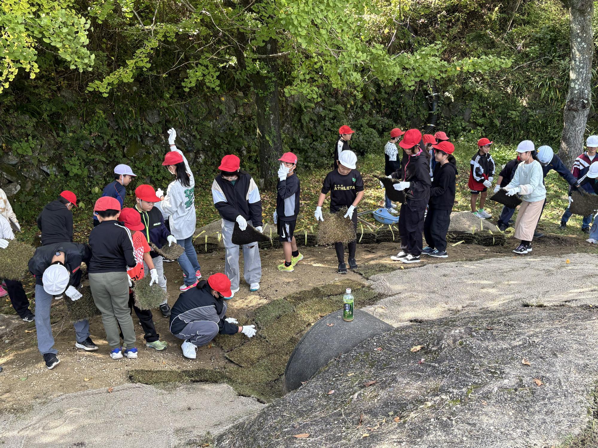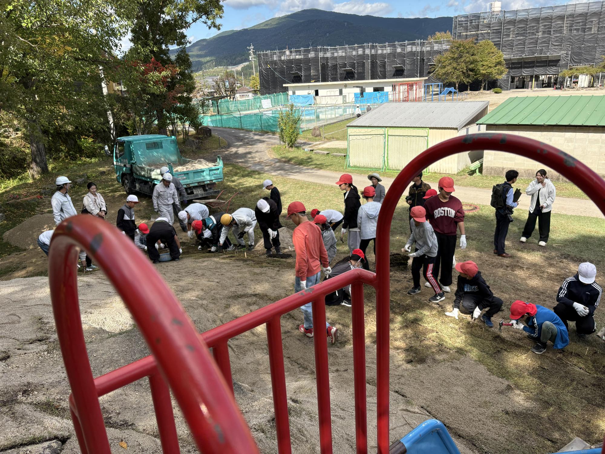 10月27日・28日の二日間、中津川市建設協会青年部による地域貢献事業として、わんぱく広場の「すべり台山」の整地と芝植え改修を行いました。むき出しになっていた石を取り出し整地し、表面を芝で覆いました。仕事体験として芝植え作業を5・6年生が担当しました。芝を地面に隙間なく並べ、ずれないように竹のペグを打ち込み、最後は砂を上から撒いて整えました。芝が根付く来年の春まで「すべり台山」は使用できませんが、緑の芝が映える時期まで楽しみに待ちたいです。