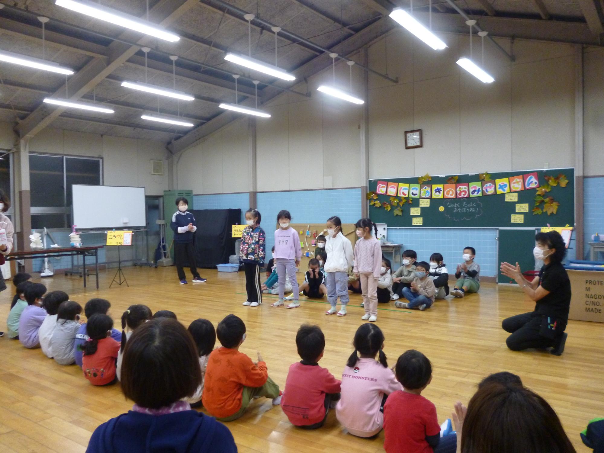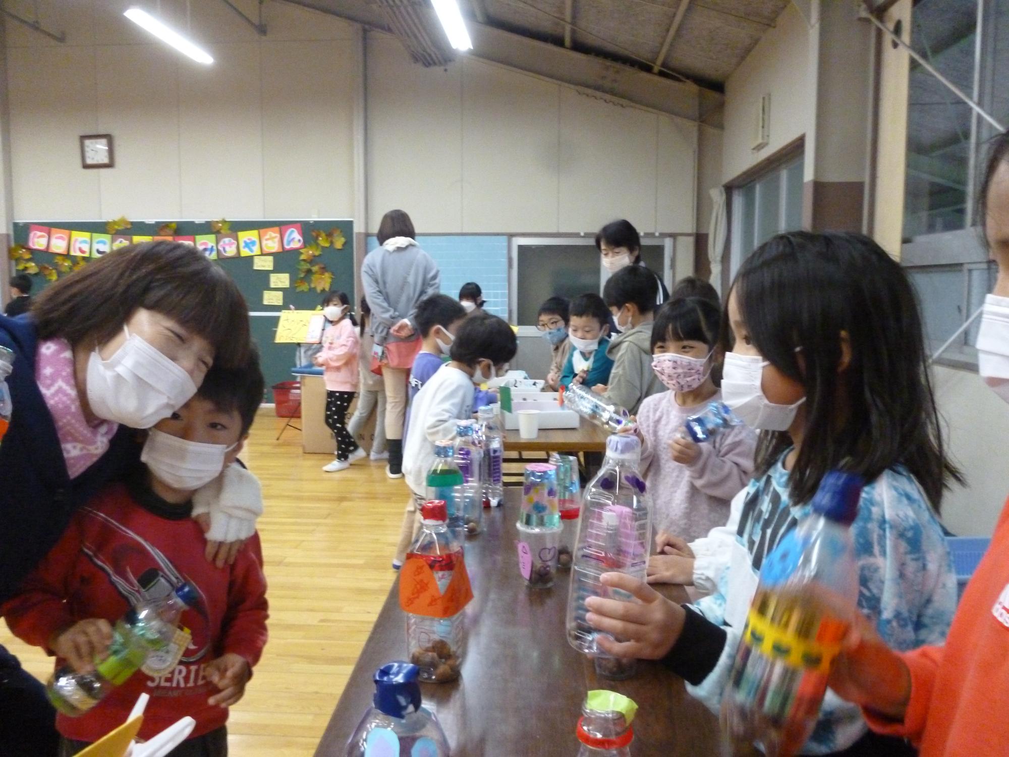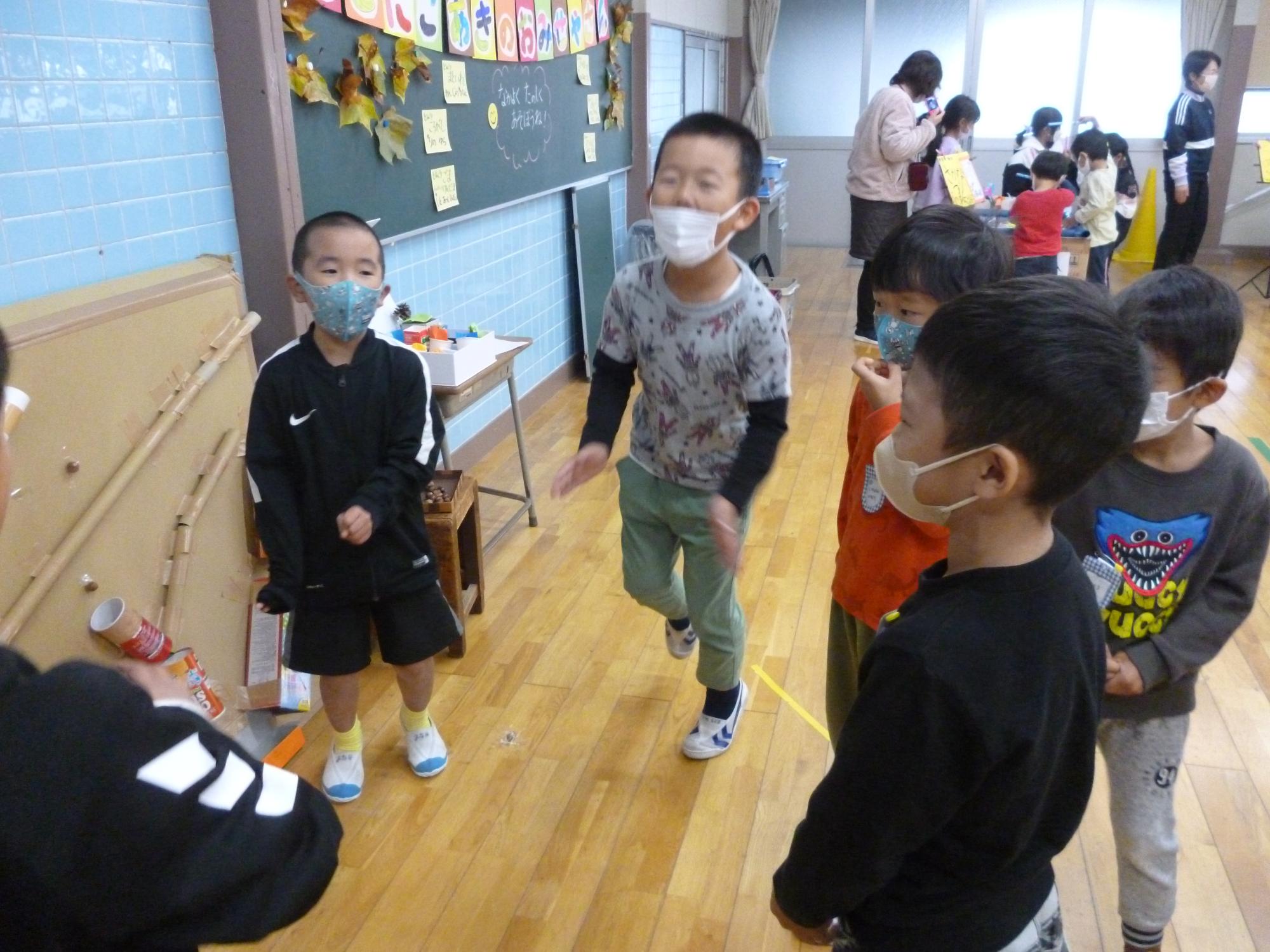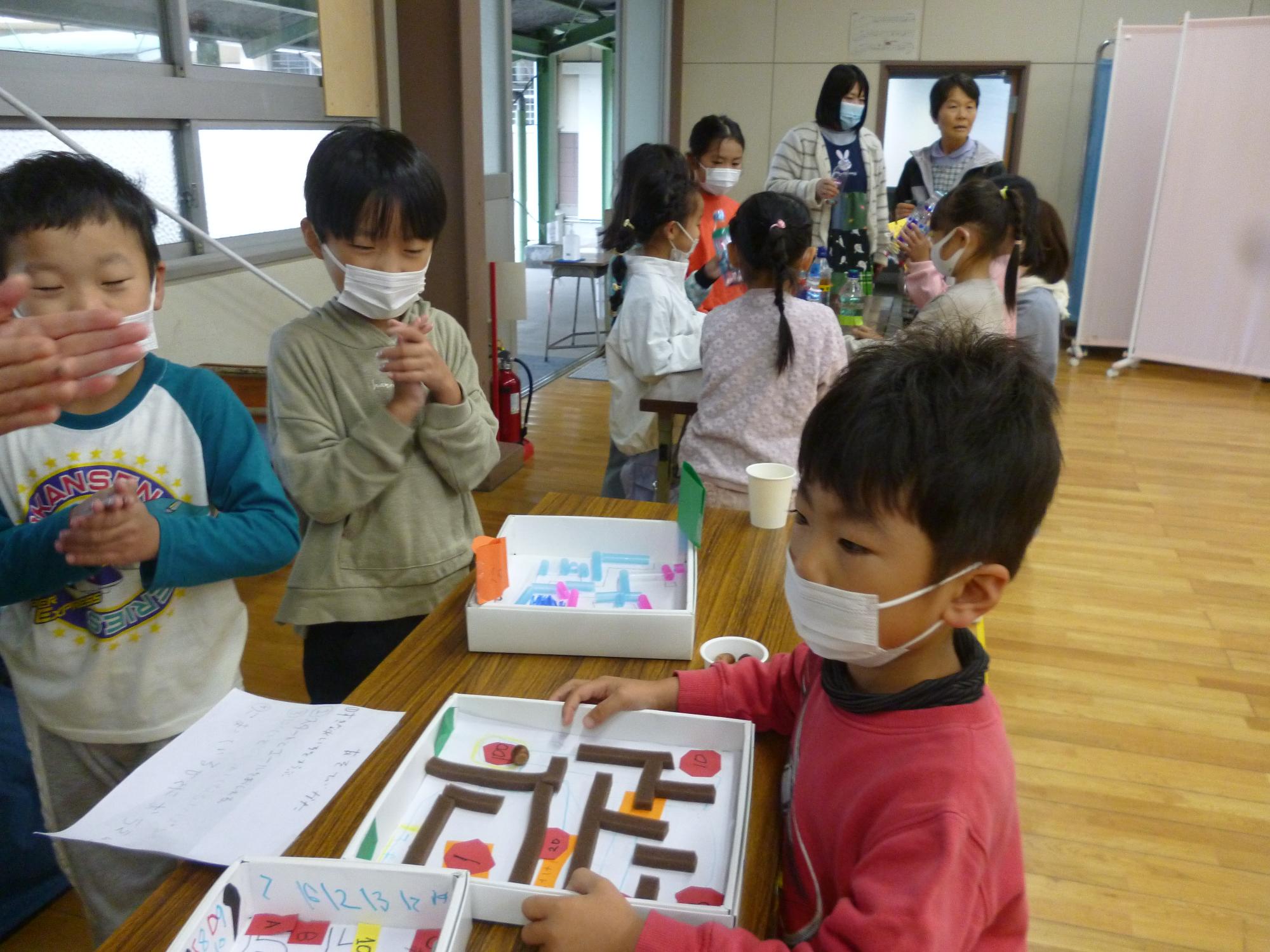 生活科の学習で「あきみつけ」をした後、秋の木の実などを使って楽しく遊べるおもちゃを作りました。みんなで作ったおもちゃで、楽しく遊べる「にこにこあきのおみせやさん」をオープンさせることにしました。落合・神坂こども園の園児さんたちを「お客さん」としてご招待。どんぐりごまや、松ぼっくりの剣玉。どんぐり迷路におなもみの魚つりなど。6つの「お店屋さん」で、楽しく遊んでもらいました。遊び方を教えたり、「すごいね」と園児さんたちをほめたりするなど、お兄さん、お姉さんとしてやさしく接する姿がありました。「園児さんたちの笑顔が見たいね」「自分たちも笑顔で楽しみたいね」という願いをもって、1年生のみんなで「お店やさん」を頑張りました。