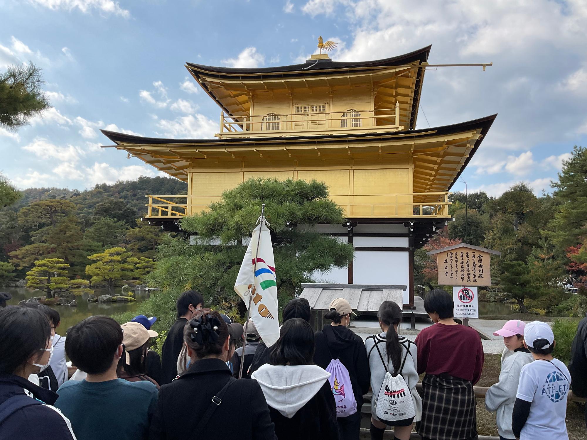 秋の陽の光に照らされ最高に光り輝いている金閣、澄んだ池に逆さに映る銀閣。美しい姿を見て、金閣と銀閣とどちらが好きか話題にしながら見学しました。バスの中では学習係さんが事前学習から考えたクイズを出し、見学に向けて気持ちを高めてくれました。