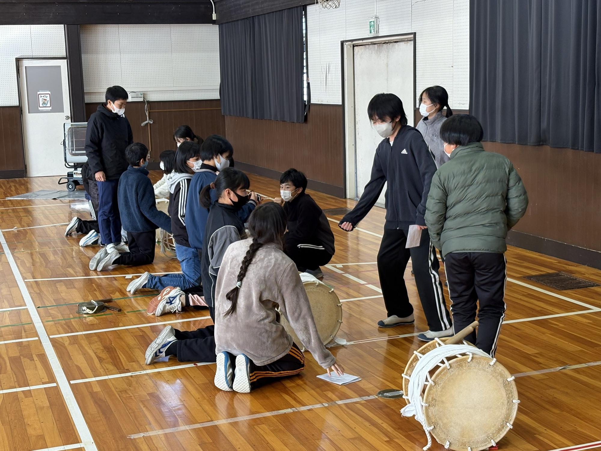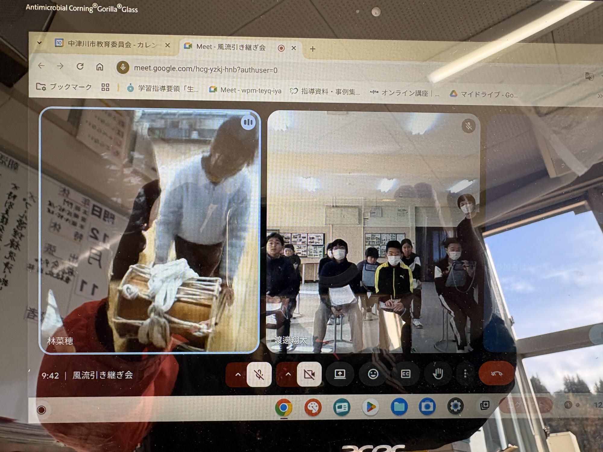 6年生から5年生へ風流の引継ぎ会がありました。今年は、神坂小学校もWebで参加しました。6年生は夏の風流踊りを思い出して太鼓や鐘、笛を使って演奏の難しさ等を伝えました。神坂小学校さんにはWebのため各種太鼓や鐘・笛等の音等当日の迫力とまでいきませんでしたが、練習の様子を伝えました。6年生からは「5・6のタイミングでたたく」「笛の持ち方は・・・」等詳しい引き継ぎがありました。このようにして大切な伝統が受け継がれていきます。久しぶりに校舎に風流の音が響いた時間でした。