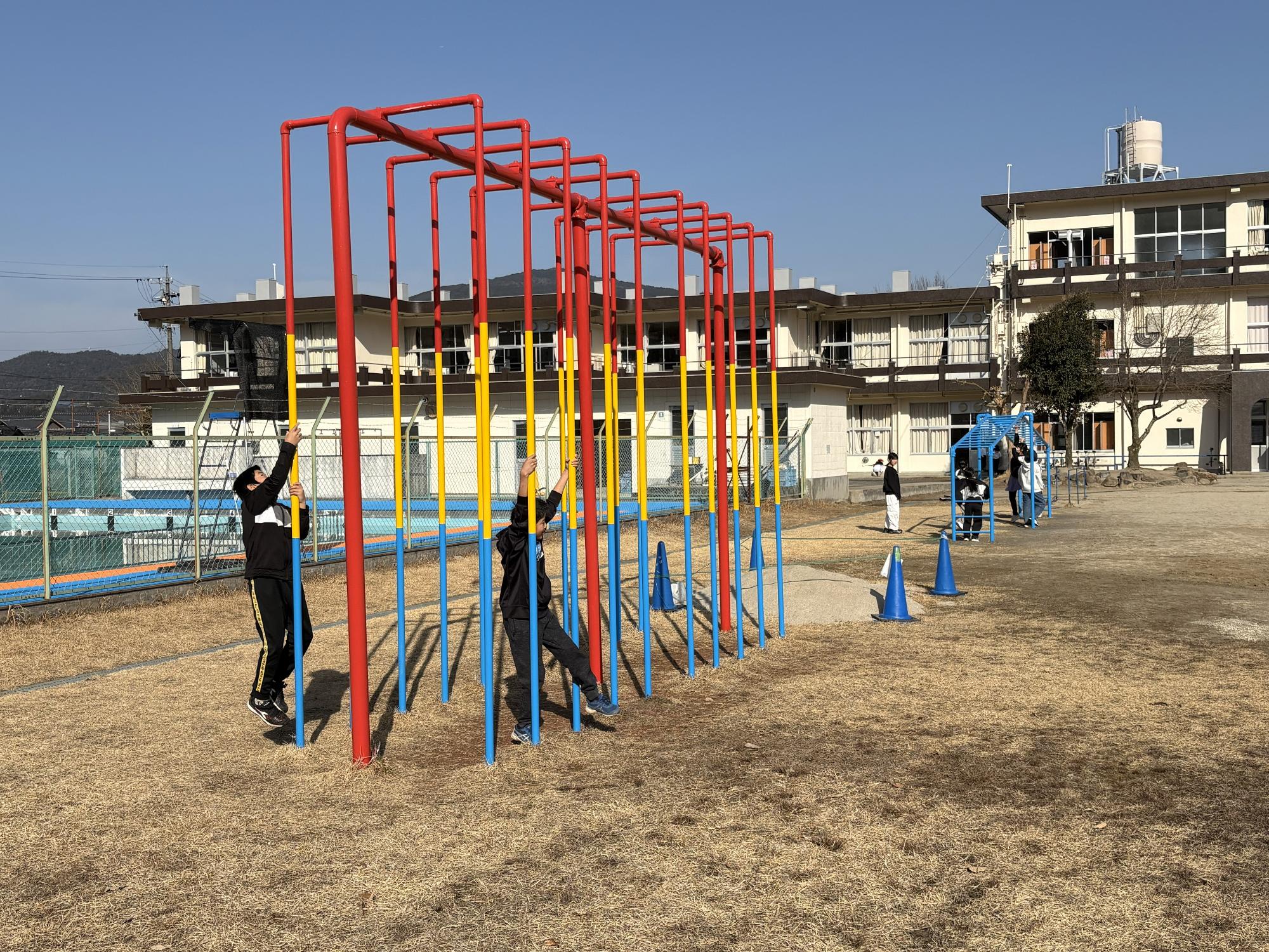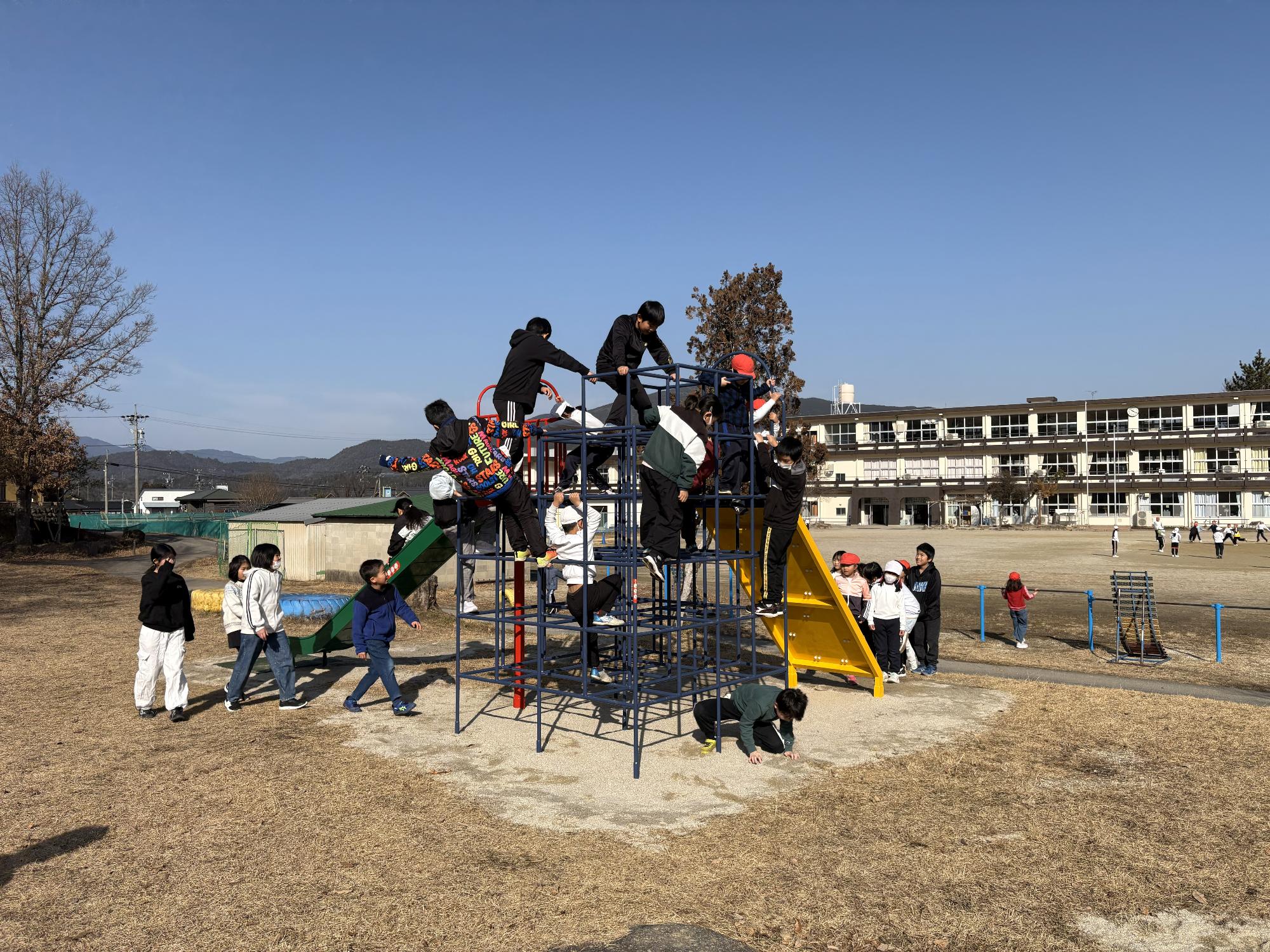 先週行われた「命を守る訓練」後に、安全で楽しく遊べる遊具の使用方法について説明をし、本日1月19日月曜日20分休みから使用となりました。早速ジャングルジムを登り、滑り台を滑り、ボルダリング壁を登り、みんな楽しく遊んでいました。この他の遊具も色を塗り替えたり、補強したりしました。授業参観にこられた折にご覧ください。