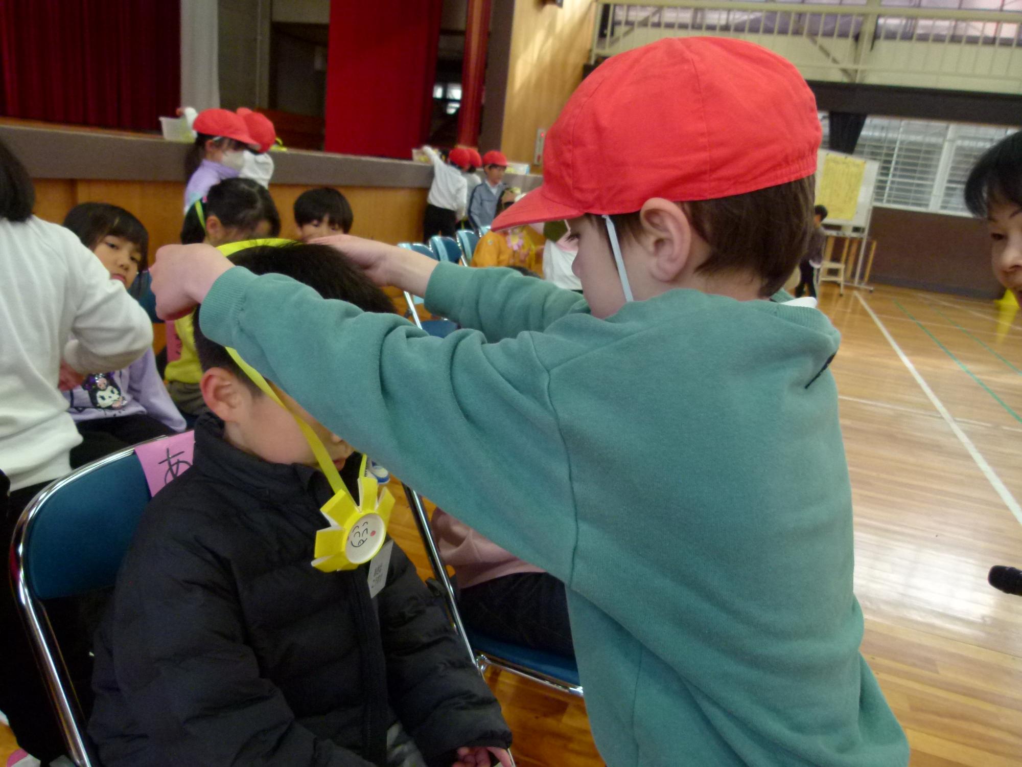 会の締めくくりには、新2年生が心を込めて作った特製メダルの贈呈式が行われました。メダルを首にかけてもらった新1年生の嬉しそうな顔を見て、新2年生もまた、誇らしげな笑顔を見せてくれました。