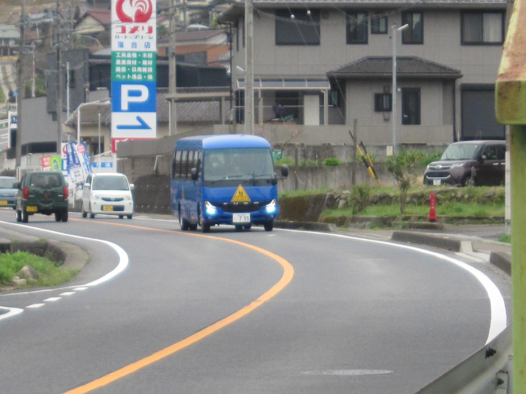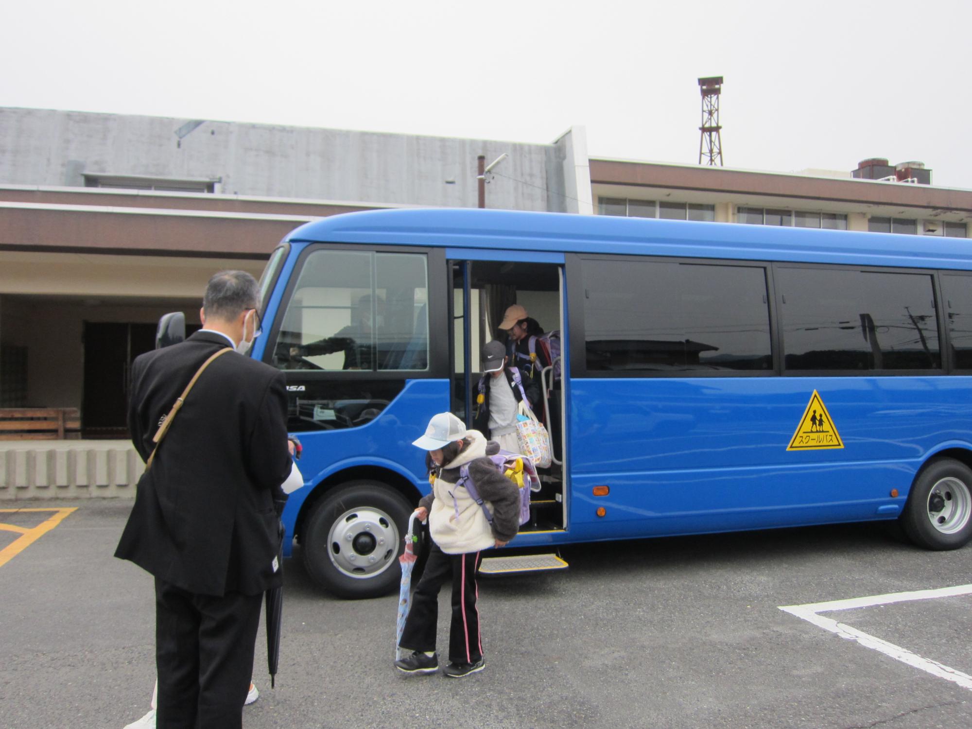 神坂・馬籠地区からスクールバスが落合事務所に到着し、落合小学校へ登校・・・。