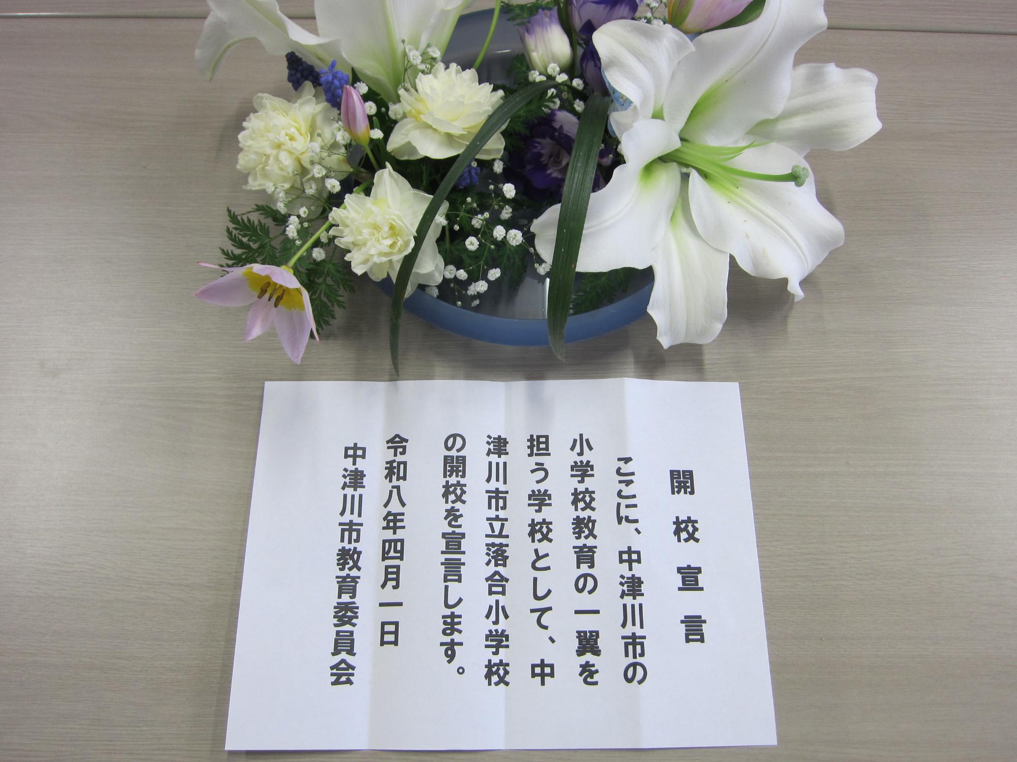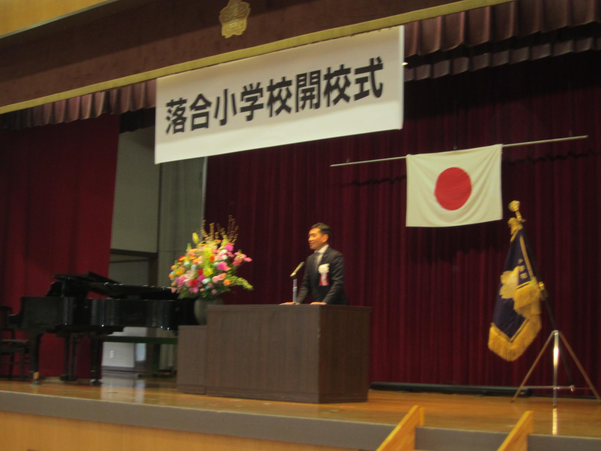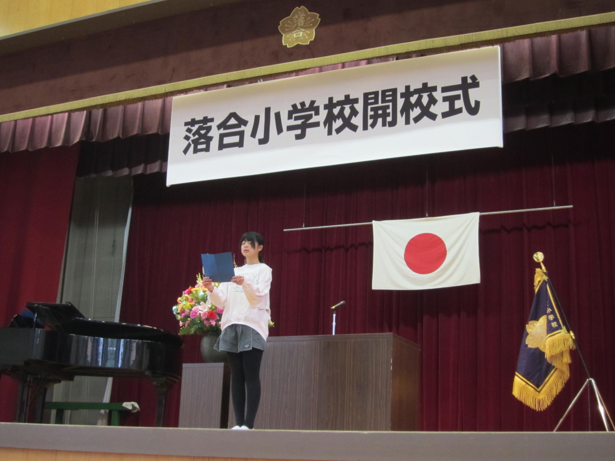 開校式では、教育委員様からの開校宣言、教育長様からの校旗授与、市長様から祝辞を賜りました。続いて児童代表からは、「落合と神坂、それぞれのよい所を一つに合わせ、どこよりも明るく、どこよりも活気のある、素晴らしい学校を築いていくことを、私たち6年生が先頭に立ち、全員が笑顔で過ごせる新しい落合小学校を、今日ここから作り上げて行くことを強く誓います。」という力強い宣言がありました。