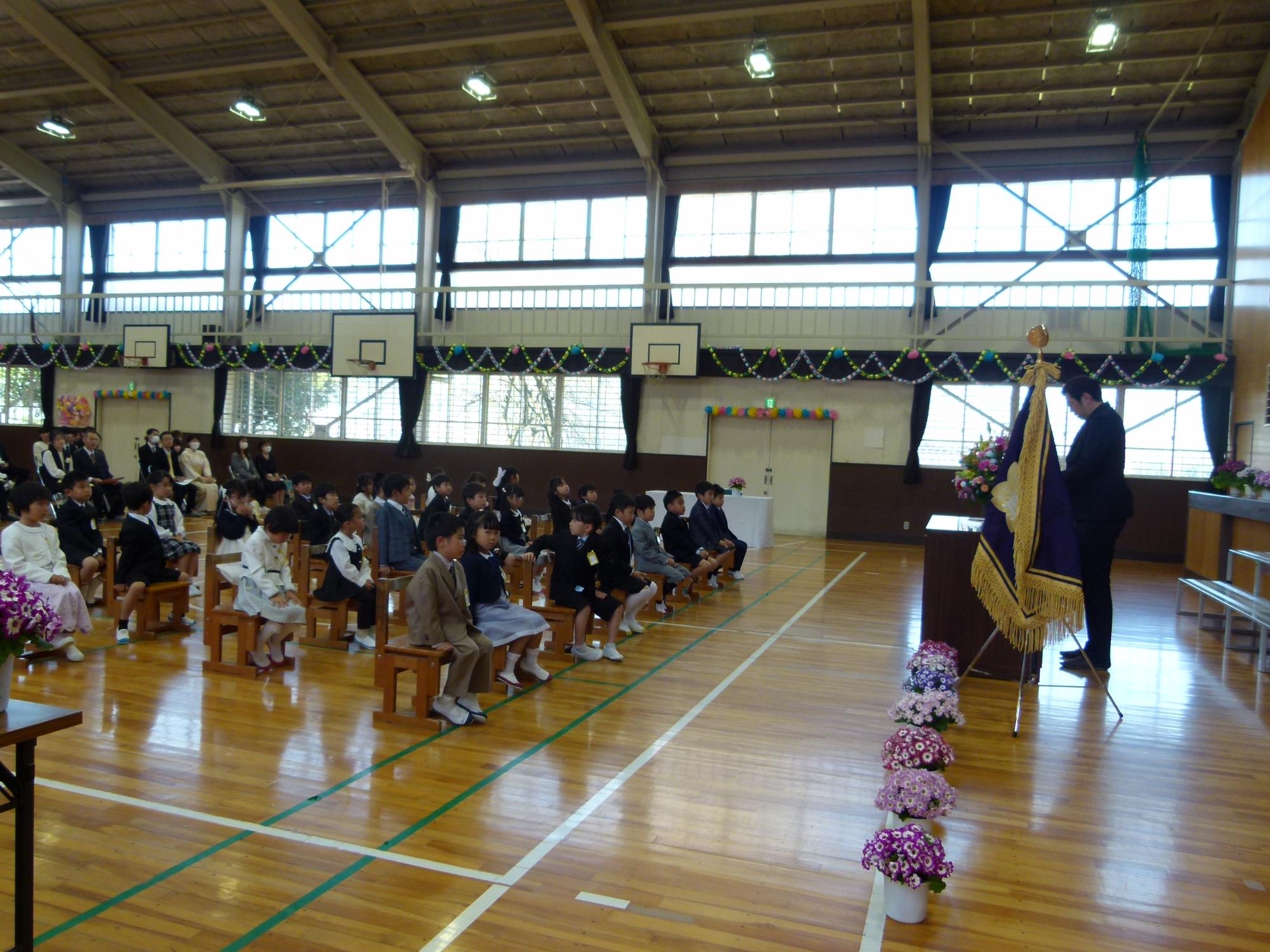 期待に胸を膨らませ、校門をくぐった32名の新入生。 式典では、校長先生やPTA会長様のお話を背筋を伸ばして一生懸命に聞く姿がとても印象的でした。