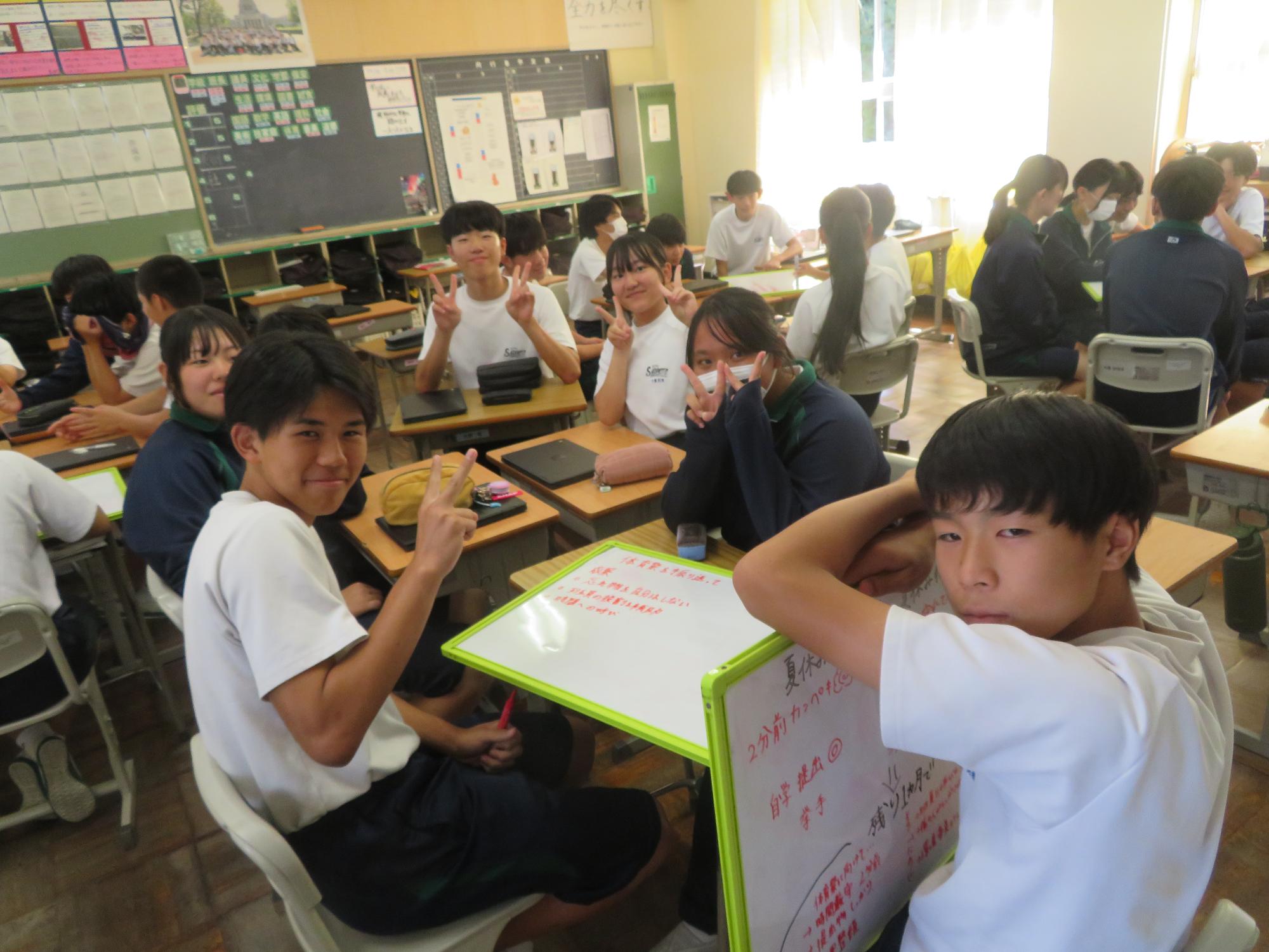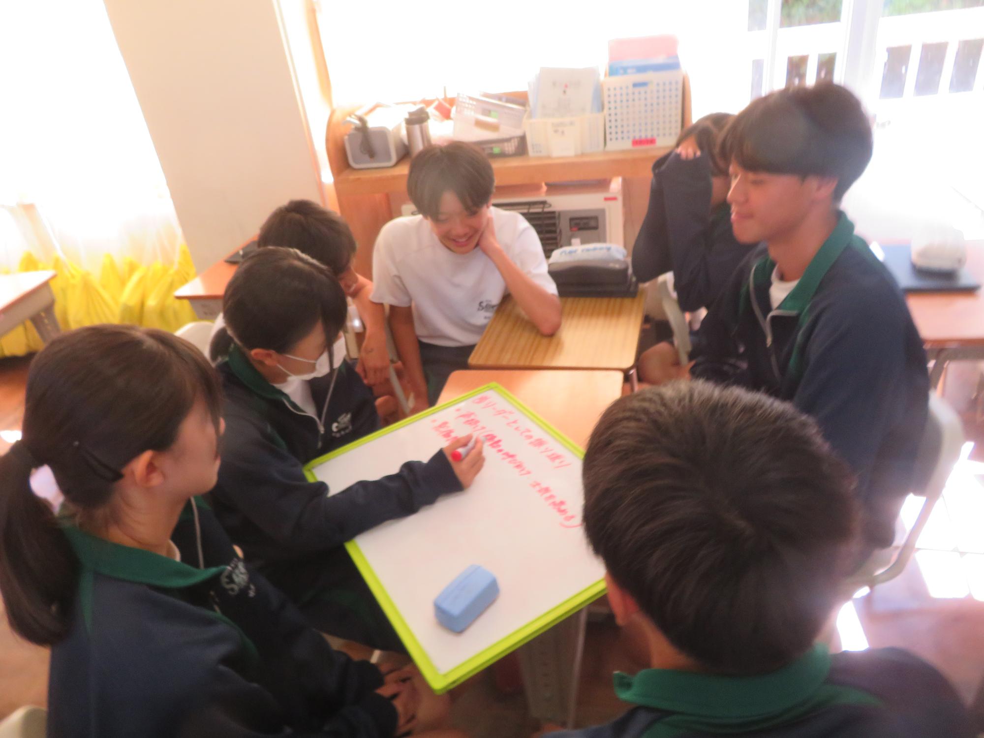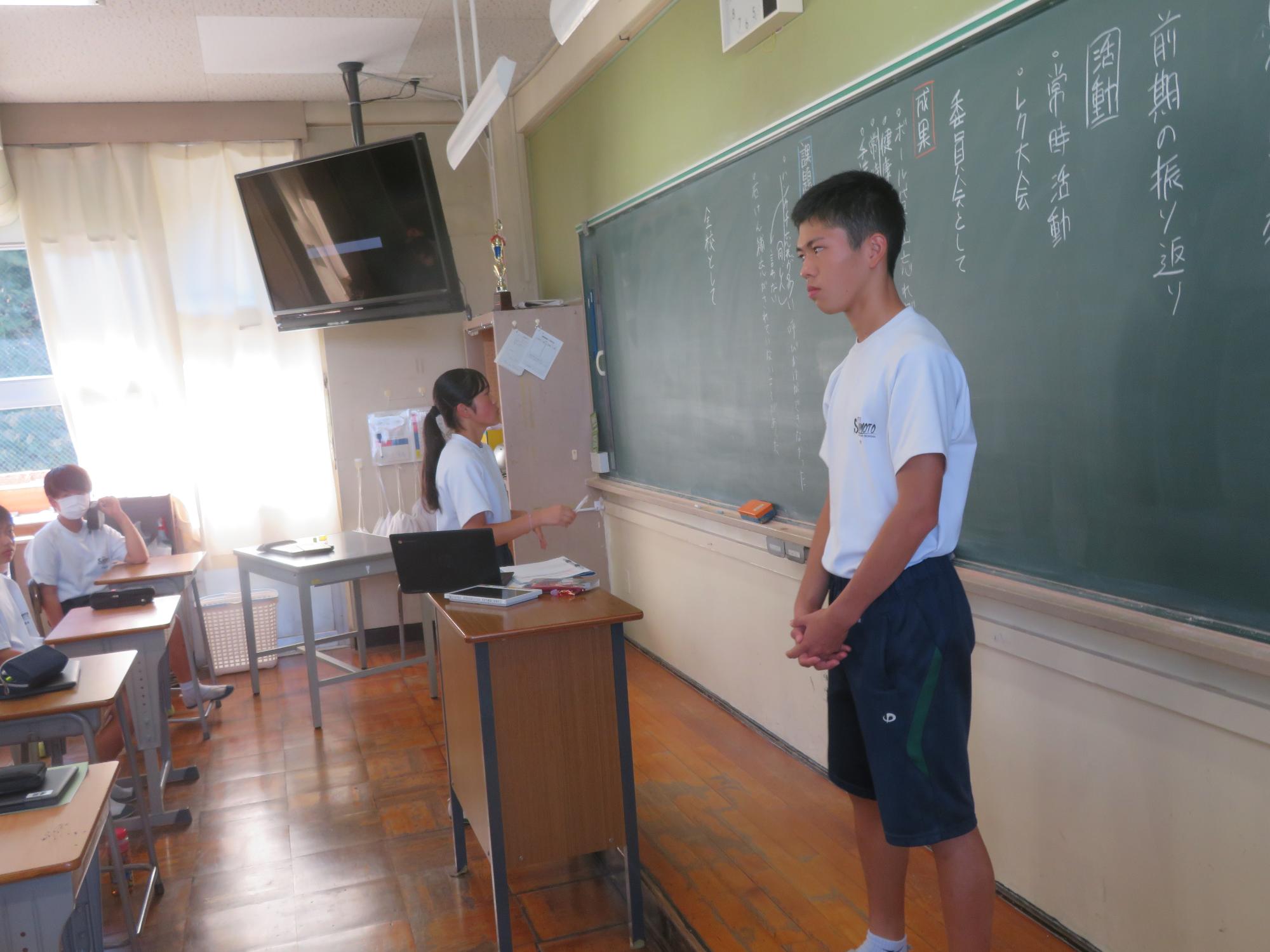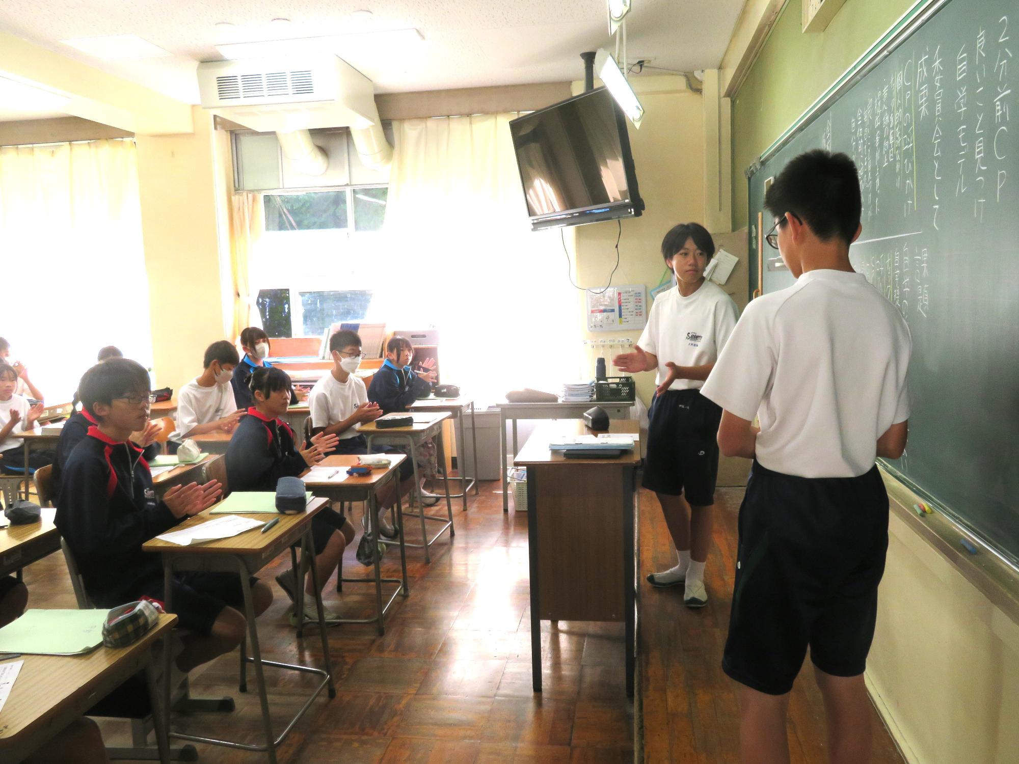 今週で前期の課程が終了します。木曜日の生徒集会に向けての委員会が行われました。どの委員会からも前期の成果と課題をはっきりさせ、後期の活動に引き継ぐ想いが伝わってきました。また、先日、感動的な体育祭を創り上げた4名の団長を招き、体育祭を終えての想いを聞きました。どの団長も「団全員が一生懸命になり、団がまとまったことが一番嬉しかった。」「仲間の思いやりのある行動に深く感動した。自分も思いやりの行動を大切にしたい。」とすがすがしい笑顔で答えてくれました。今から、後期の生徒会活動が楽しみです。
