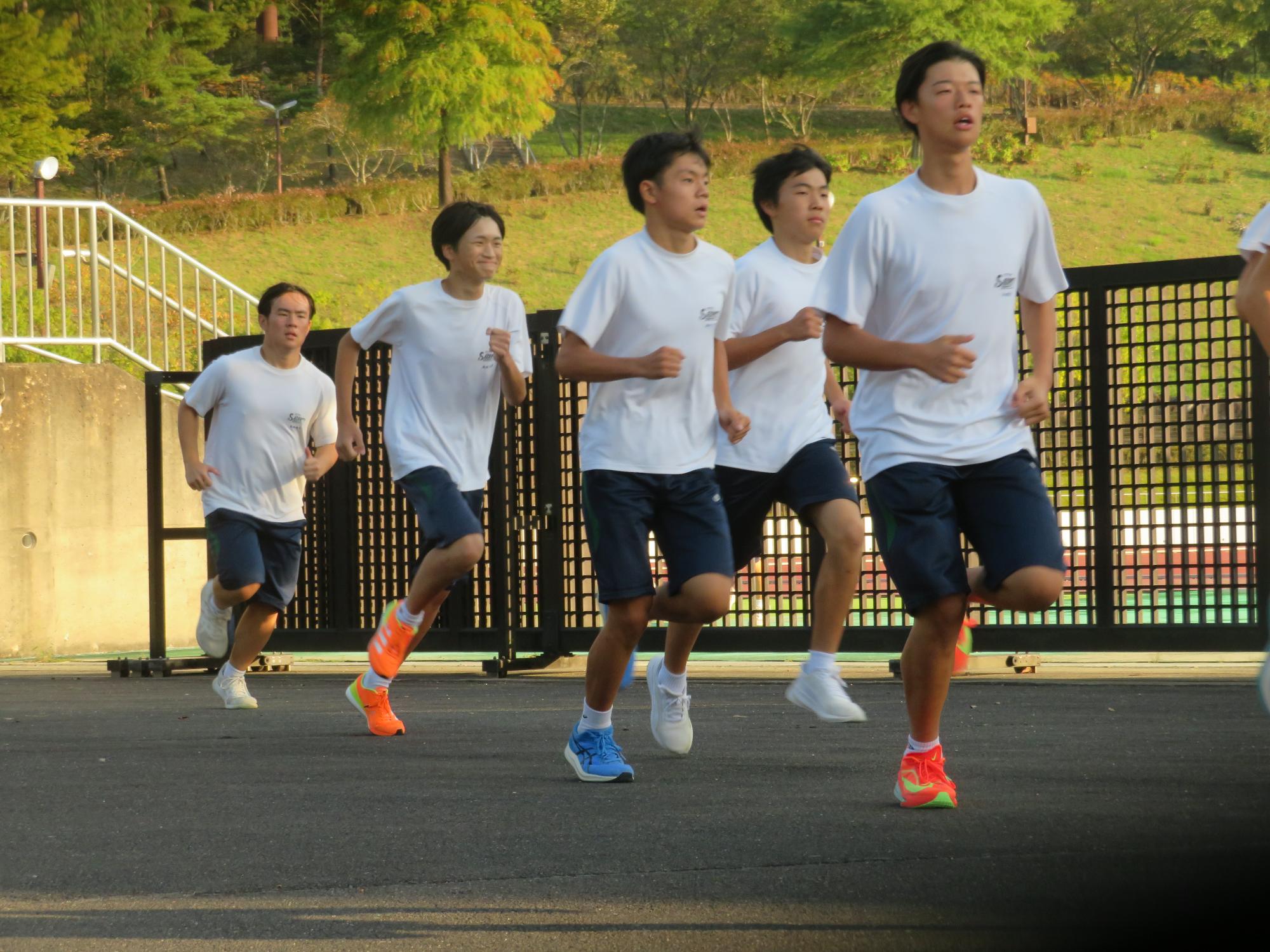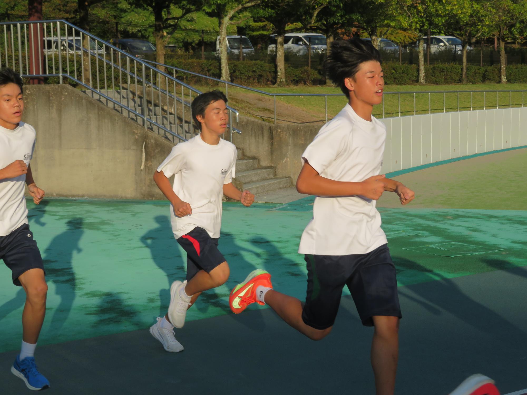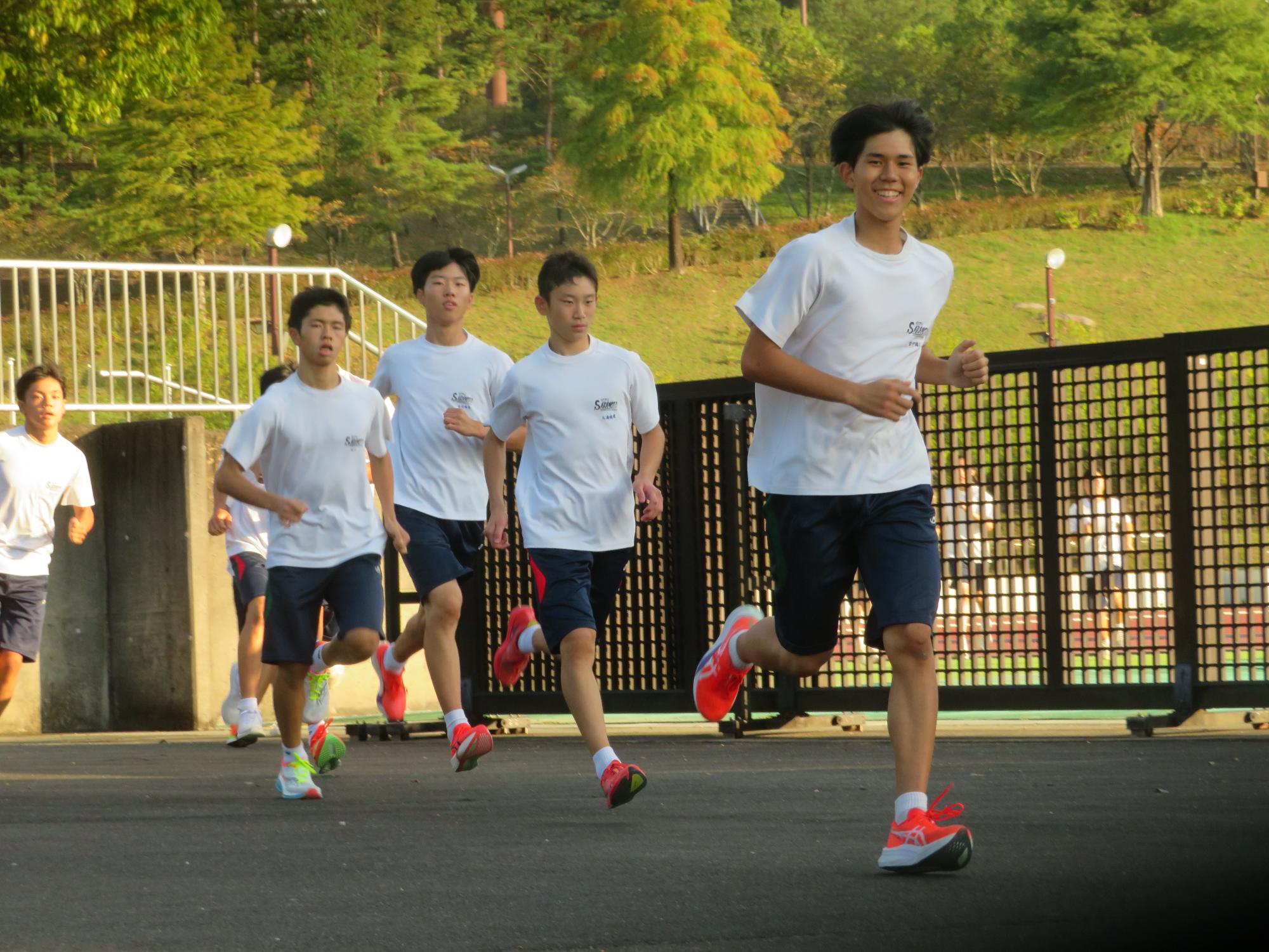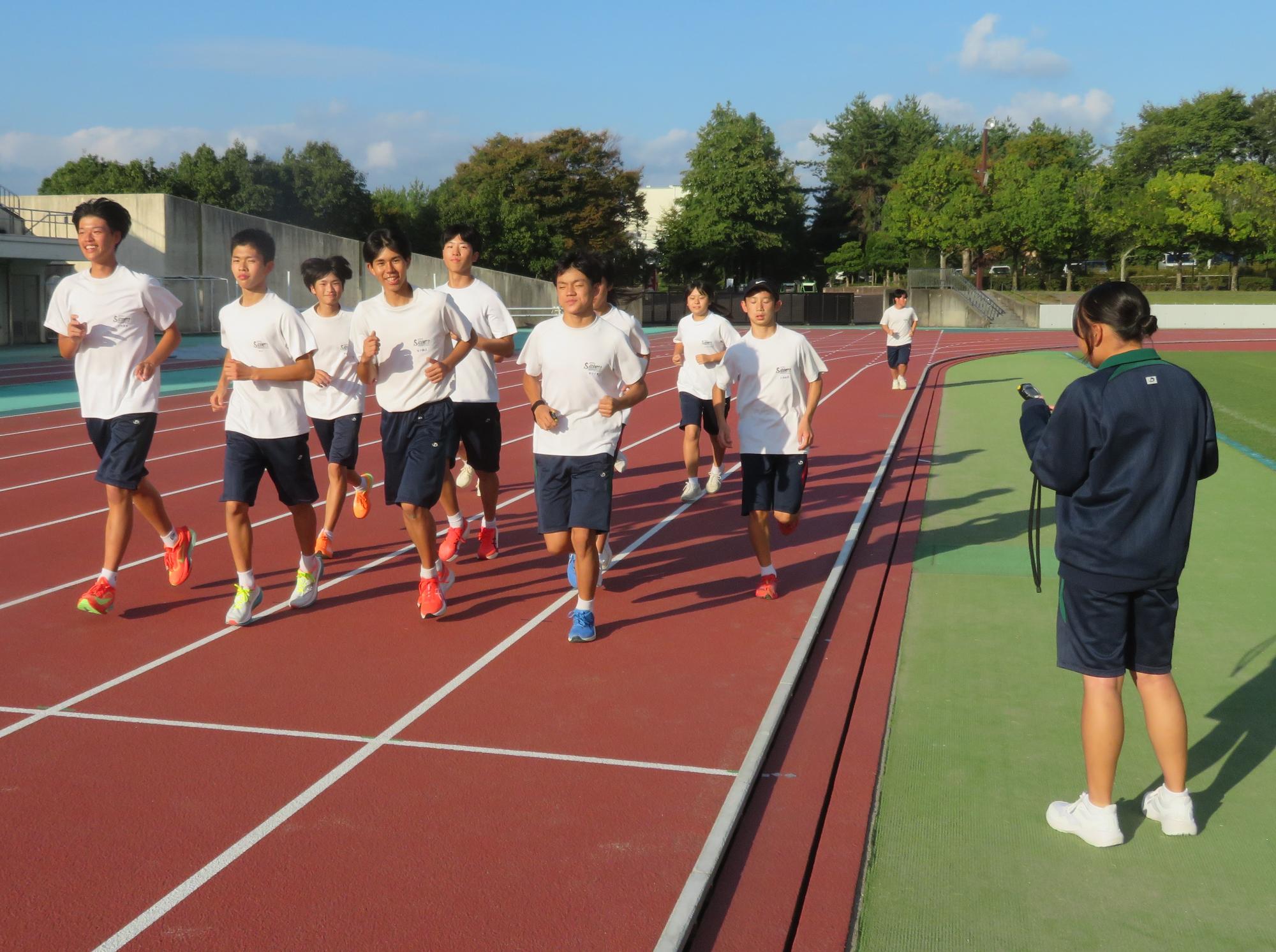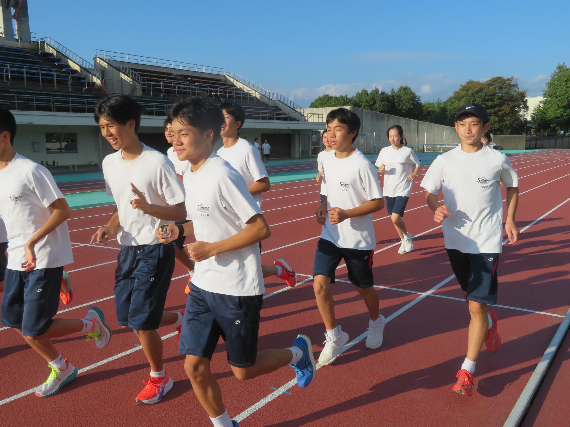 坂中駅伝部、現地での練習で力走 更新日:2025年10月11日 前期終業式が終わったあと、坂中駅伝部は本番が行われる中津川陸上競技場に行き練習をしました。個々の意気込みがヒシヒシと伝わってくる練習でした。アップの時は笑顔、タイムレースの際は、本番さながらの緊張感をもった力走が見られました。歯を食いしばり走り姿が大変魅力的であり、一生懸命な姿で練習に向かっている坂中駅伝部を心から称えたいです。本番は自分との闘い。素晴らしい力走をしてくれると今から確信しています。