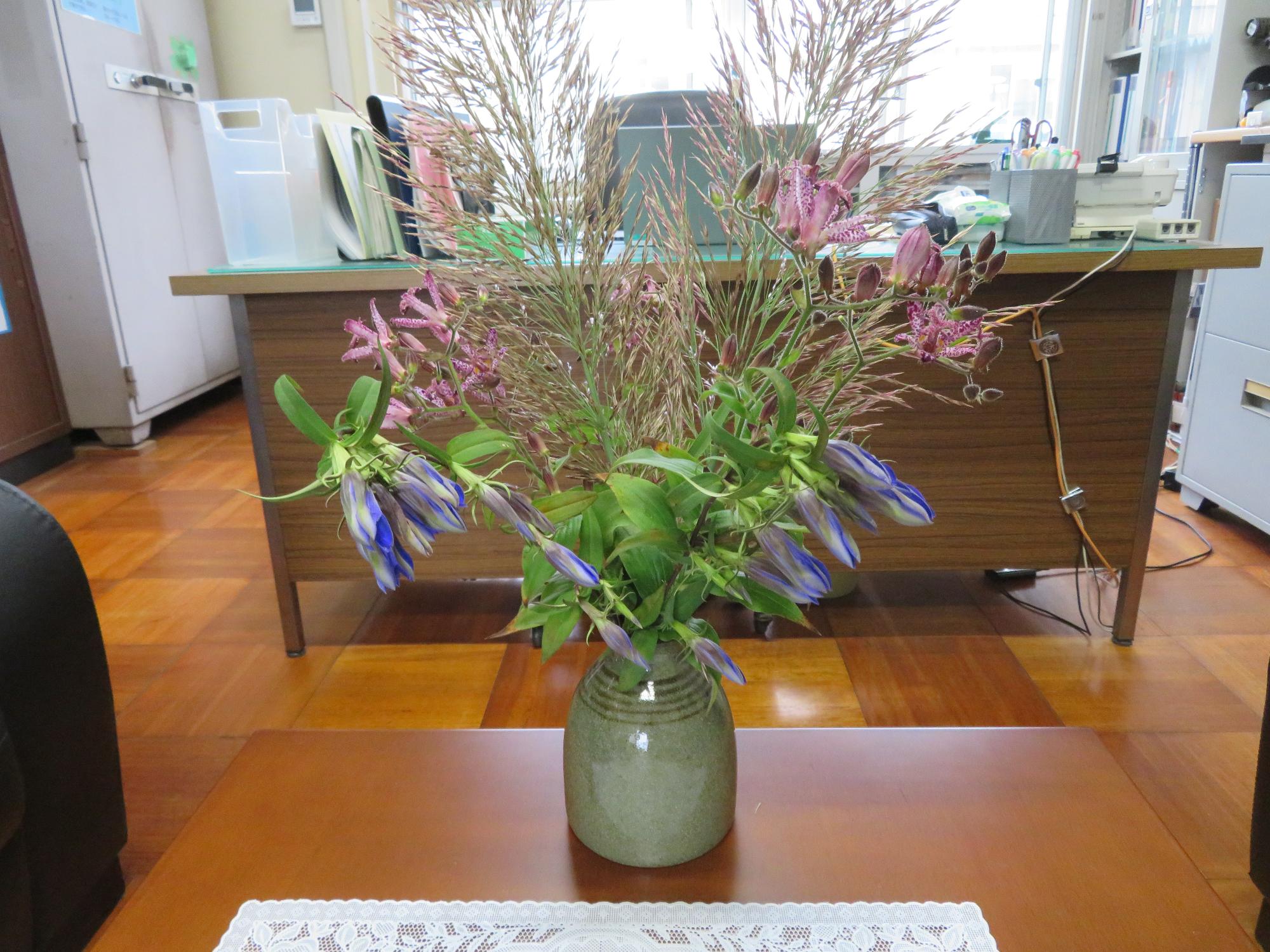 地域の田中さんが毎週月曜日に花をもってきて飾ってくれます。本日は竜胆の花です。