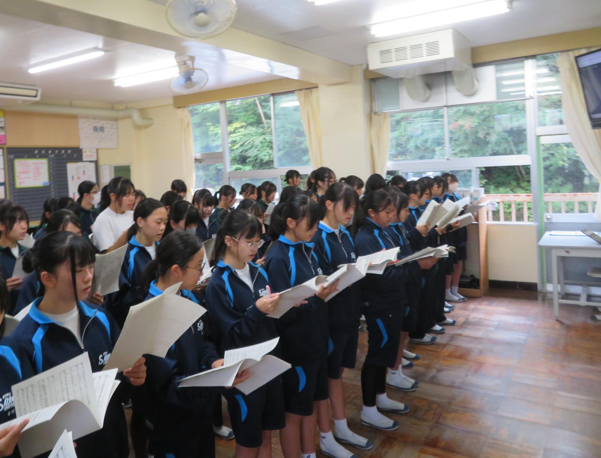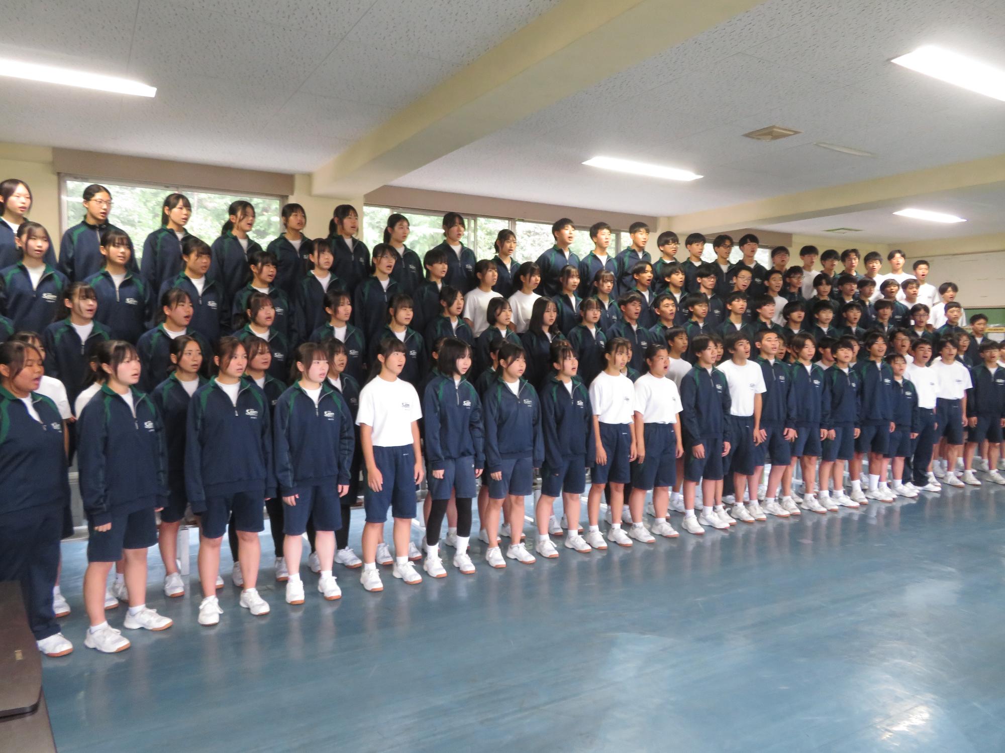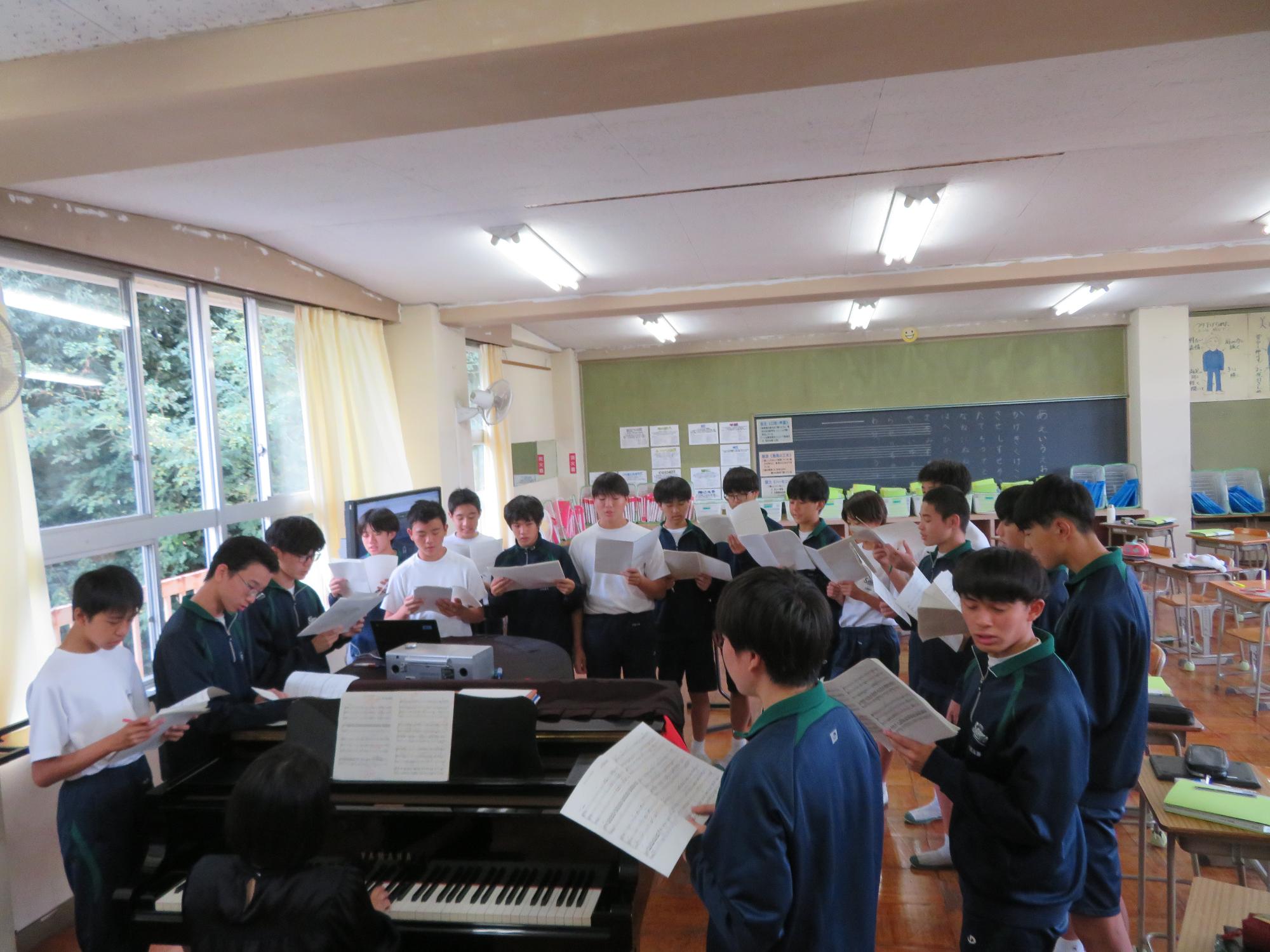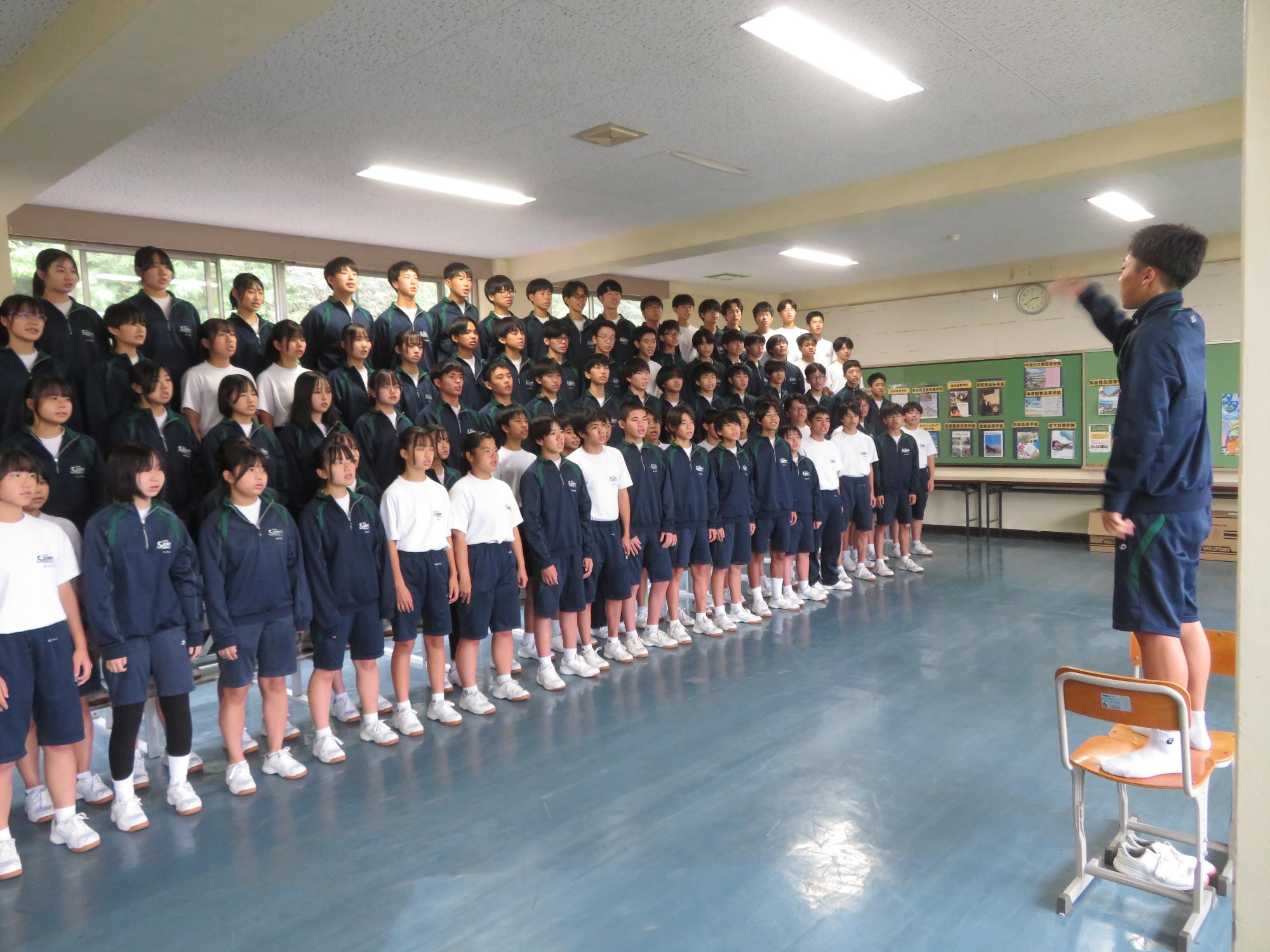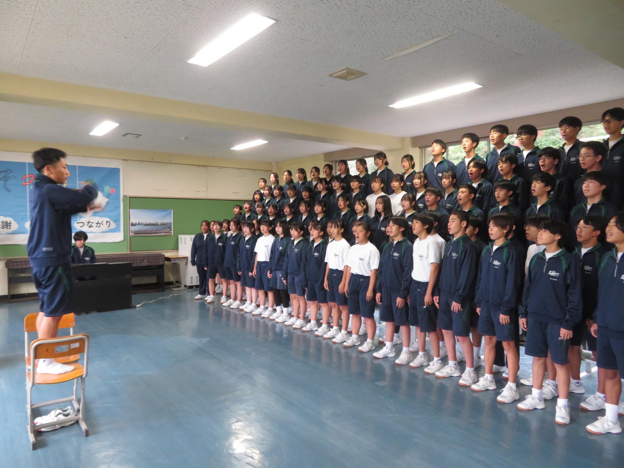 今年度、生徒会が提案した坂中3本柱。その中の『合唱』について、後期の生徒会はさらに高めようとする意気込みをもっています。その一つとして、“全校で響きのある合唱を創りたい”と誇れる全校合唱を創り出そうとしています。全校合唱の練習日を決め、各学年で練習を重ねています。またこの日、3年生は職業講話に来ていただいた県教育委員会の方にお礼として合唱を贈りました。合唱が校内の文化を高めていることが感じられる後期の坂本中学校です。