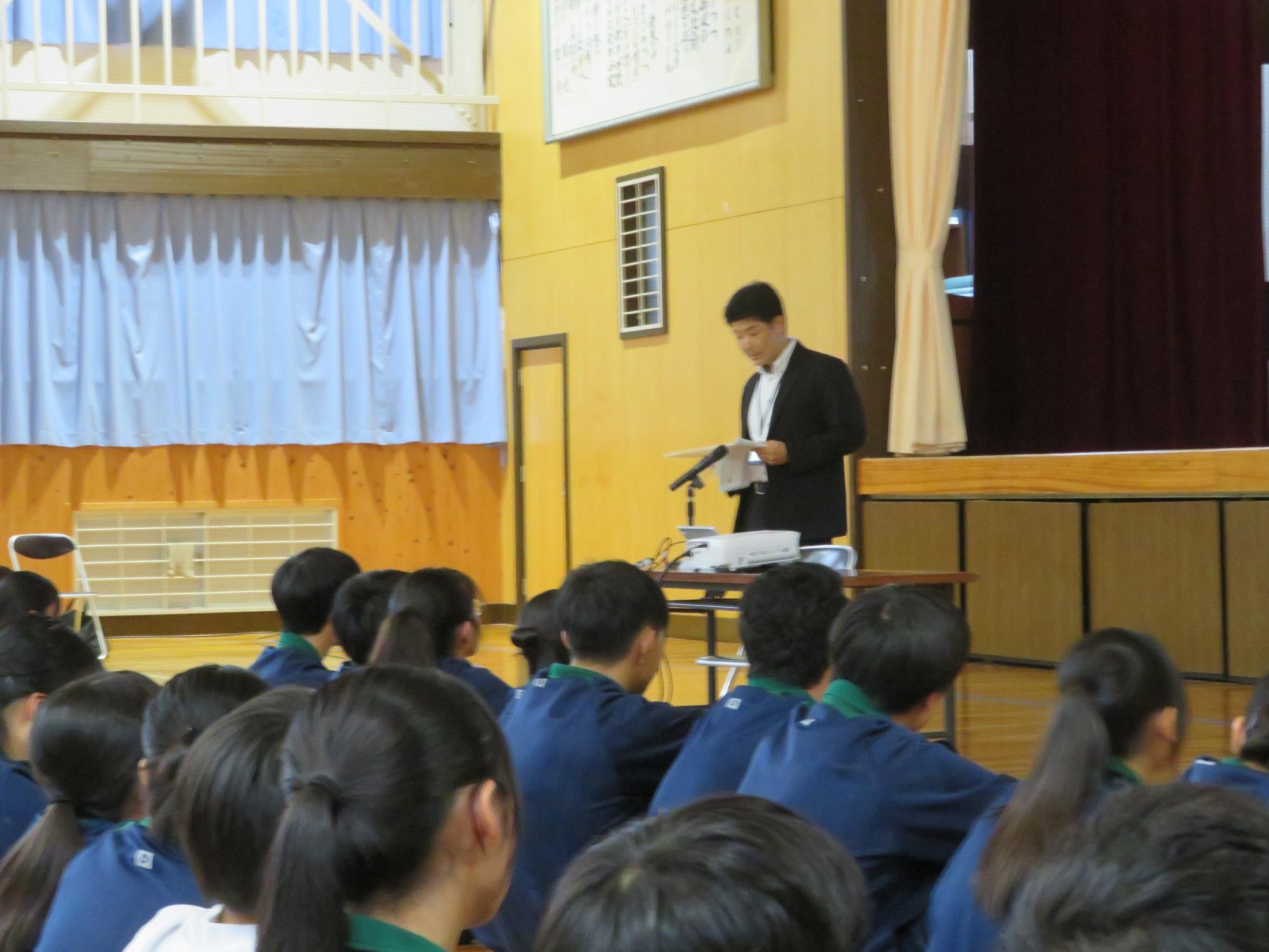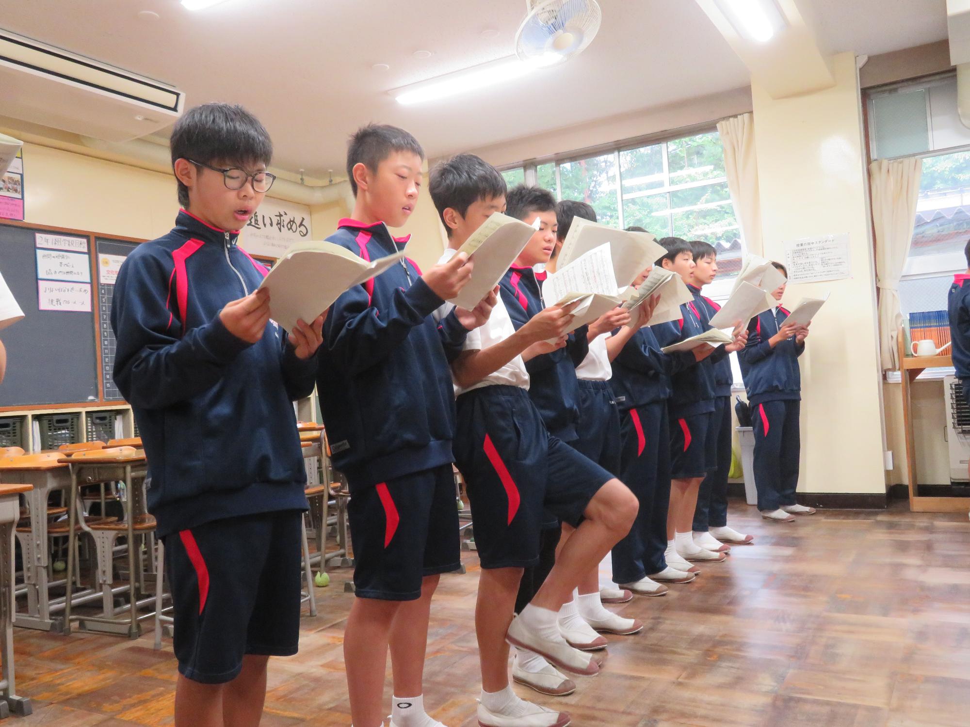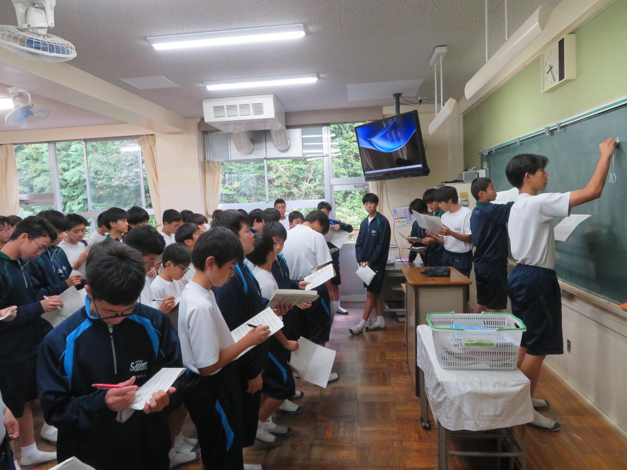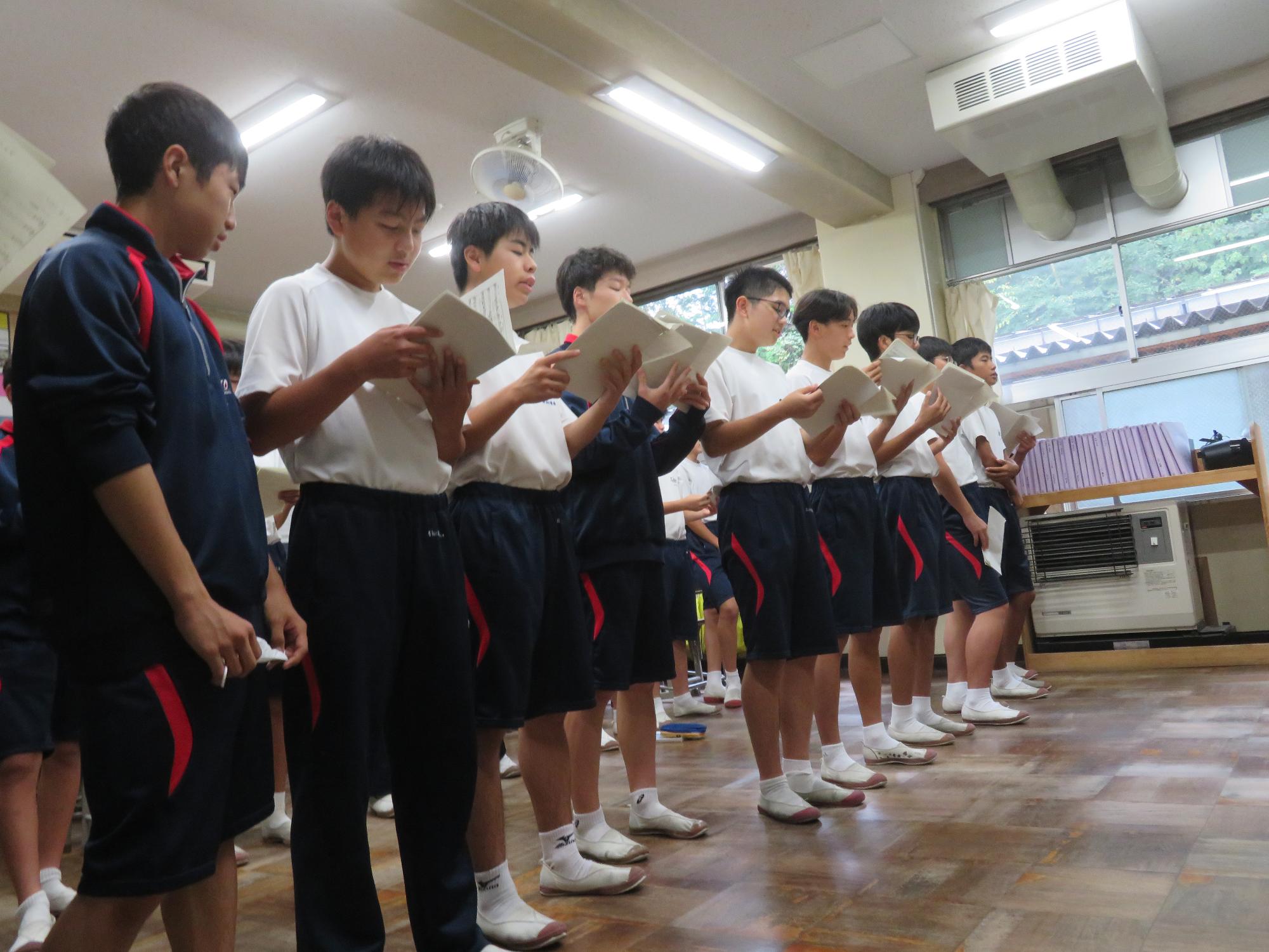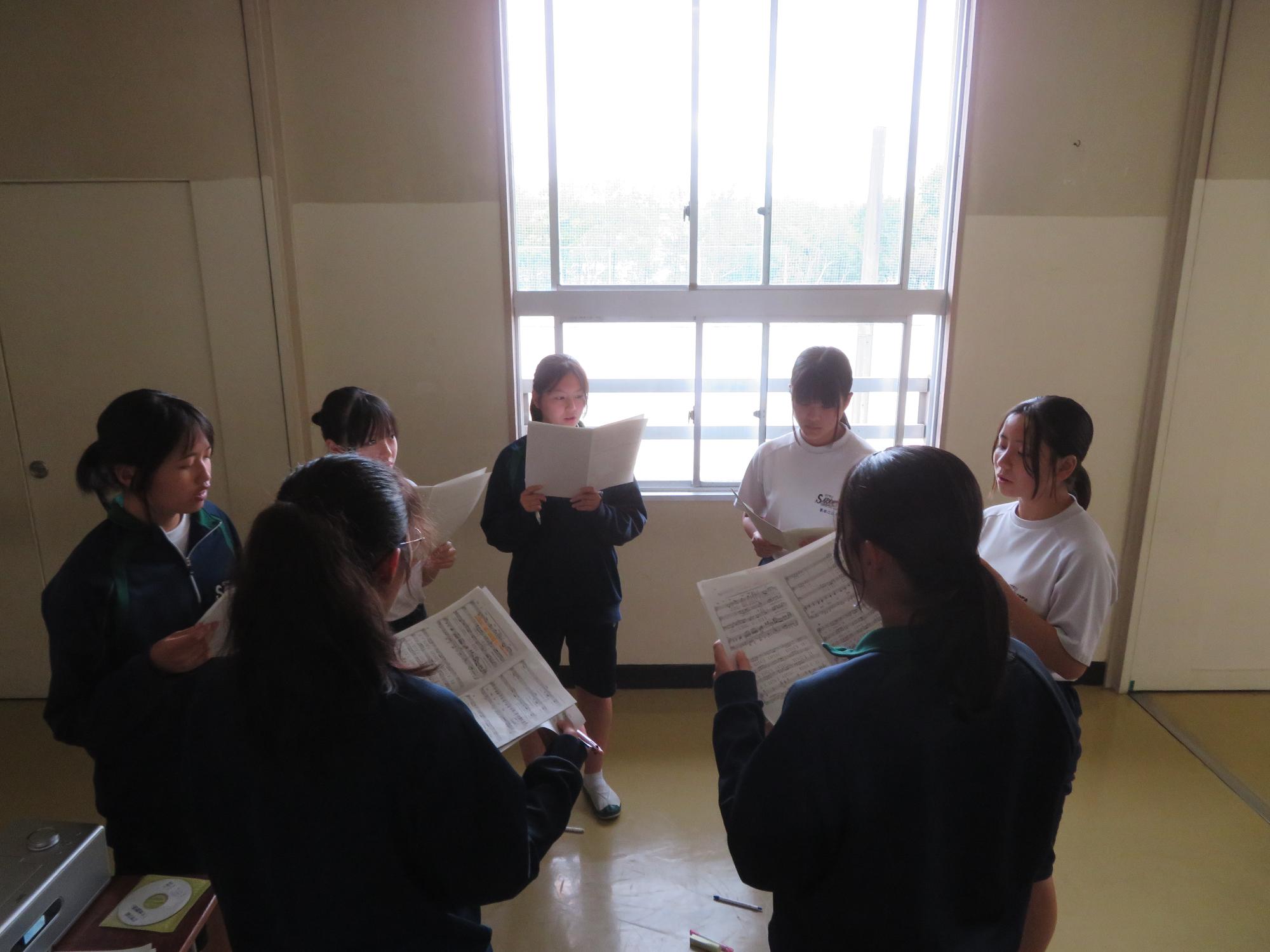 今年度、生徒会が提案した坂中3本柱。その中の『合唱』について、後期の生徒会はさらに高めようとする意気込みをもっています。その一つとして、“全校で響きのある合唱を創りたい”と誇れる全校合唱を創り出そうとしています。全校合唱の練習日を決め、各学年で練習を重ねています。またこの日、3年生は職業講話に来ていただいた県教育委員会の方にお礼として合唱を贈りました。合唱が校内の文化を高めていることが感じられる後期の坂本中学校です。
