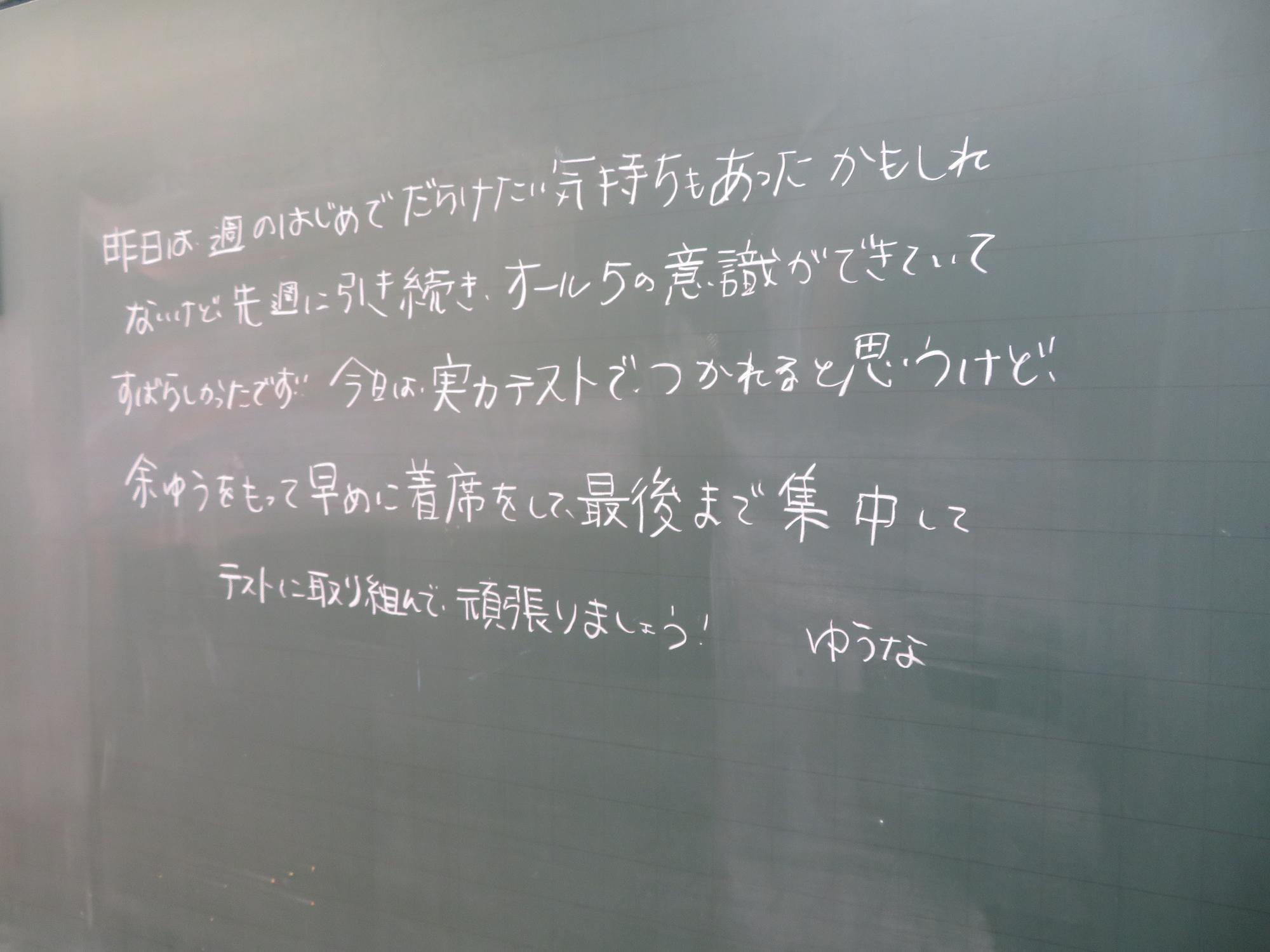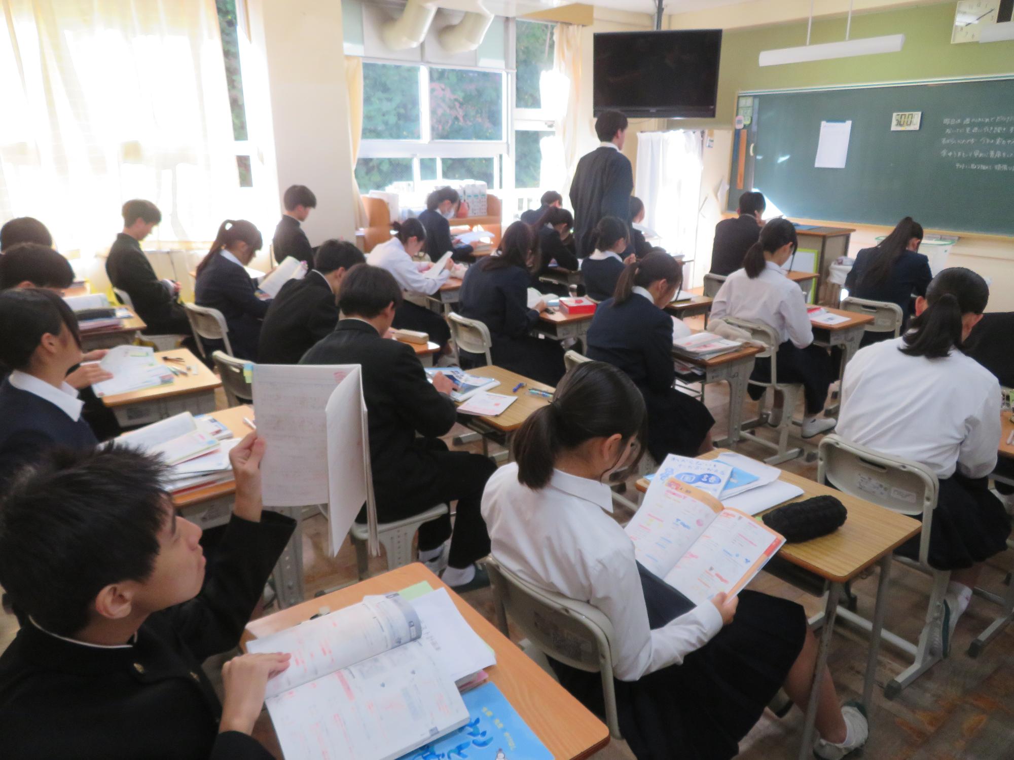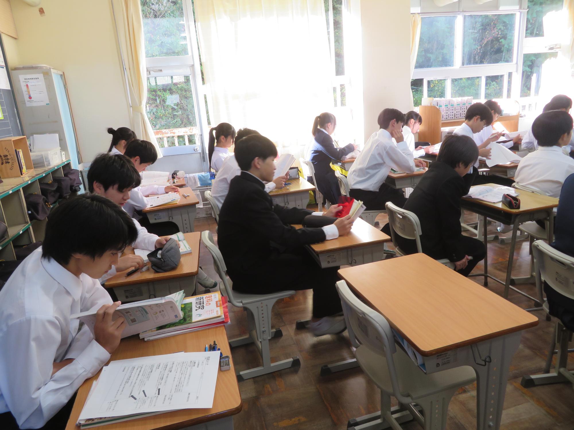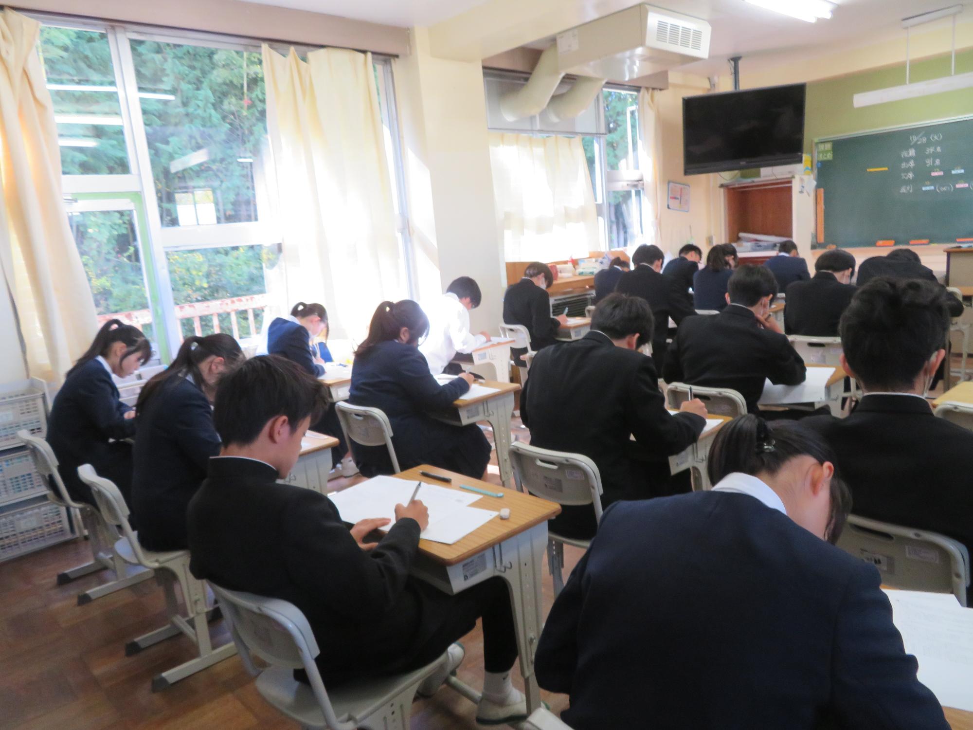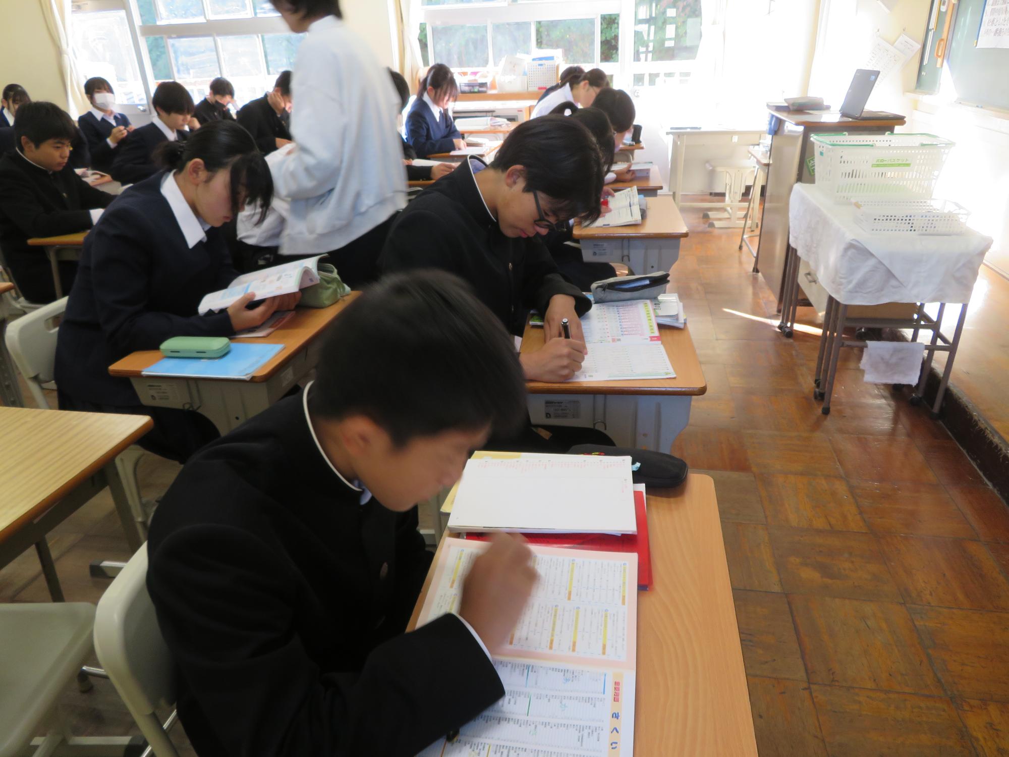 3年生の実力テストが行われました。3年生にとっては、いよいよ学校で行われる実力テストも残り少なくなってきました。7:30の時点で気温6℃と寒い朝でしたが、3年生はテスト勉強のため朝早くに登校する生徒が多く見られました。どの生徒も「頑張ります!」という意気込みいっぱいでした。ある生徒は「どんと来いです。ただし、自信はありませんが・・」と応えてくれました。自分の進路希望をかなえるため、結果を出し、高校入試に自信をもって挑んでほしいと切に願っています。頑張れ!3年生。