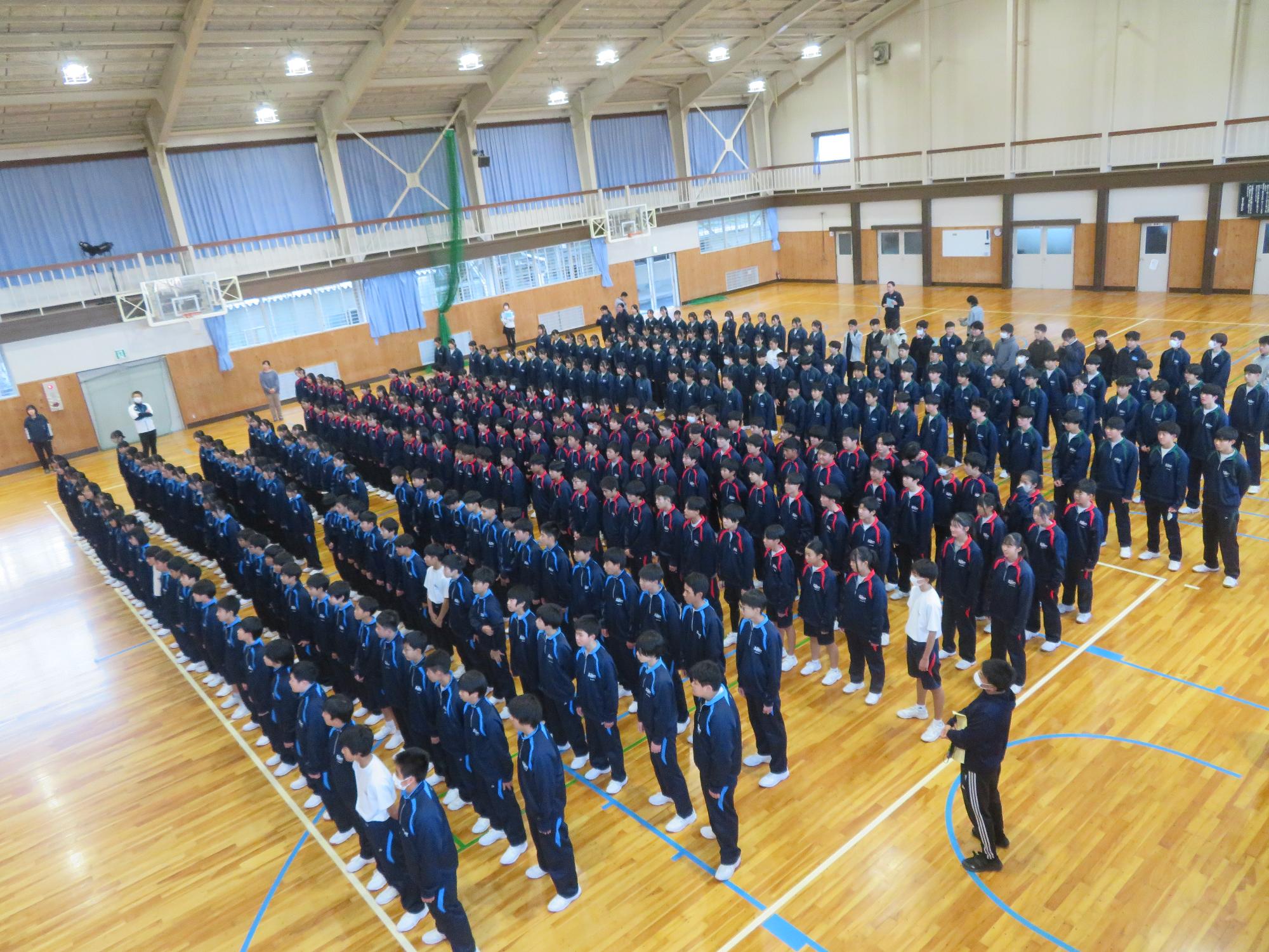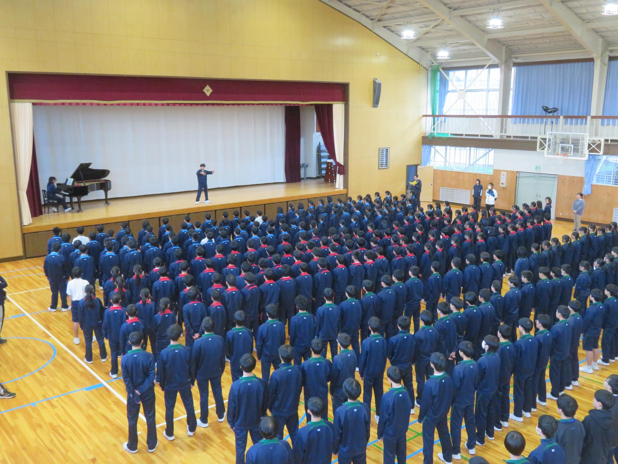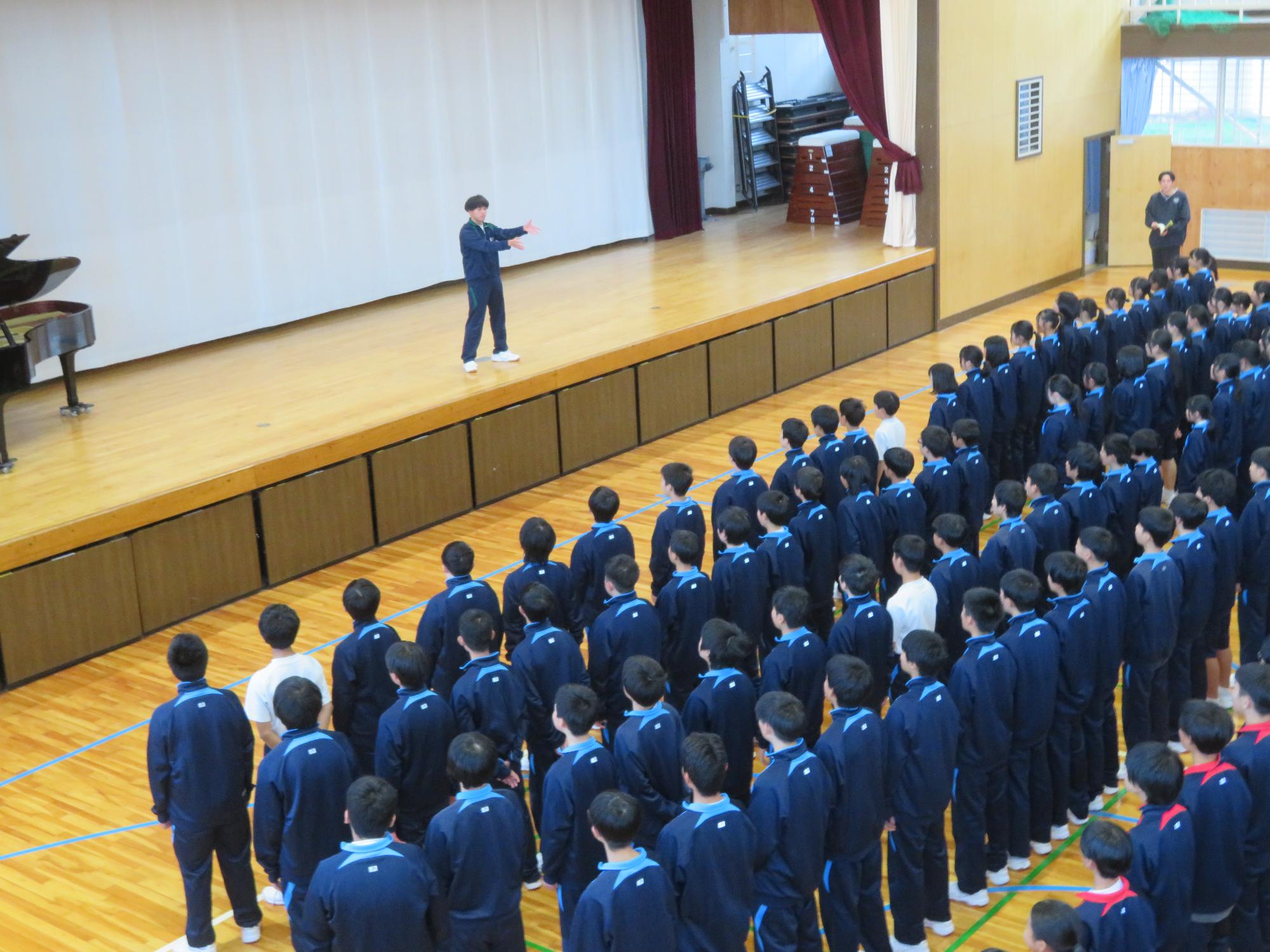 指揮者はよい点と課題点を話しながら全校を牽引していきます。