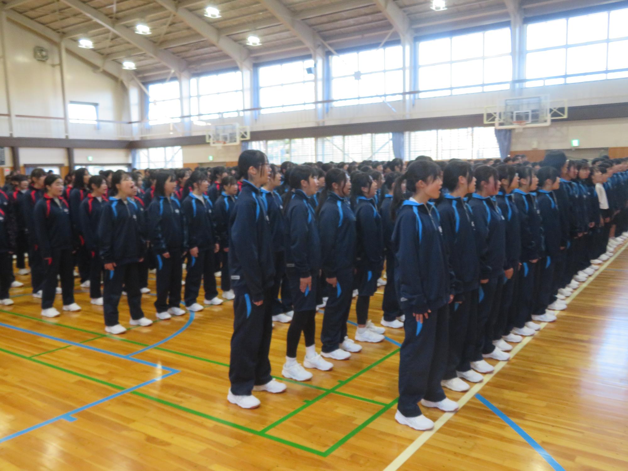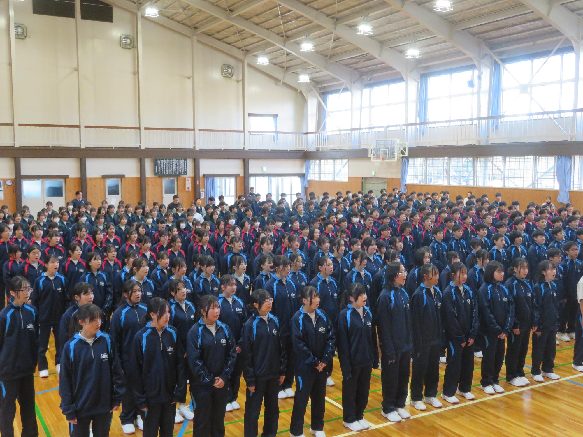今日の放課後、全校合唱の練習を体育館で行いました。校歌や式歌を全校で歌うことはありますが、373名が一堂に会して合唱曲を歌うのはコロナによる制限もあったため、何十年ぶりだと思われます。曲名は「フェニックス」。学校報でも紹介したとおり、能登半島地震からの復興を願い、全国に届けられた曲です。全校が集まり、心を込めながら、歌う姿に感激しました。迫力と響きも素敵です。ぜひ、合唱祭本番の歌声を楽しみにしていただきたいと感じています。