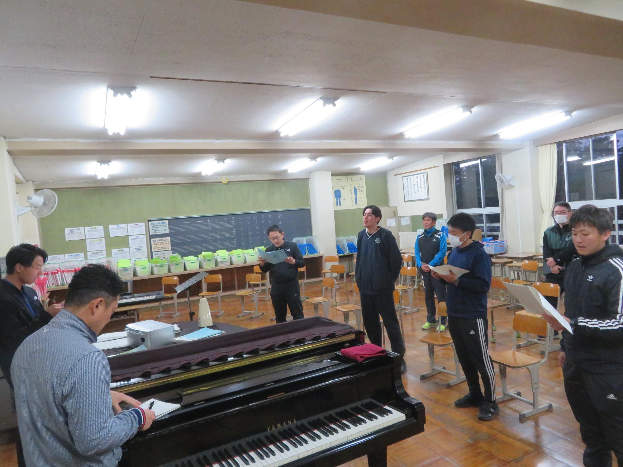 先生たちも夜、全校合唱の合唱練習に励んでいます。