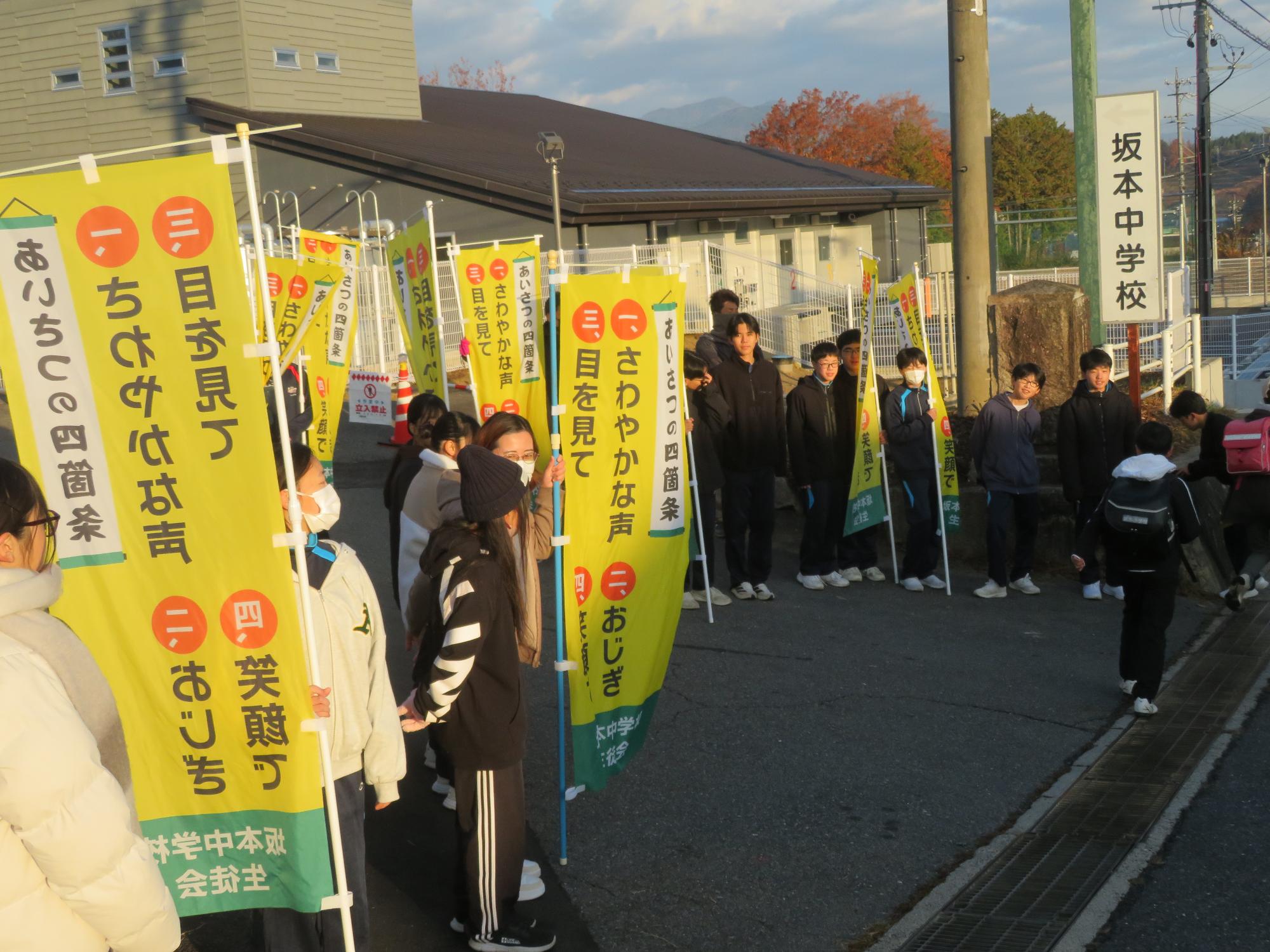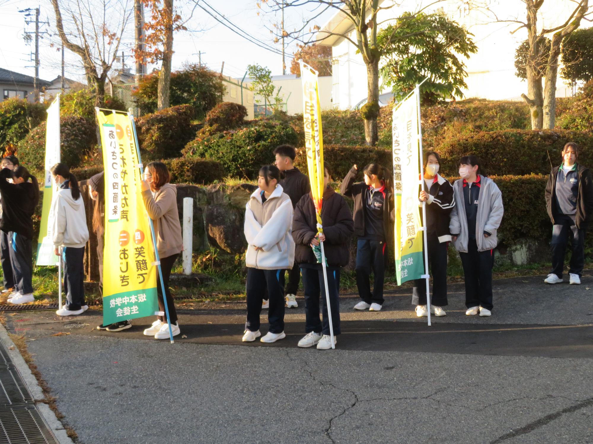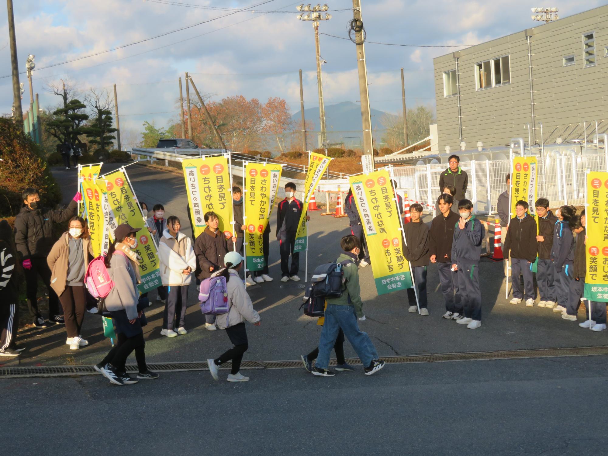 昨日に続けて、授業でBRUSH UPしている坂中生の姿を紹介します。本日も学校運営協議会のご協力で、坂本地区在住の川瀬さまに家庭科の実習のサポートに入っていただきました。また、持久走の授業が始まり、生徒たちが自分の体力に合わせ、一生懸命に頑張り姿が随所に見られます。また、今日はPTAの郊外生活委員の方との挨拶運動も7:30から元気に行われました。その姿も同時に紹介します。師走に入り、寒くなっても一生懸命に活動に向かう坂中生です。