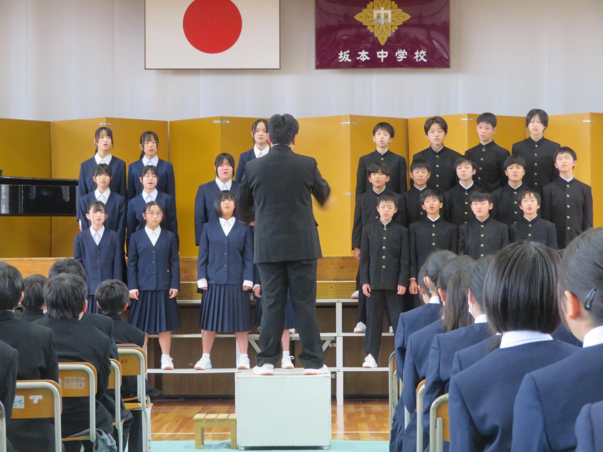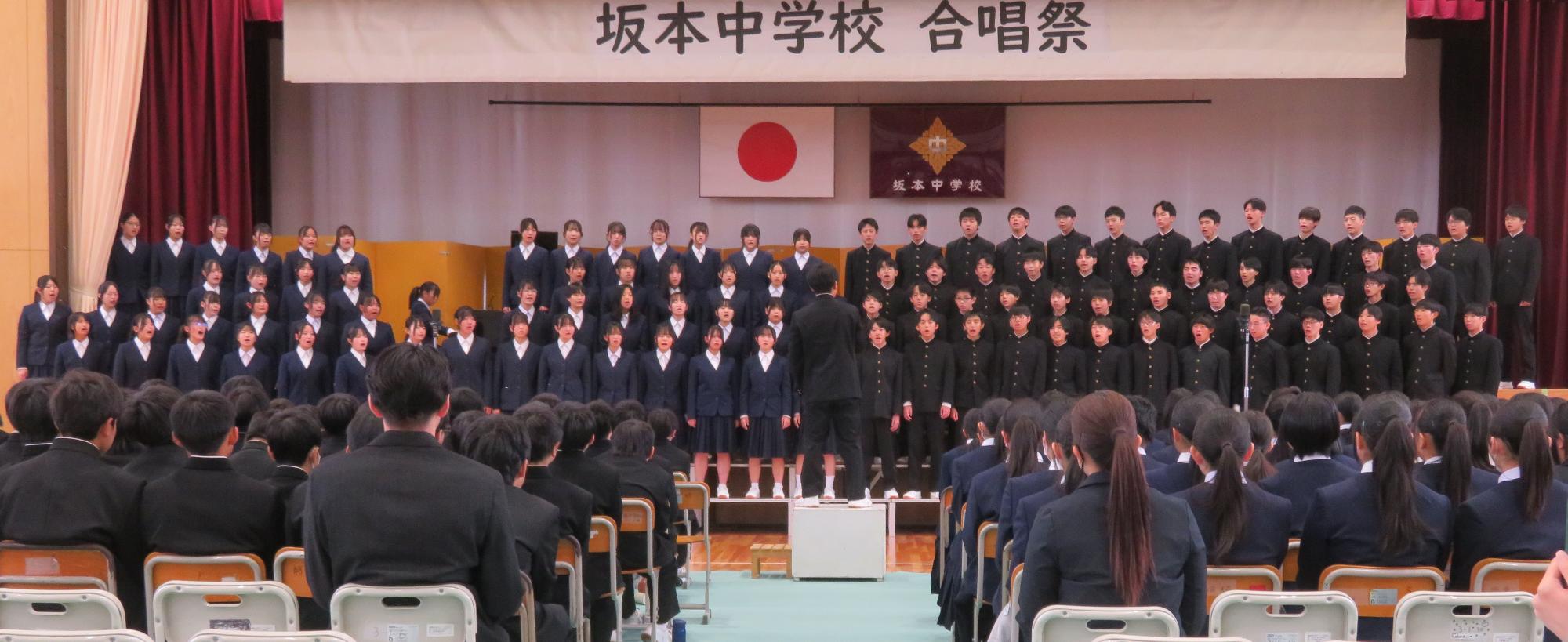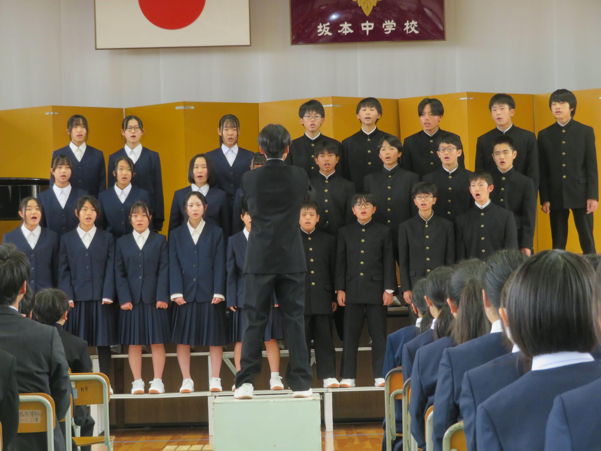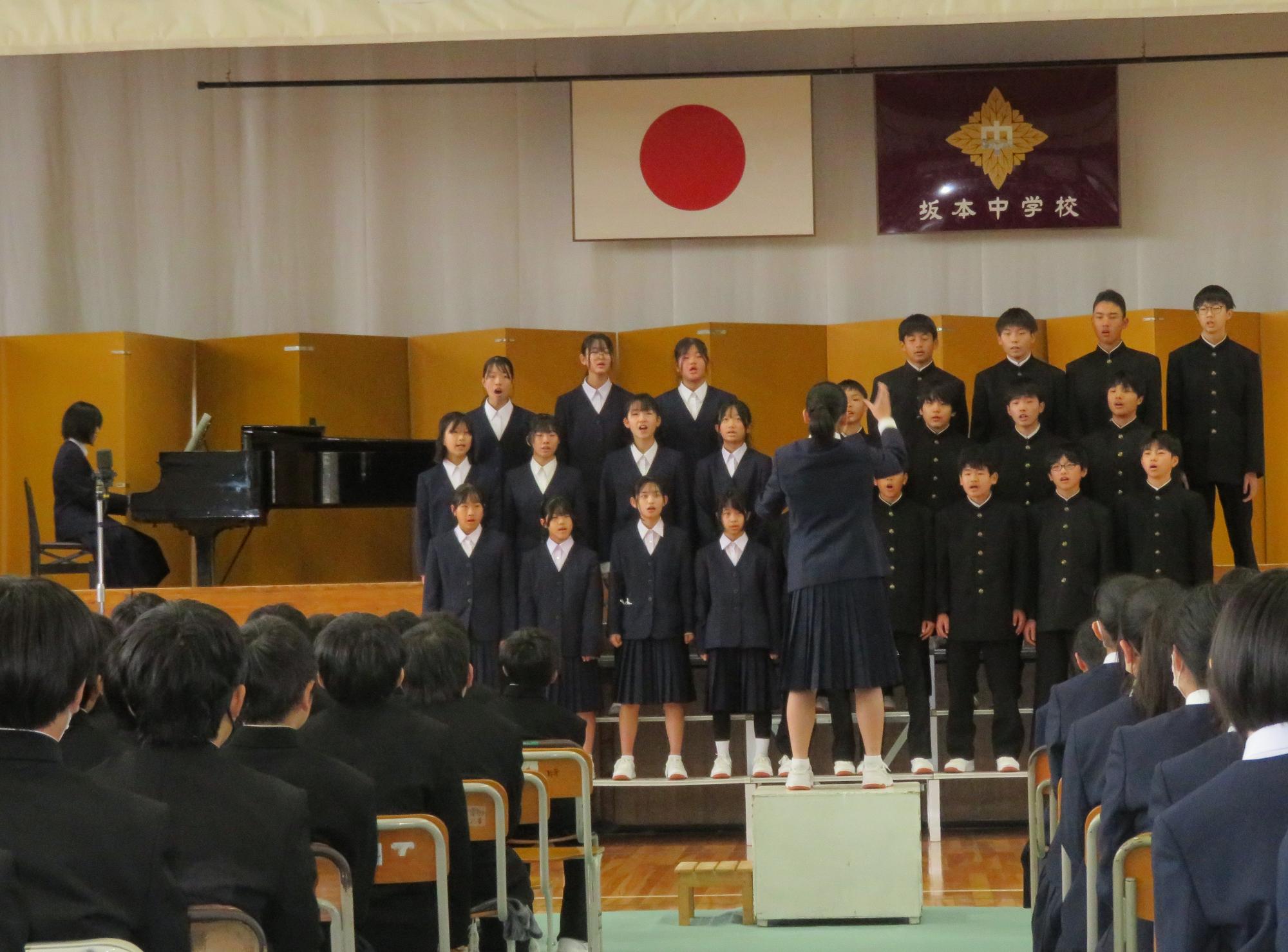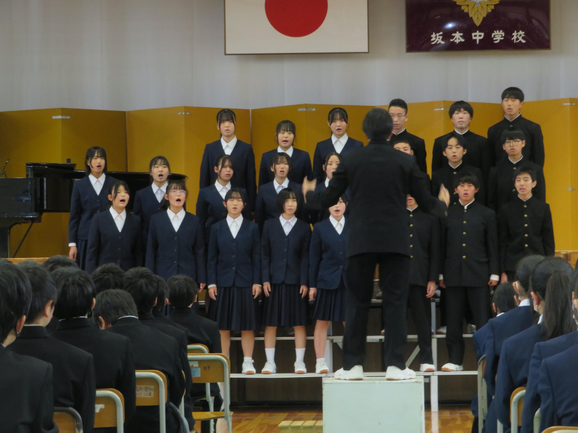 坂中合唱祭が行われました。インフルエンザの感染者が何人かいて全員で歌えない学級も多々ありましたが、どの学級も仲間と一生懸命に歌う姿、心と心をつなぎ合唱に取り組む姿が随所に見られ、たくさんの感動を与えてくれました。クラス合唱もさることながら、学年合唱、全校合唱は圧巻でした。特に、全校合唱「フェニックス」は、能登半島地震で被災された方への哀悼の心、復興に対しての応援の心を確実に届ける心のこもった合唱でした。「合唱っていいな。」「合唱って心と心をつなぐ可能性を秘めているな。」と強く感じ、感動いっぱいの坂中合唱祭でした。今後も、坂中の誇りとして大切にしていく坂中生を楽しみにしています。