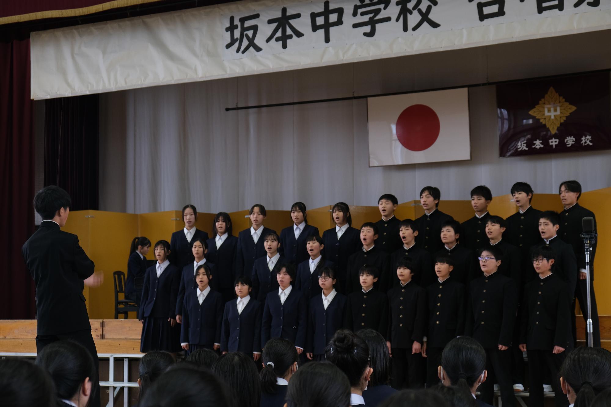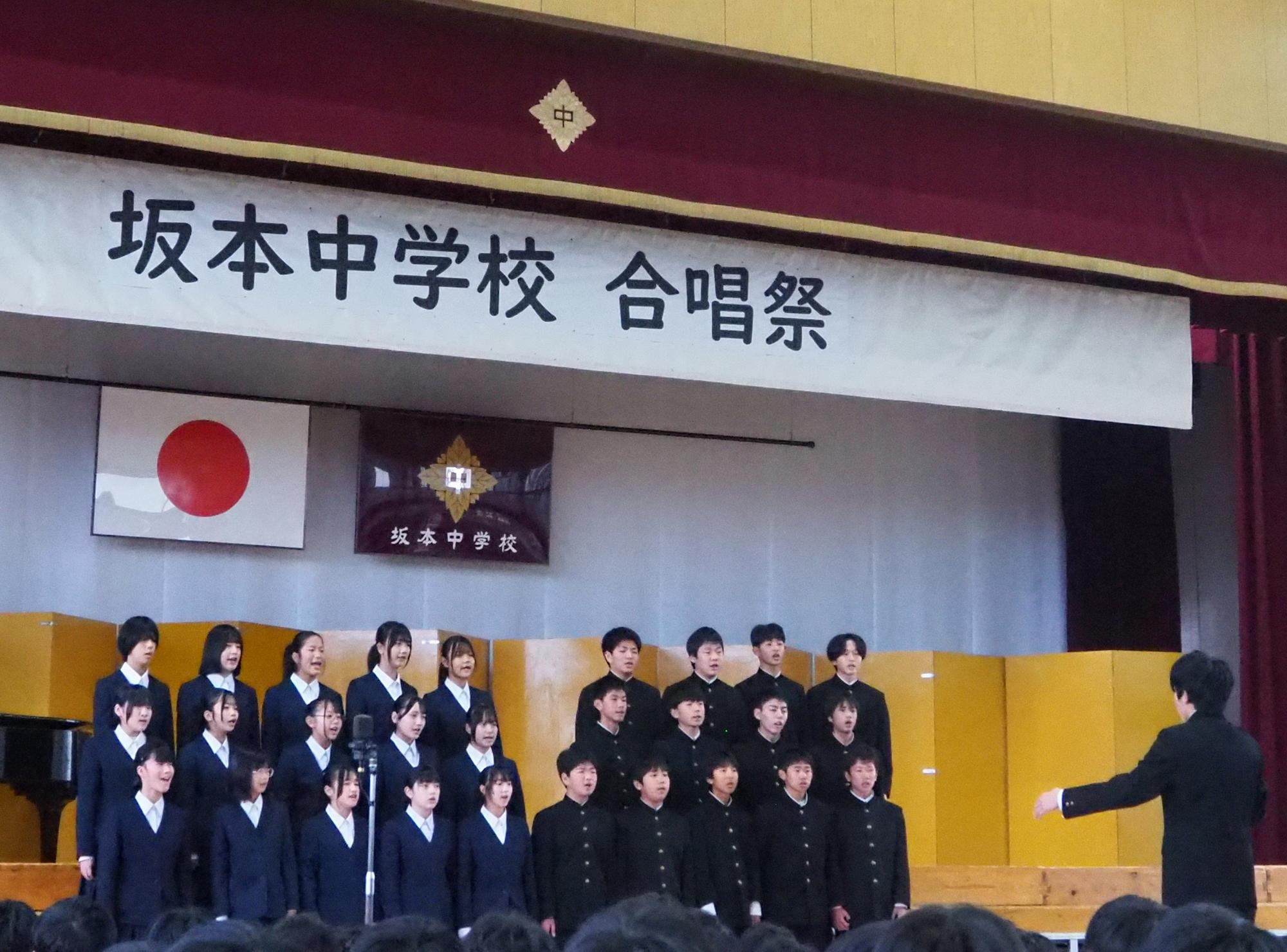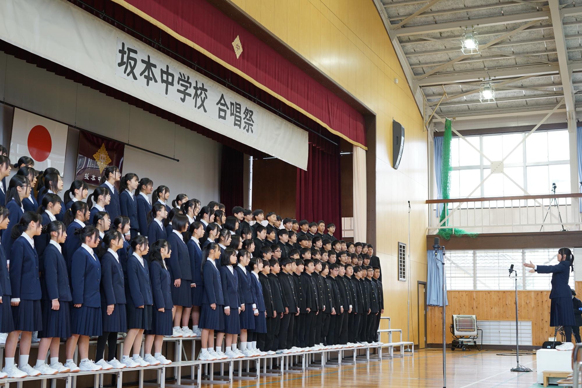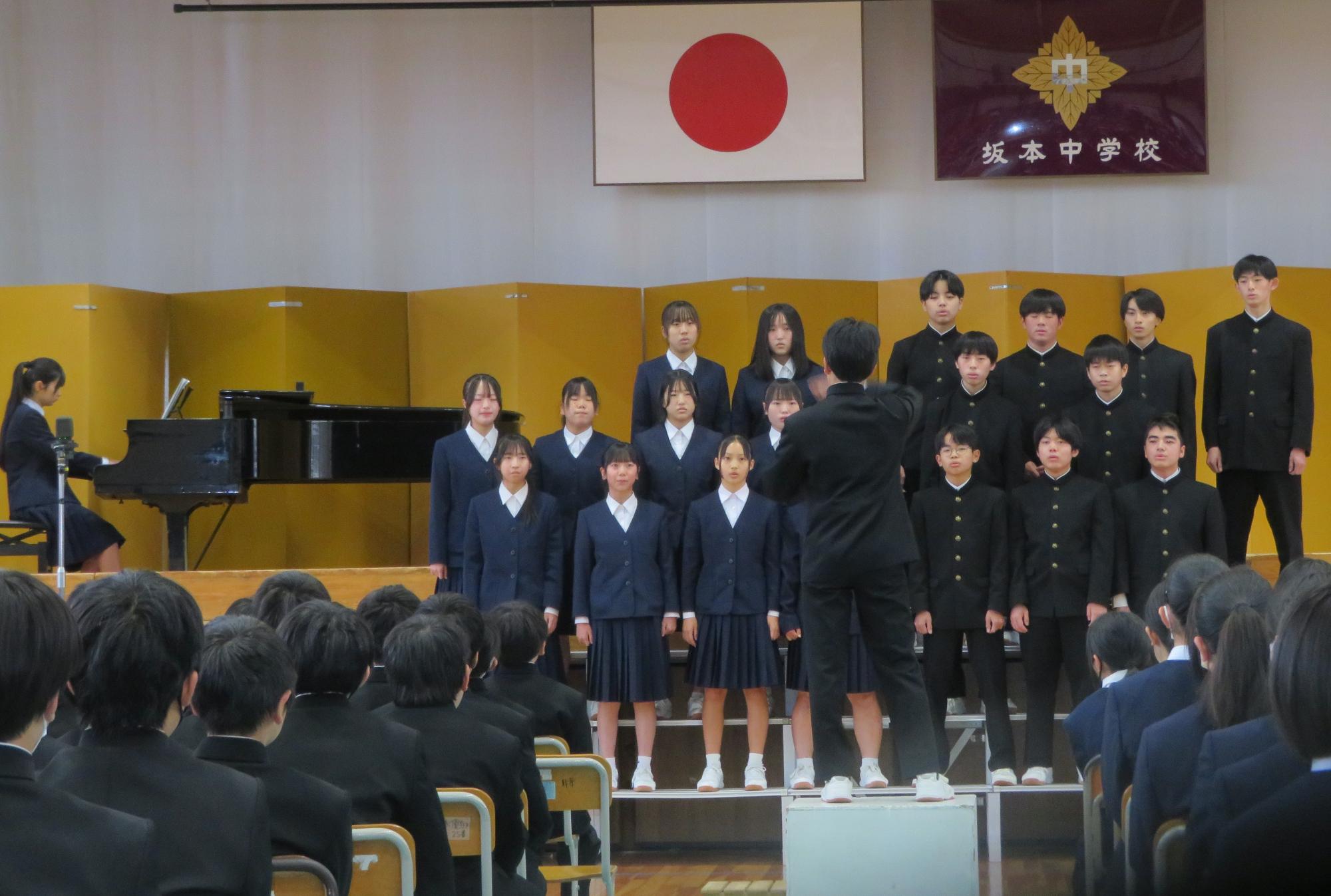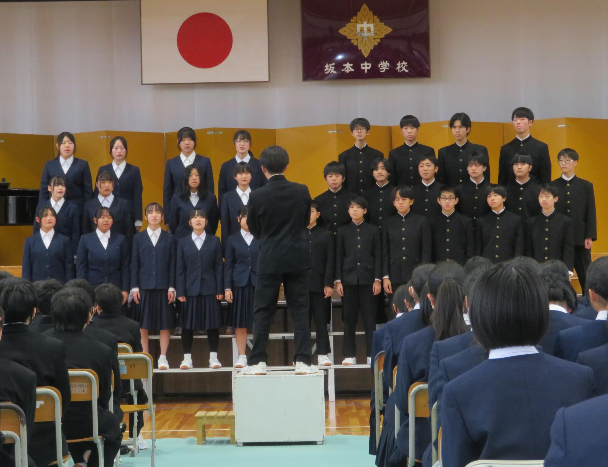 坂中合唱祭が行われました。インフルエンザの感染者が何人かいて全員で歌えない学級も多々ありましたが、どの学級も仲間と一生懸命に歌う姿、心と心をつなぎ合唱に取り組む姿が随所に見られ、たくさんの感動を与えてくれました。クラス合唱もさることながら、学年合唱、全校合唱は圧巻でした。特に、全校合唱「フェニックス」は、能登半島地震で被災された方への哀悼の心、復興に対しての応援の心を確実に届ける心のこもった合唱でした。「合唱っていいな。」「合唱って心と心をつなぐ可能性を秘めているな。」と強く感じ、感動いっぱいの坂中合唱祭でした。今後も、坂中の誇りとして大切にしていく坂中生を楽しみにしています。