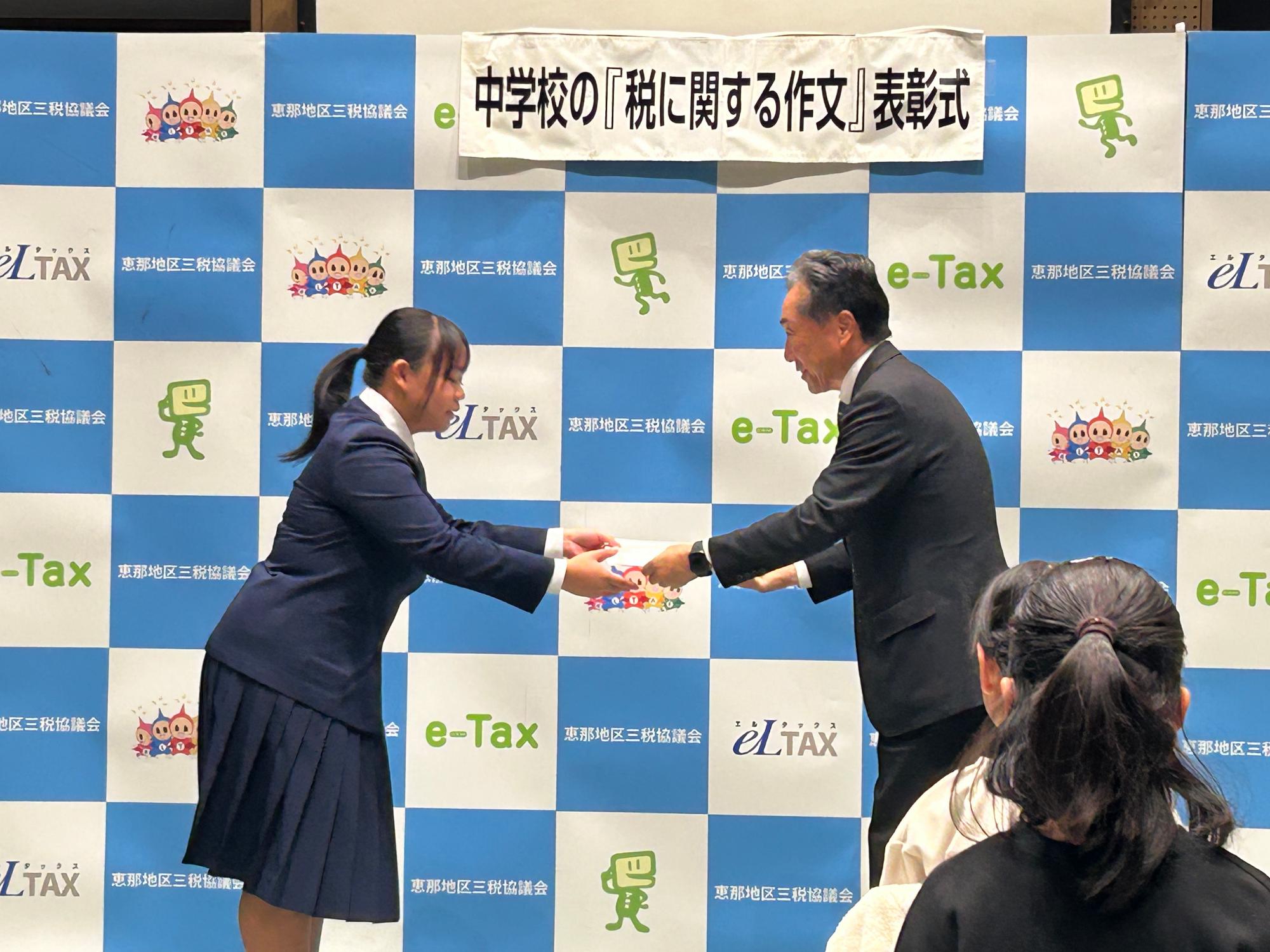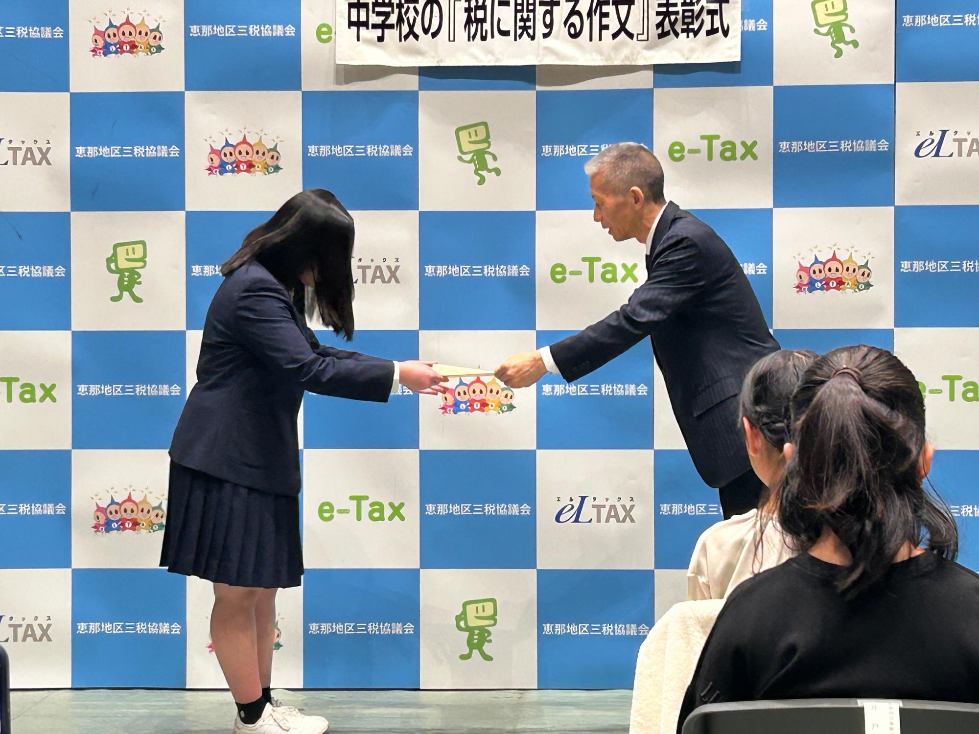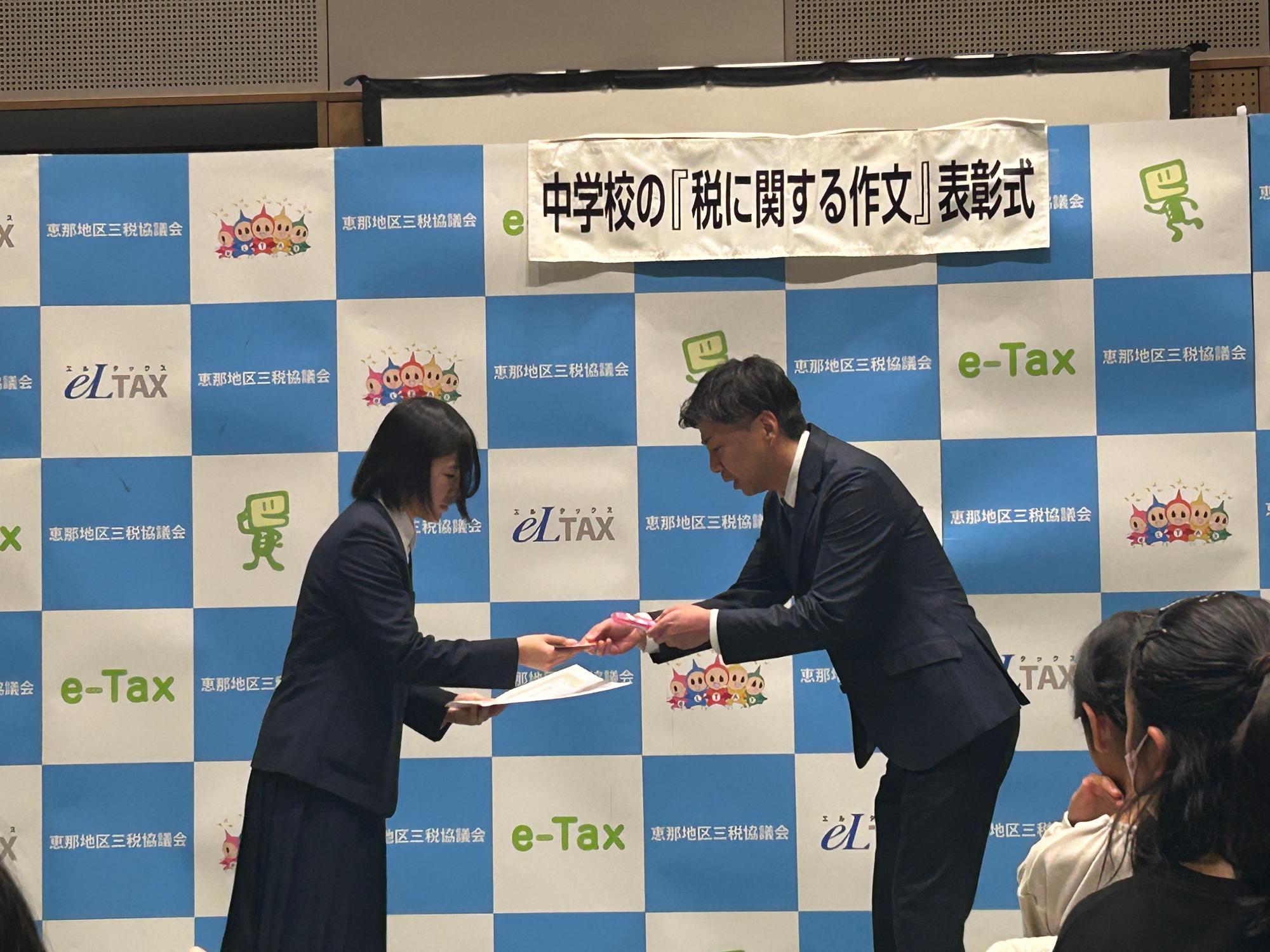 令和7年度「税の作文コンクール」で坂本中学校の生徒や学校が表彰されました。まずは学校の実績に対して感謝状が贈られるとともに、個人賞として坂中生8名が優秀賞を受賞しました。なんと12個ある優秀賞の8つの優秀賞を坂中生が受賞しました。種類としては、中津川税務署長賞や中津川市長賞、中津川法人会長賞などです。なかでも東海納税貯蓄組合連合会長賞を受賞した古川さんの作品は、東海地区のコンクールに送られるとのことです。何よりも、税に対して生徒たちが深く考えてくれたことに敬意を表したいと思います。