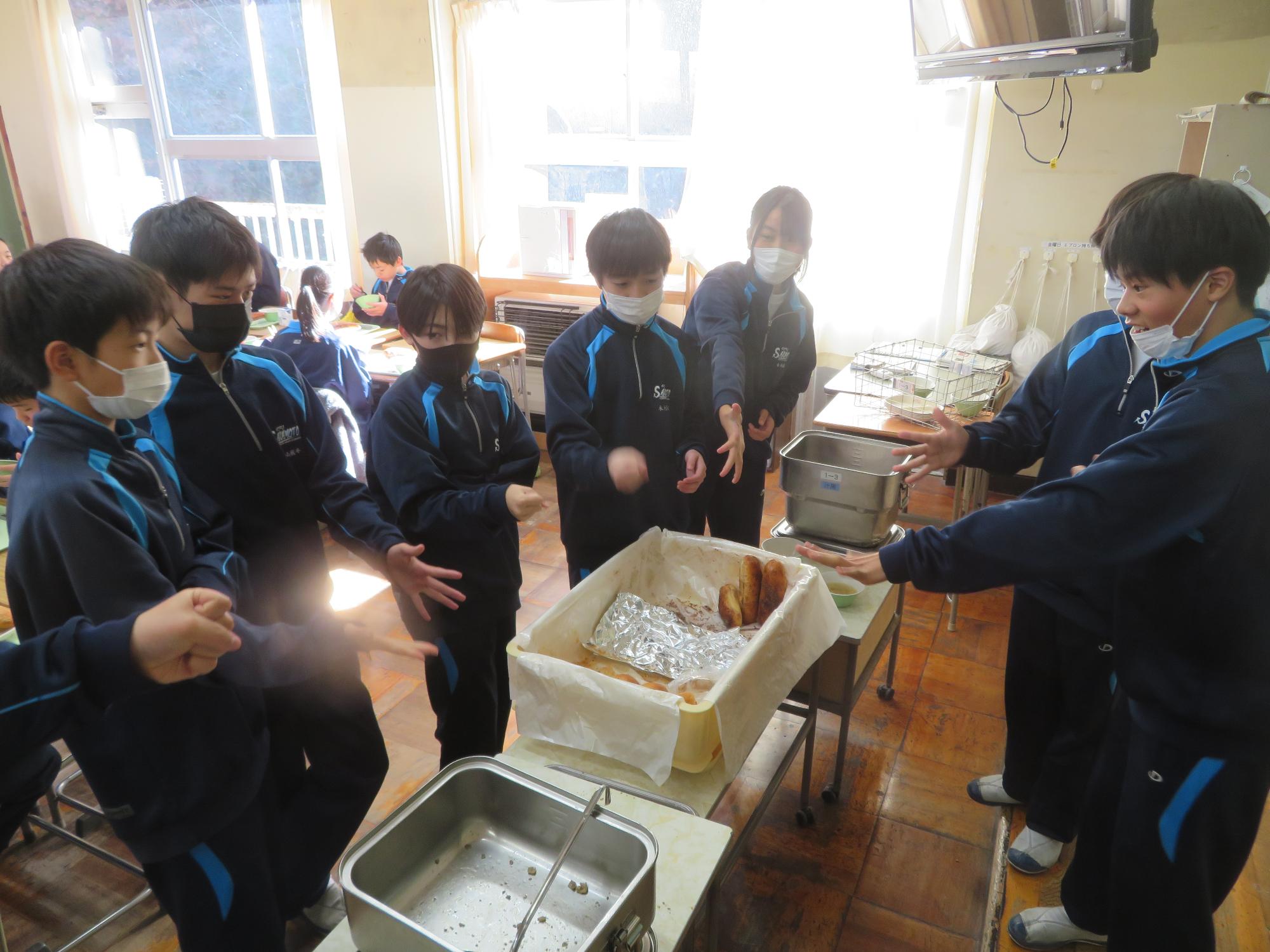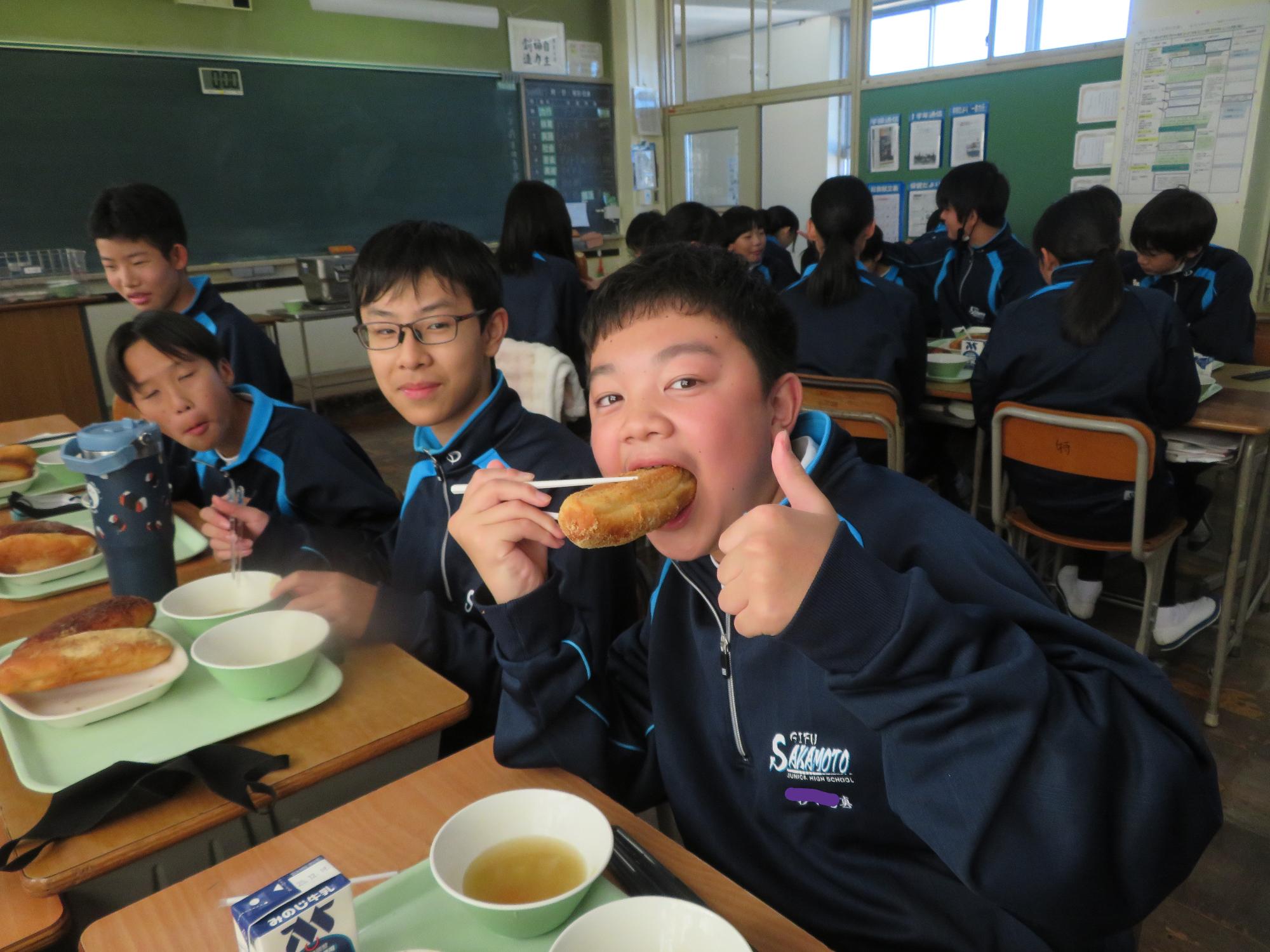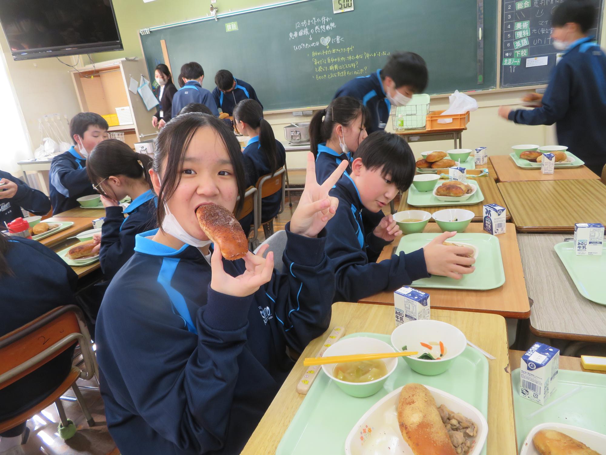 今日の給食のメニューは揚げパン。砂糖をまぶしたパンと、きなこをまぶしたパンが登場しました。朝から生徒たちがウキウキしていました。よく聞くと坂本小の時は揚げパンの調理ができなく、揚げパンは給食に出ていなかったとのこと。しかも、今年度初めての揚げパンの登場だったようです。1年生の揚げパンの衝撃はすごいものがありました。「おいしそう!」「最高!どんどん給食で出してもらいたい。」「ところでどうやって食べるの?」。残った揚げパンのじゃんけん選手権はどのクラスもすさまじいものでした。いつも以上に給食時間が盛り上がった今日の坂中でした。