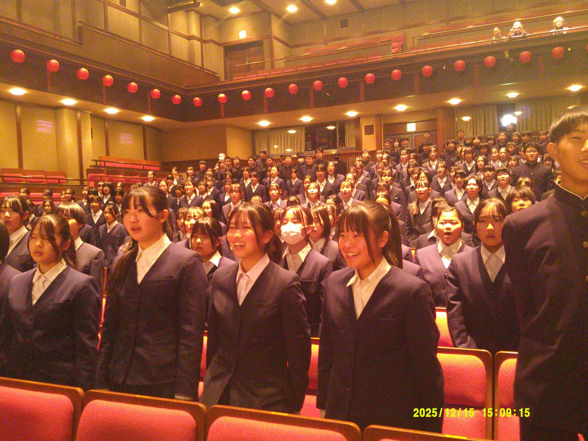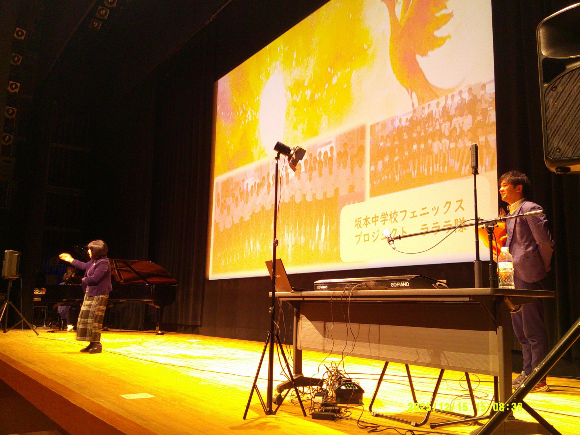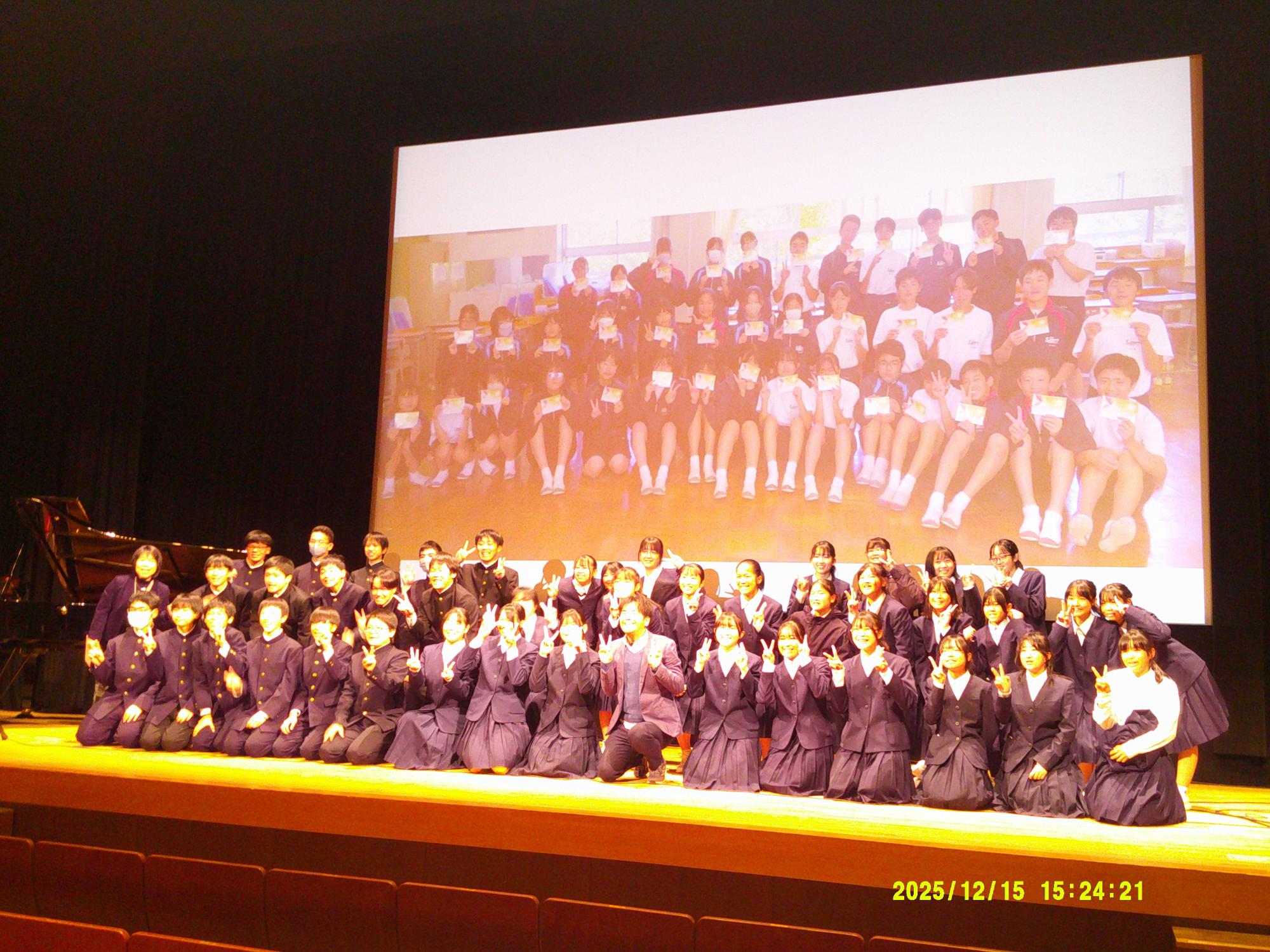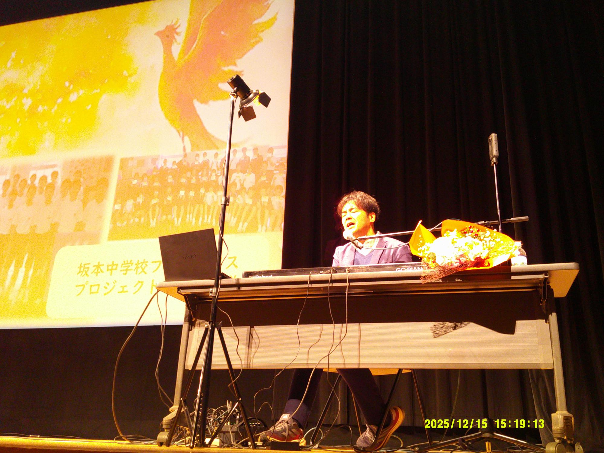 作曲家の弓削田先生によるコンサートが東美濃ふれあいセンターで行われました。弓削田先生は、透き通った歌声と心温まり語りで、私たちにたくさんのメッセージを送って下さいました。弓削田先生作曲の『越えてゆけ』『フェニックス』の歌からは、別れや寂しさはあるけれど、それを乗り越える勇気や決意の大切さを感じました。また『幸せになあれ』の歌からは、自らの名前に込められた祈りを忘れず、自他の命の大切さ、すべての命が輝く大切さを強く感じました。弓削田さんの歌声や語りに感動し、涙を流している生徒もたくさん見られました。圧巻は最後の『フェニクス』の合唱。弓削田さんも涙を流して感動してくださるなど、心に響く合唱を届けられた坂中生でした。心が温まるステキな時間を過ごすことができたコンサートでした。ちょうど人権週間として、命の尊さと人権意識の大切さについても考えることができた一日でした。