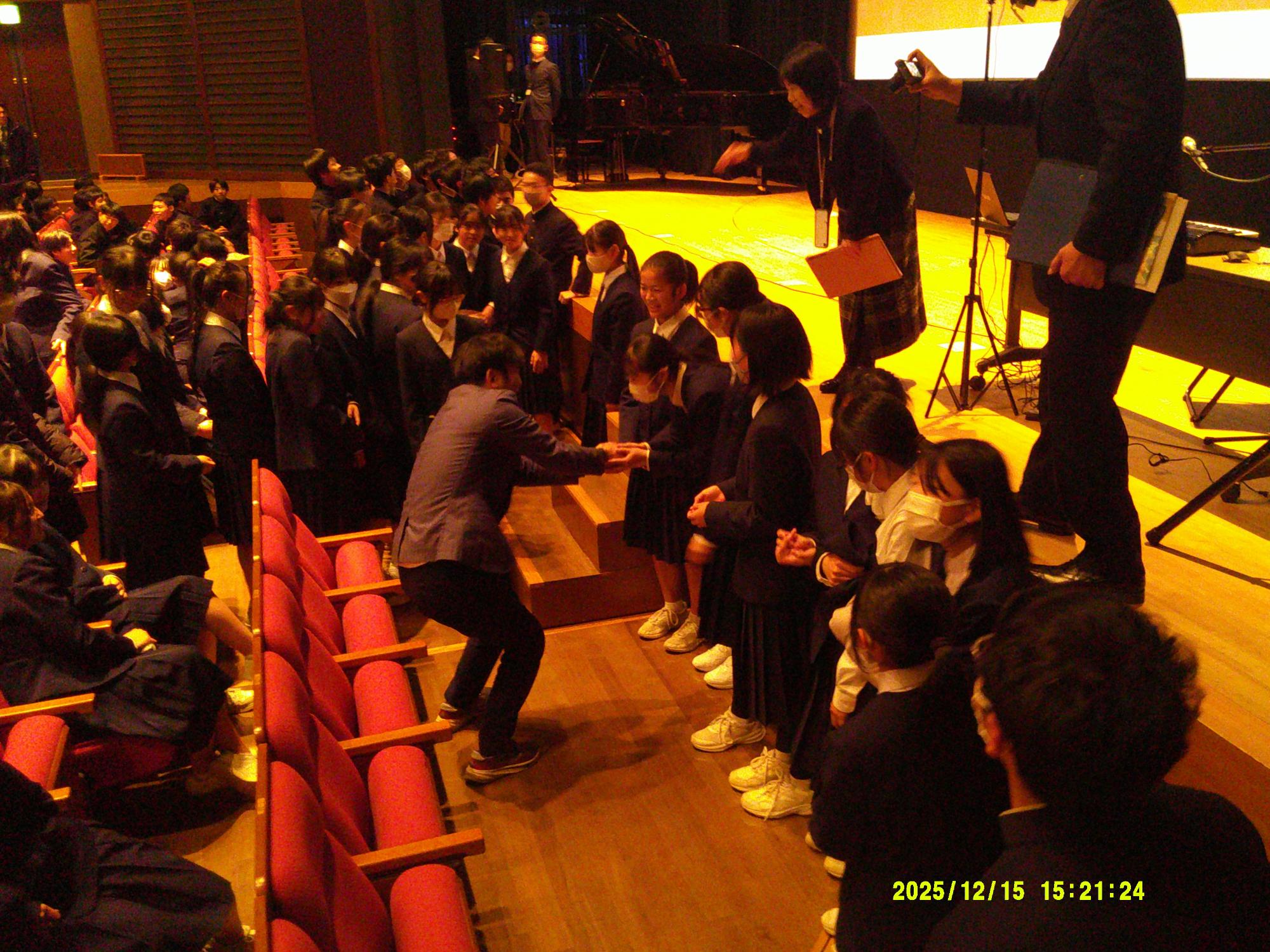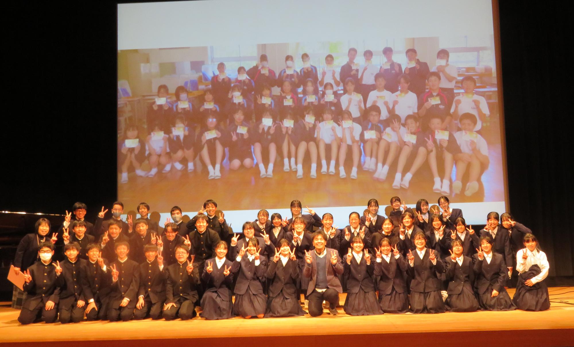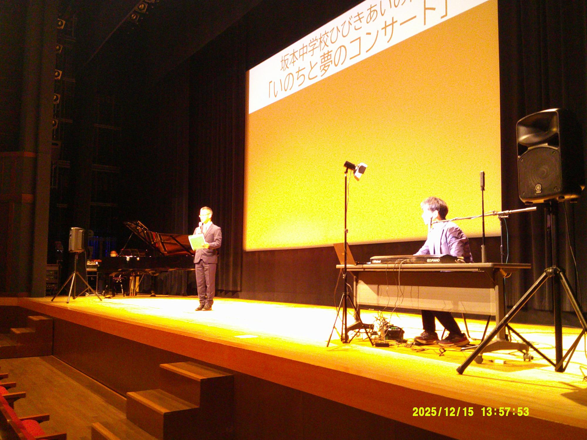 作曲家の弓削田先生によるコンサートが東美濃ふれあいセンターで行われました。弓削田先生は、透き通った歌声と心温まり語りで、私たちにたくさんのメッセージを送って下さいました。弓削田先生作曲の『越えてゆけ』『フェニックス』の歌からは、別れや寂しさはあるけれど、それを乗り越える勇気や決意の大切さを感じました。また『幸せになあれ』の歌からは、自らの名前に込められた祈りを忘れず、自他の命の大切さ、すべての命が輝く大切さを強く感じました。弓削田さんの歌声や語りに感動し、涙を流している生徒もたくさん見られました。圧巻は最後の『フェニクス』の合唱。弓削田さんも涙を流して感動してくださるなど、心に響く合唱を届けられた坂中生でした。心が温まるステキな時間を過ごすことができたコンサートでした。ちょうど人権週間として、命の尊さと人権意識の大切さについても考えることができた一日でした。