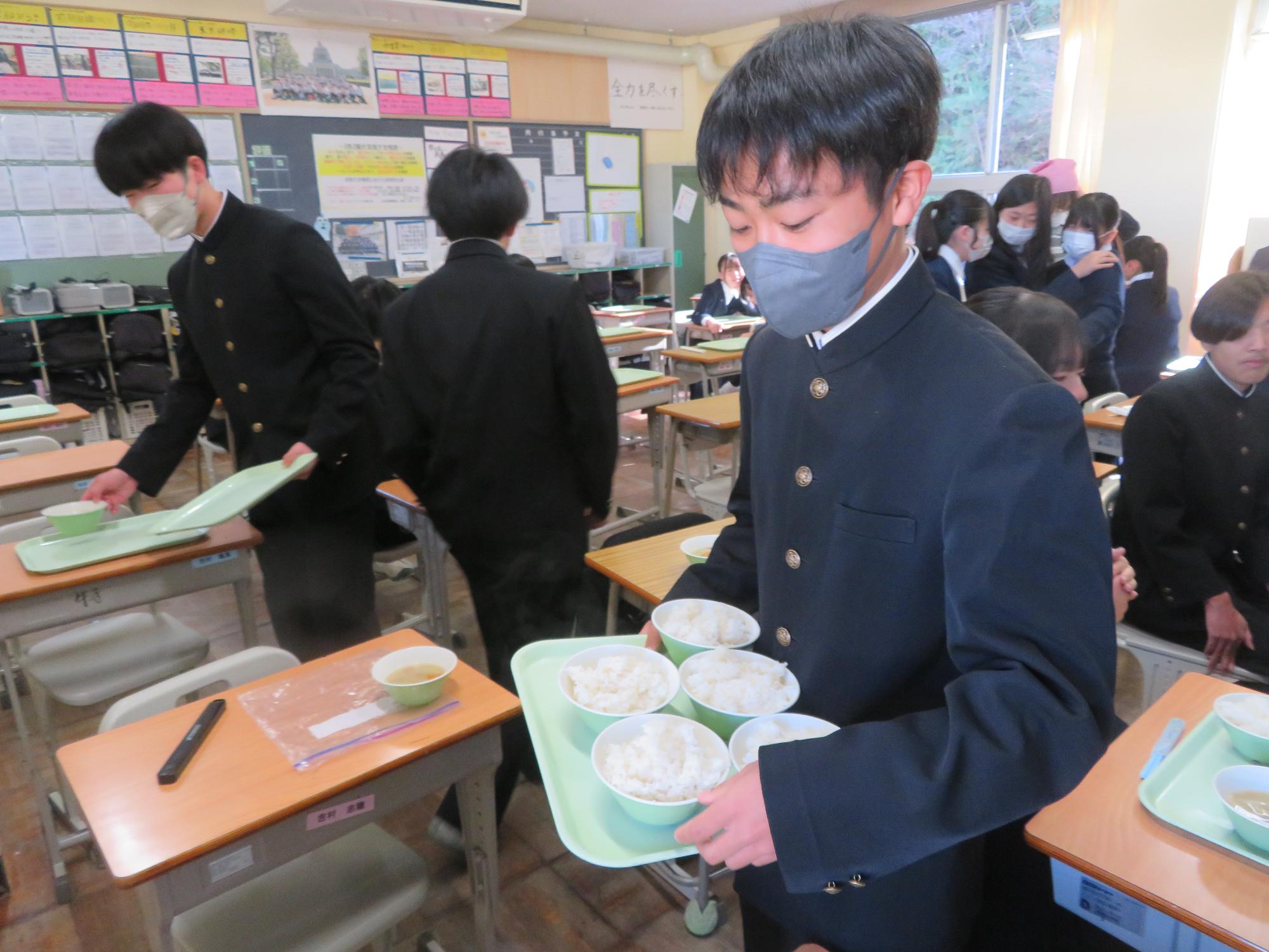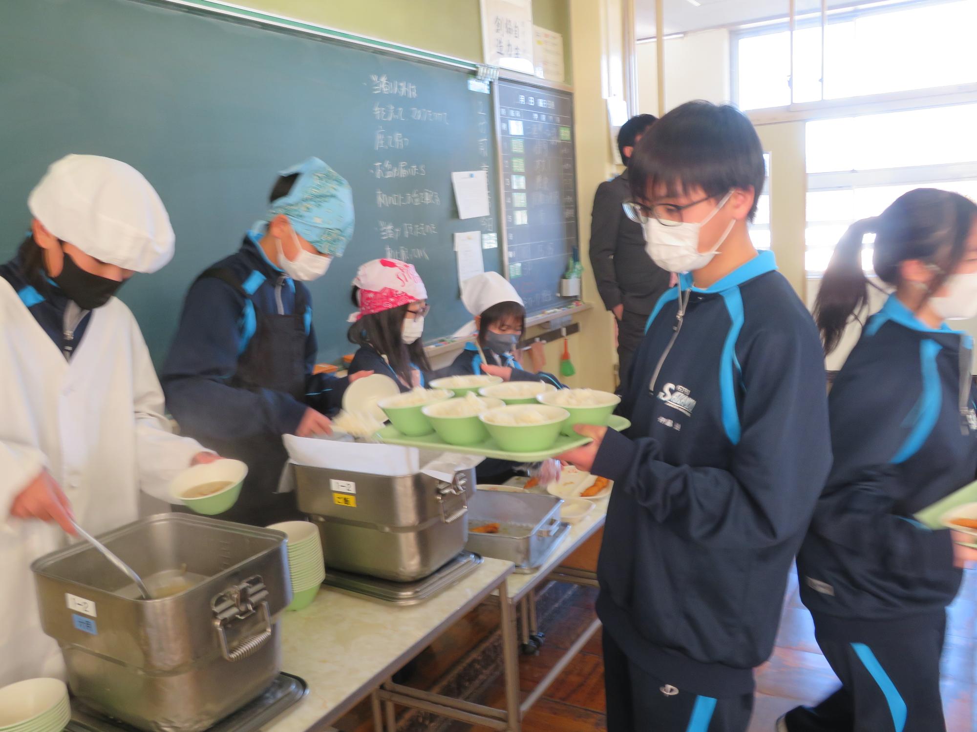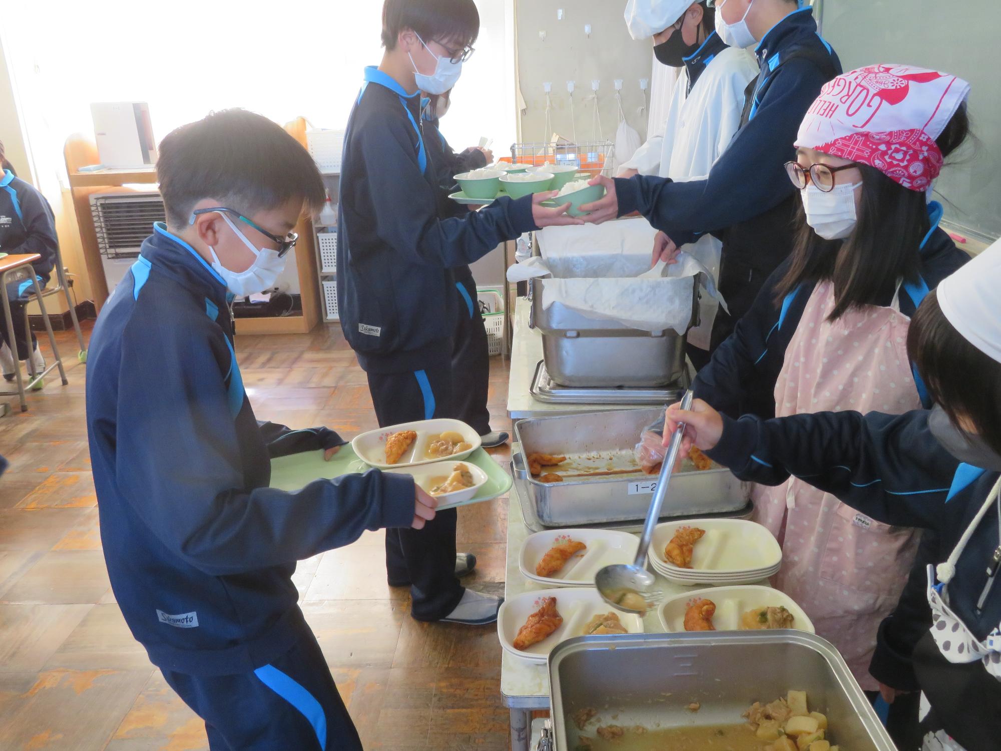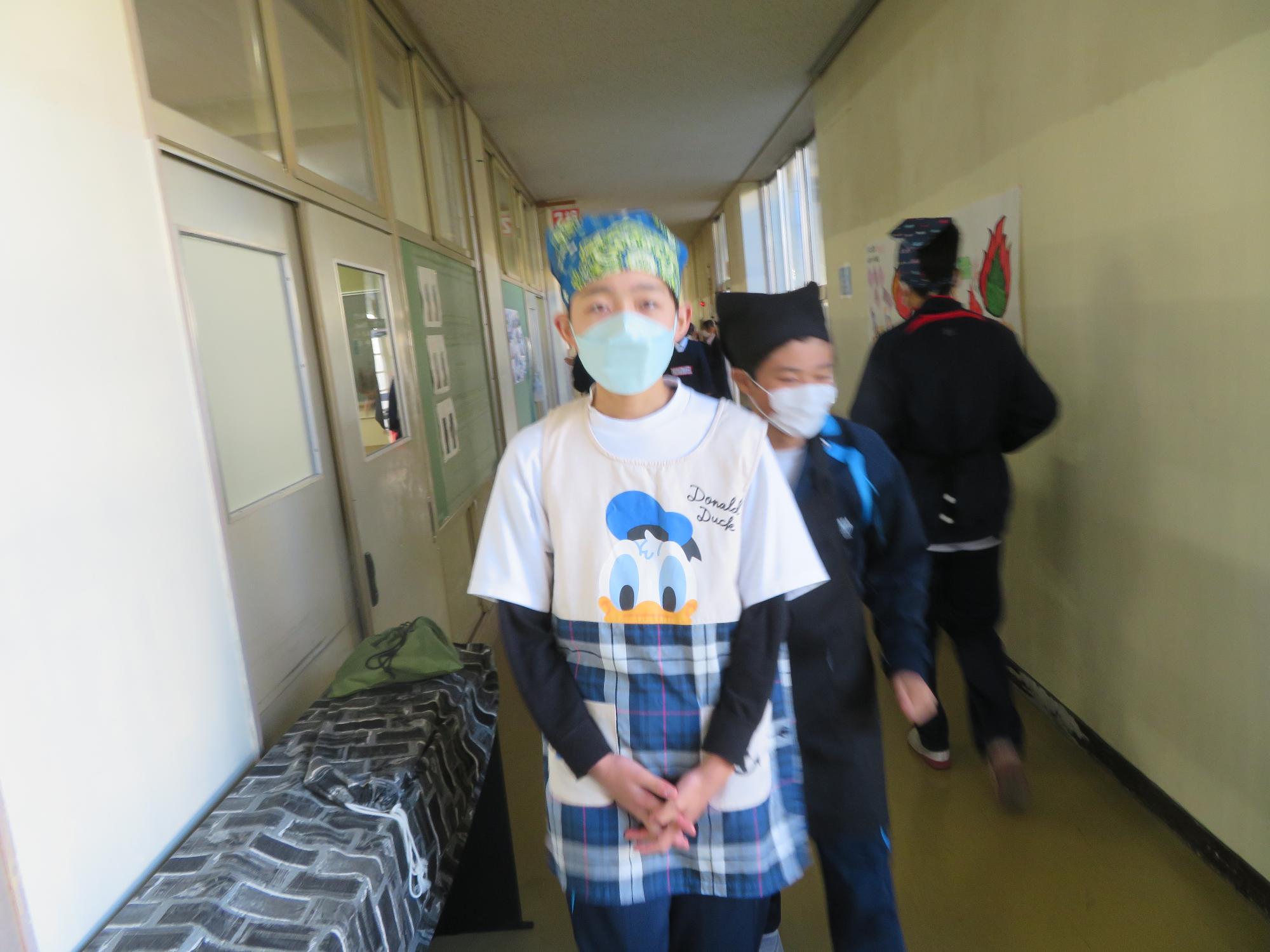 いよいよ1月8日から坂本給食調理場の運用が始まります。それに伴い、給食の配膳方法が変更となります。具体的には各自のおぼんが使用できなくなり、配膳用のおぼんなどで素早く配ることになります。また食べる際は、ナフキンが必要となります。今日は、各自のおぼんを使用することなく、配膳する練習を各クラスで行いました。ちょうど学校用エプロンを保管する週であり、myエプロンで配膳を行いました。配膳方法は変更になっても、するとよいことを判断して動く坂中生でした。