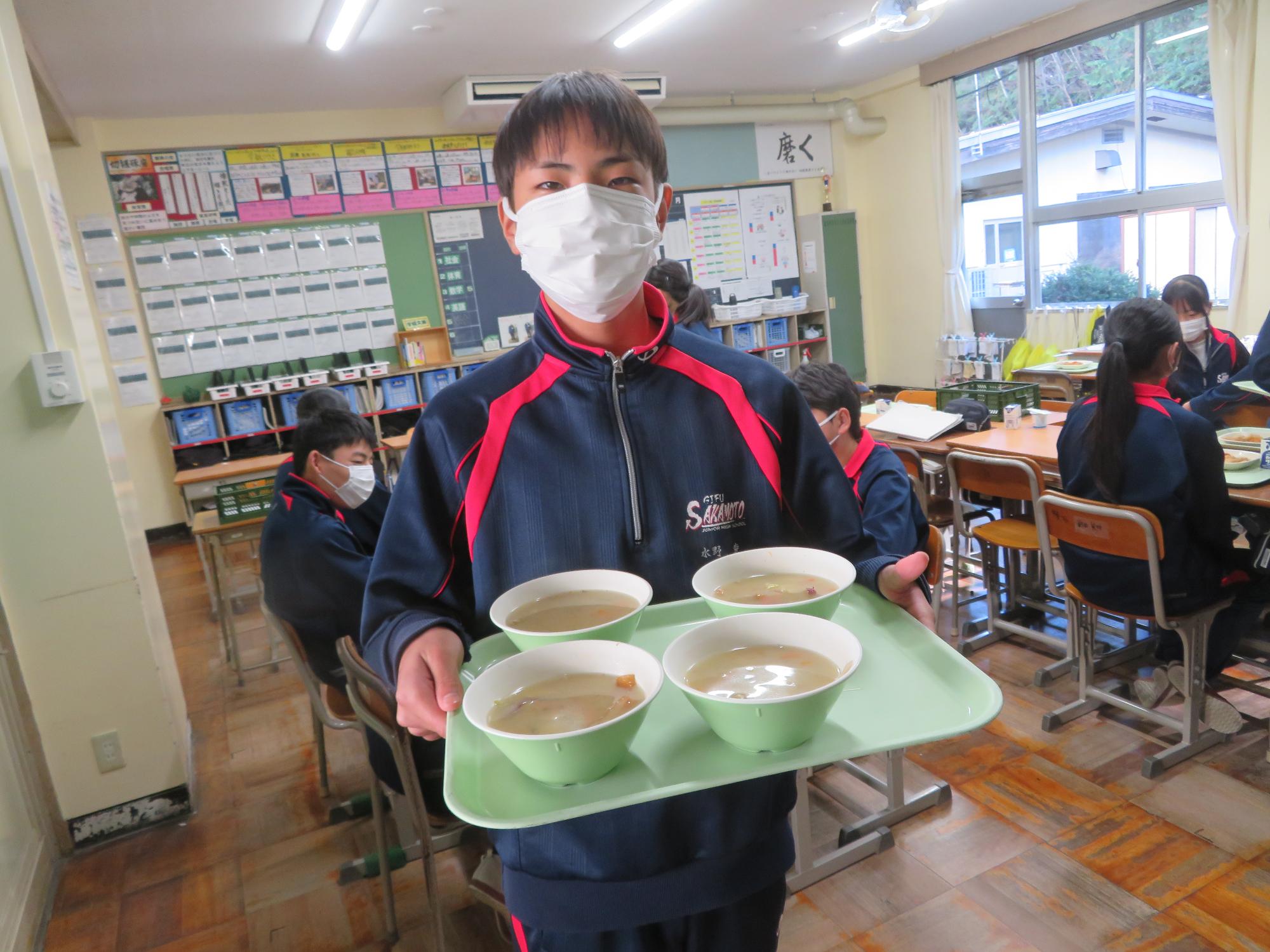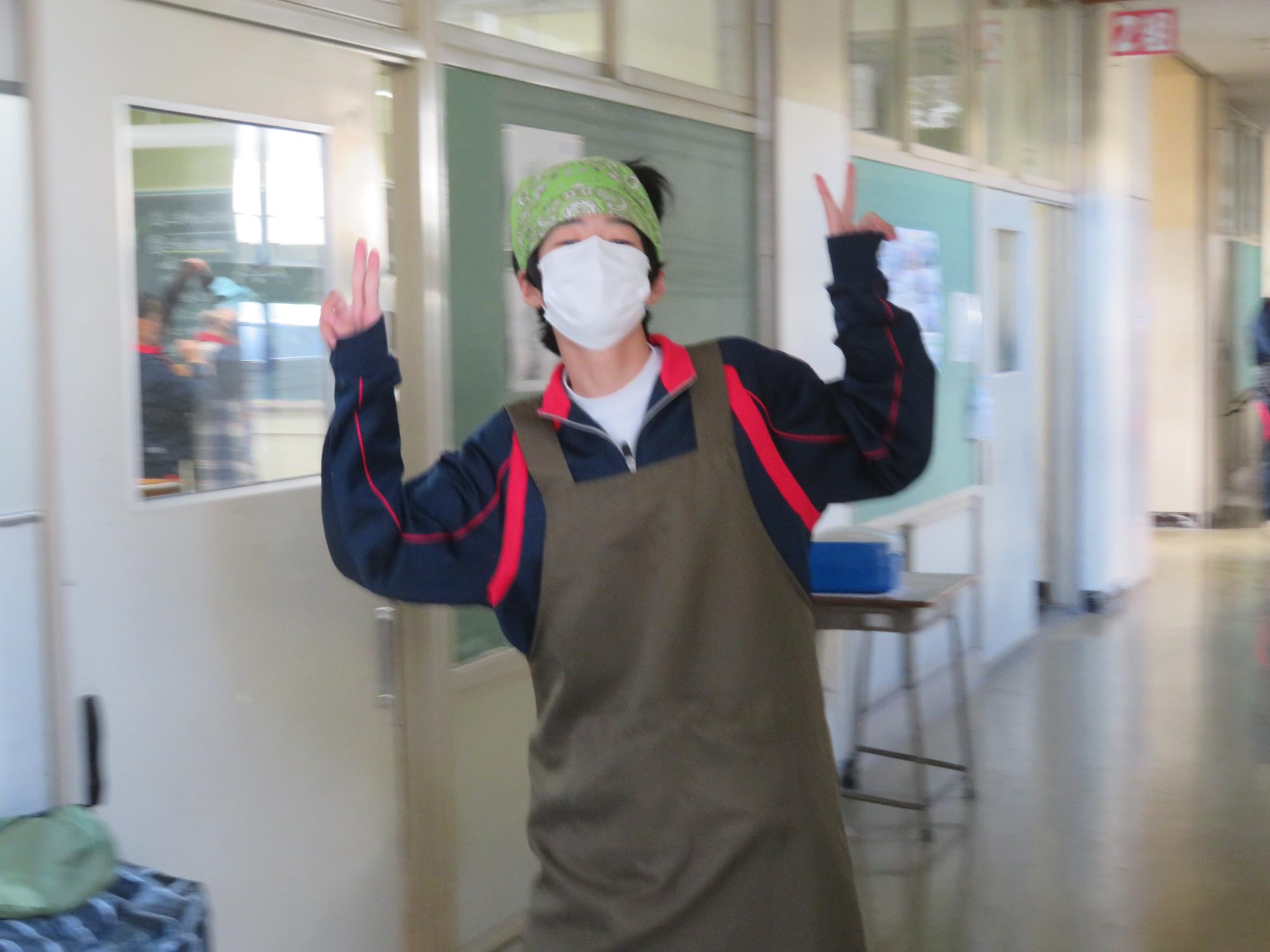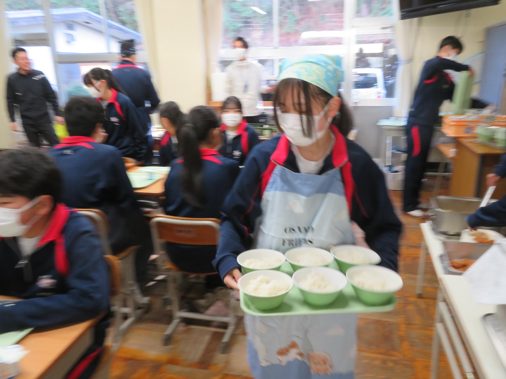 いよいよ1月8日から坂本給食調理場の運用が始まります。それに伴い、給食の配膳方法が変更となります。具体的には各自のおぼんが使用できなくなり、配膳用のおぼんなどで素早く配ることになります。また食べる際は、ナフキンが必要となります。今日は、各自のおぼんを使用することなく、配膳する練習を各クラスで行いました。ちょうど学校用エプロンを保管する週であり、myエプロンで配膳を行いました。配膳方法は変更になっても、するとよいことを判断して動く坂中生でした。