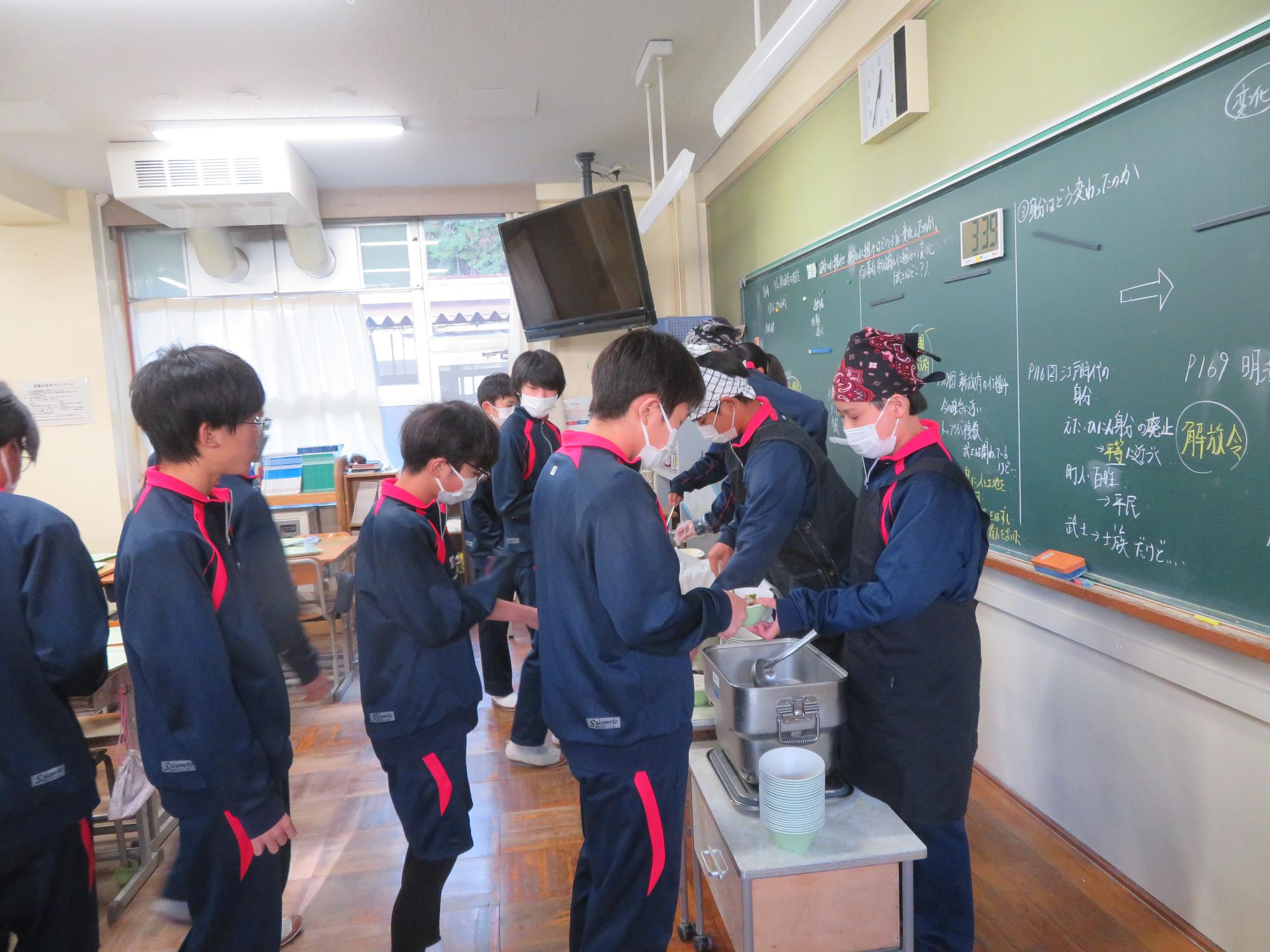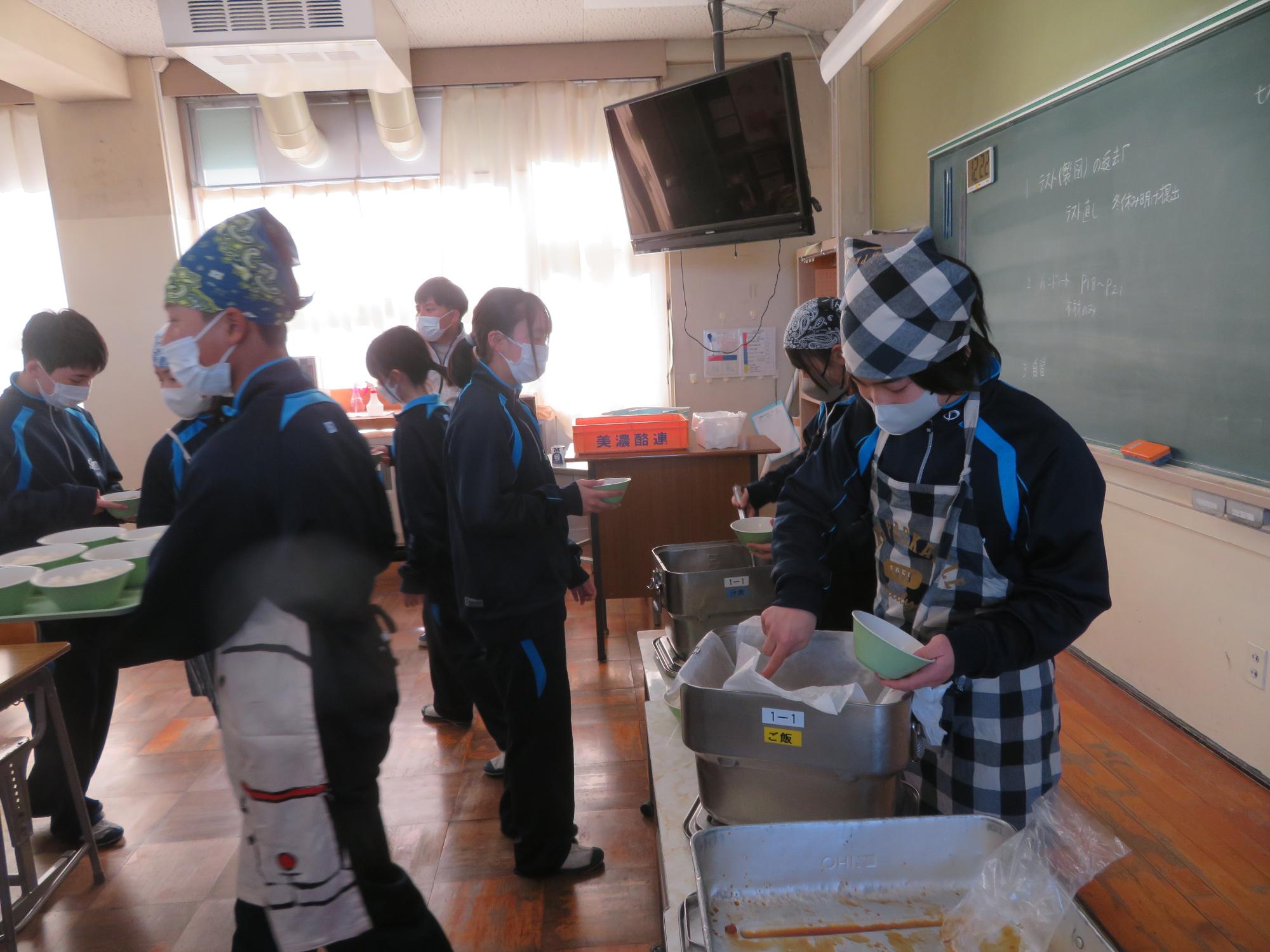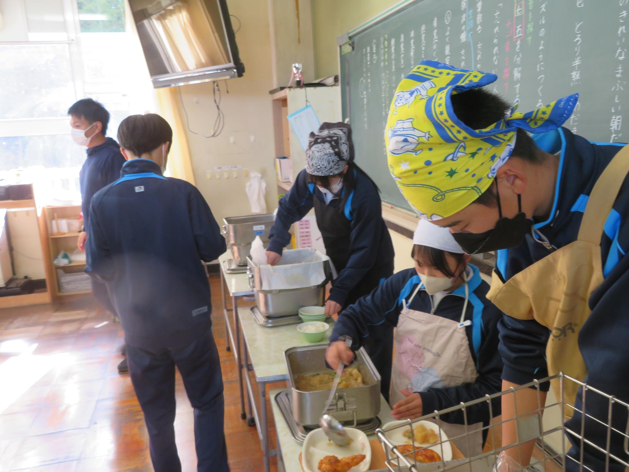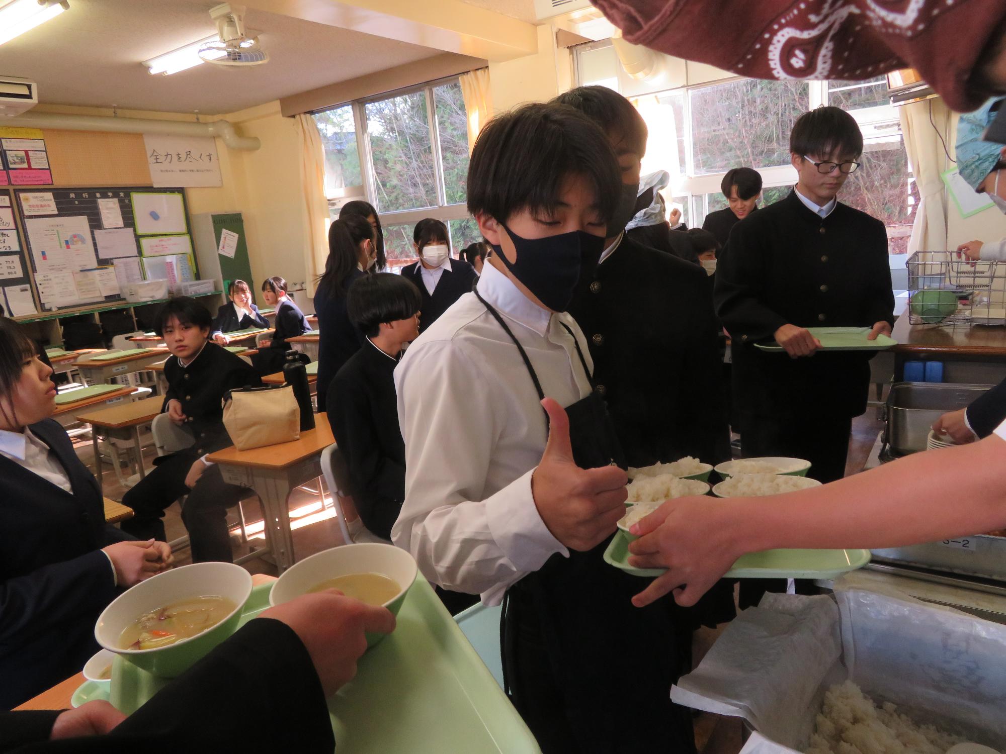 いよいよ1月8日から坂本給食調理場の運用が始まります。それに伴い、給食の配膳方法が変更となります。具体的には各自のおぼんが使用できなくなり、配膳用のおぼんなどで素早く配ることになります。また食べる際は、ナフキンが必要となります。今日は、各自のおぼんを使用することなく、配膳する練習を各クラスで行いました。ちょうど学校用エプロンを保管する週であり、myエプロンで配膳を行いました。配膳方法は変更になっても、するとよいことを判断して動く坂中生でした。