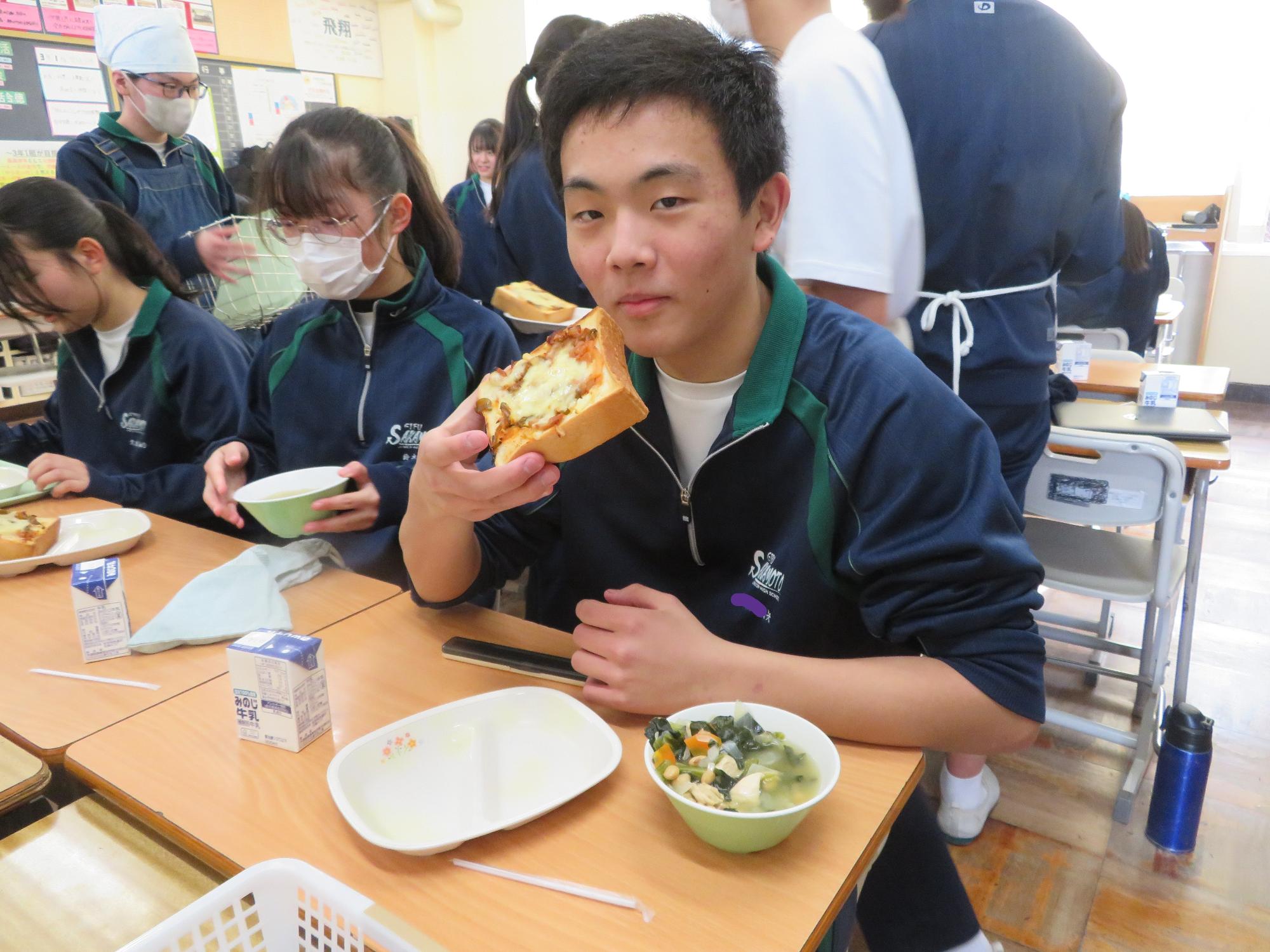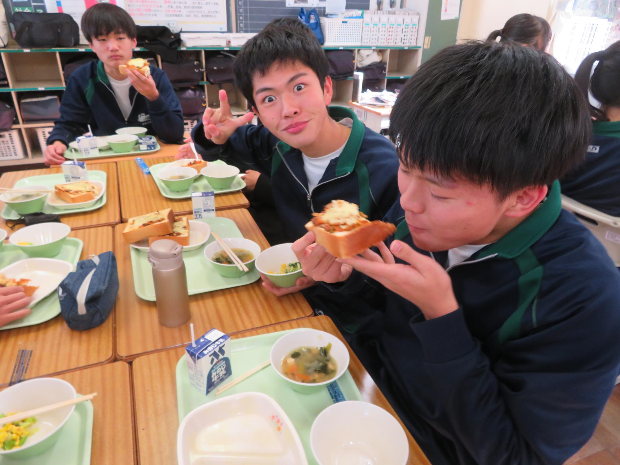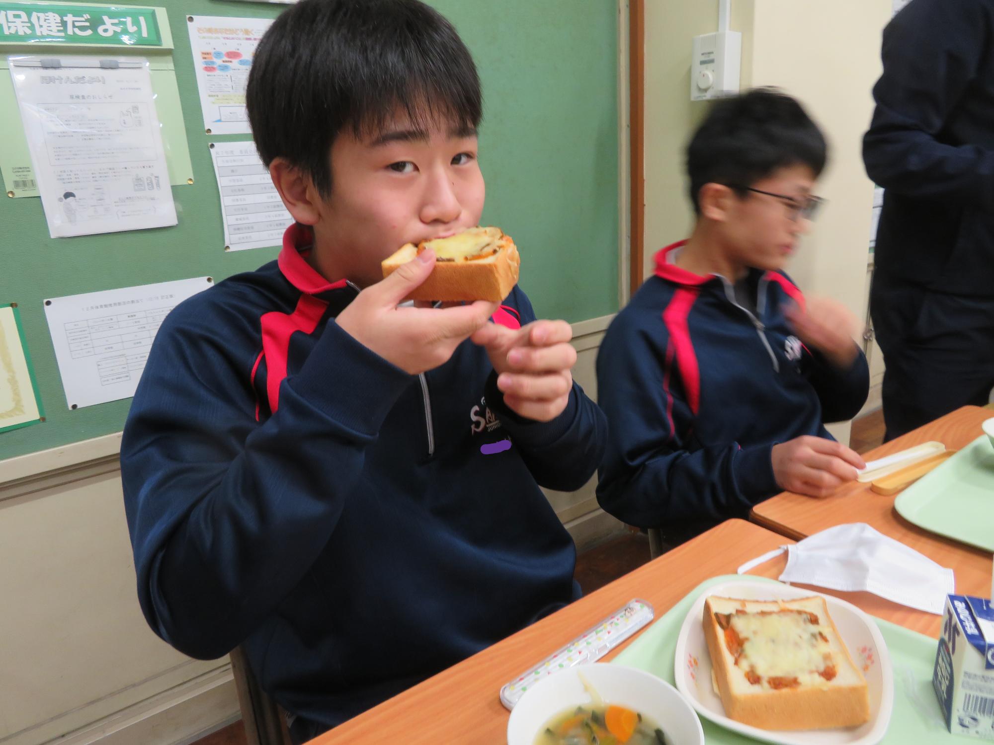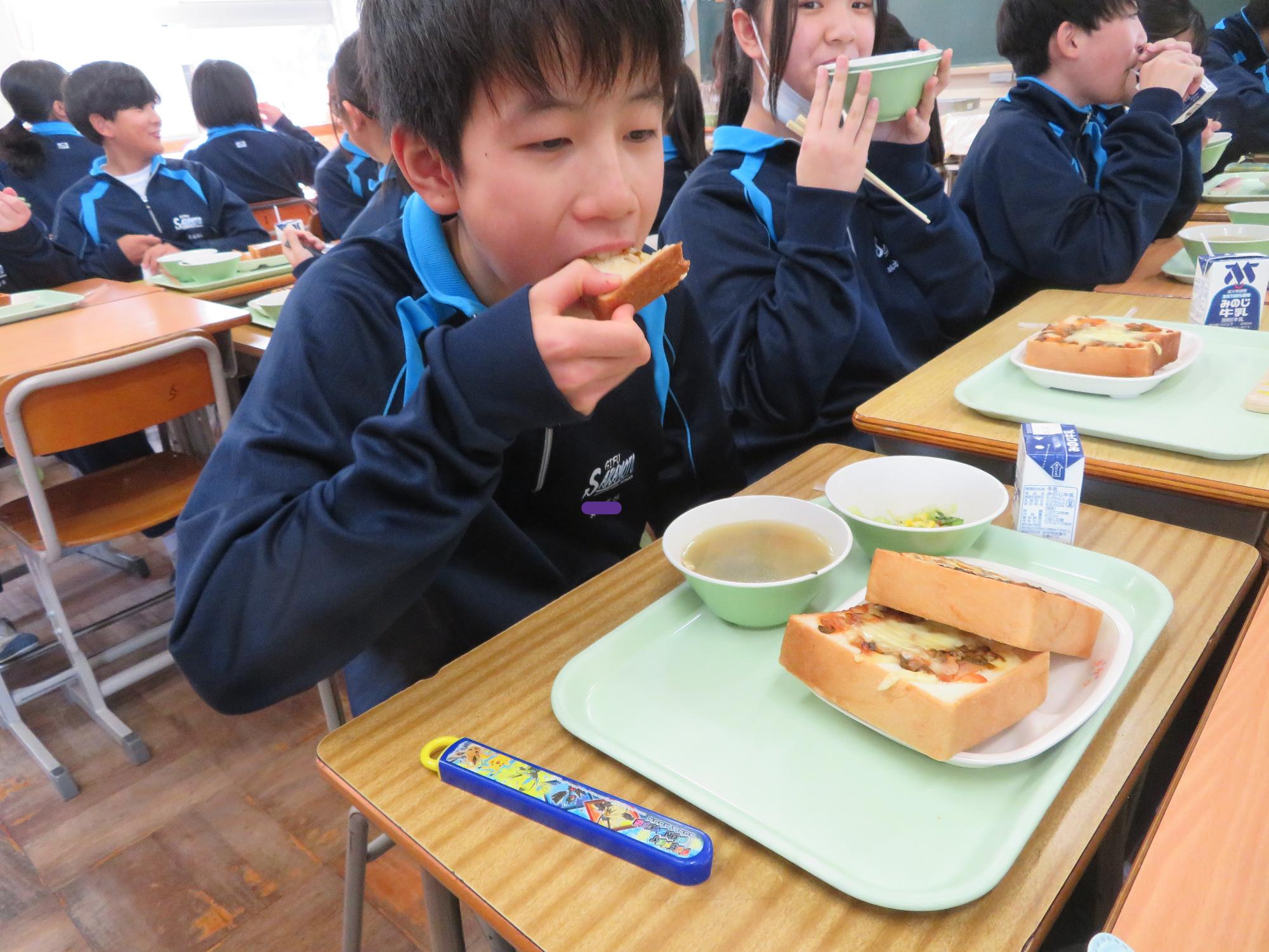 連日の給食情報です。今日の給食メニューは「ピザトースト」。初めての登場です。期末テスト2日目の3年生からも、朝からテスト勉強をしながら「ピザトーストってどんな形で給食に出るんですか?」と純粋な質問を受けました。登場したのは厚切りパンにピーマンや玉ねぎのスライスがのり、ピザソースとチーズがコーティングされた見た目もおいしそうなトースト。調理員さんの工夫で温かさも少し残って給食に登場しました。坂中生が大きな口を開け、ピザトーストをおいしそうに食べる給食時間の光景でした。