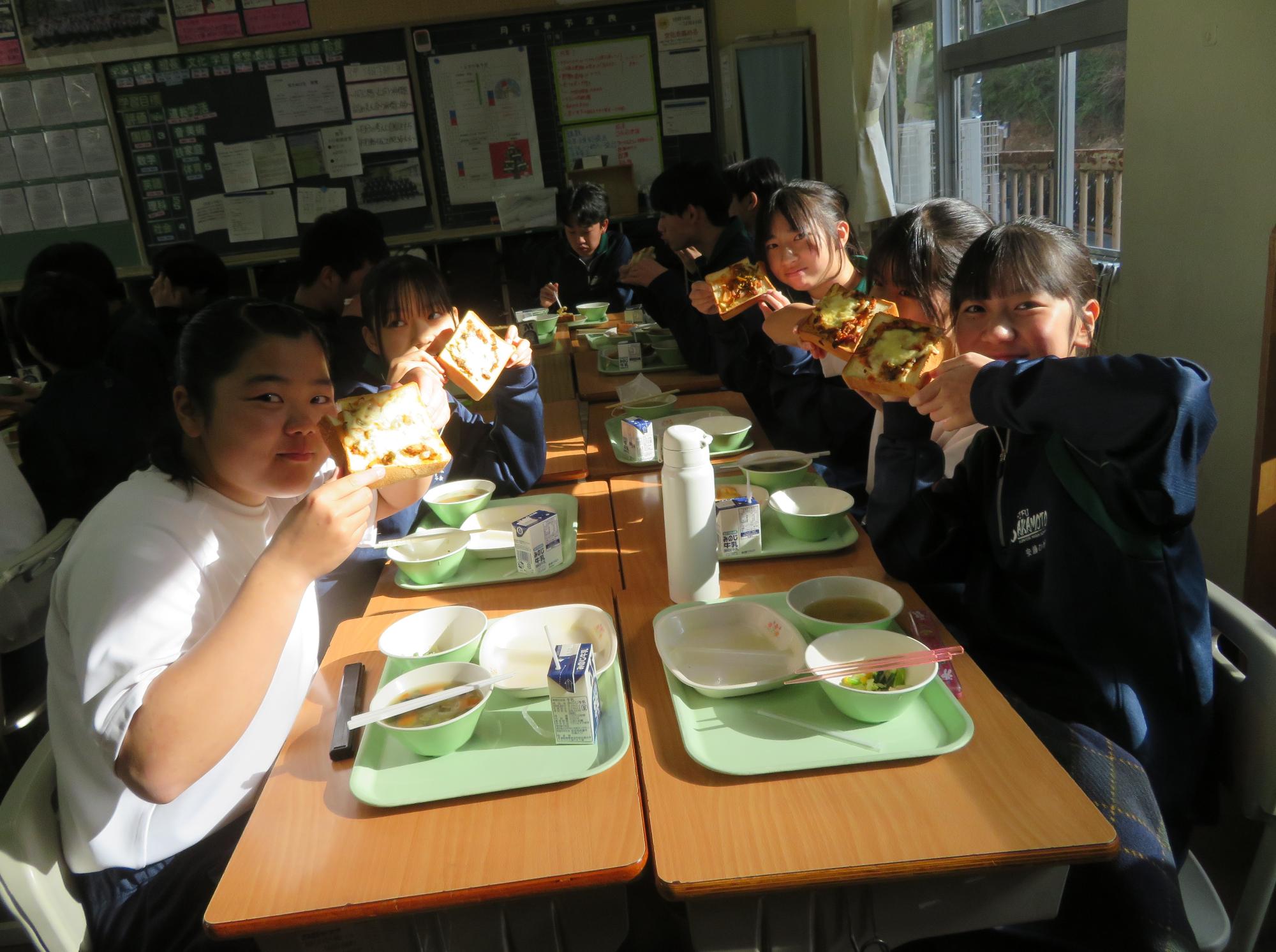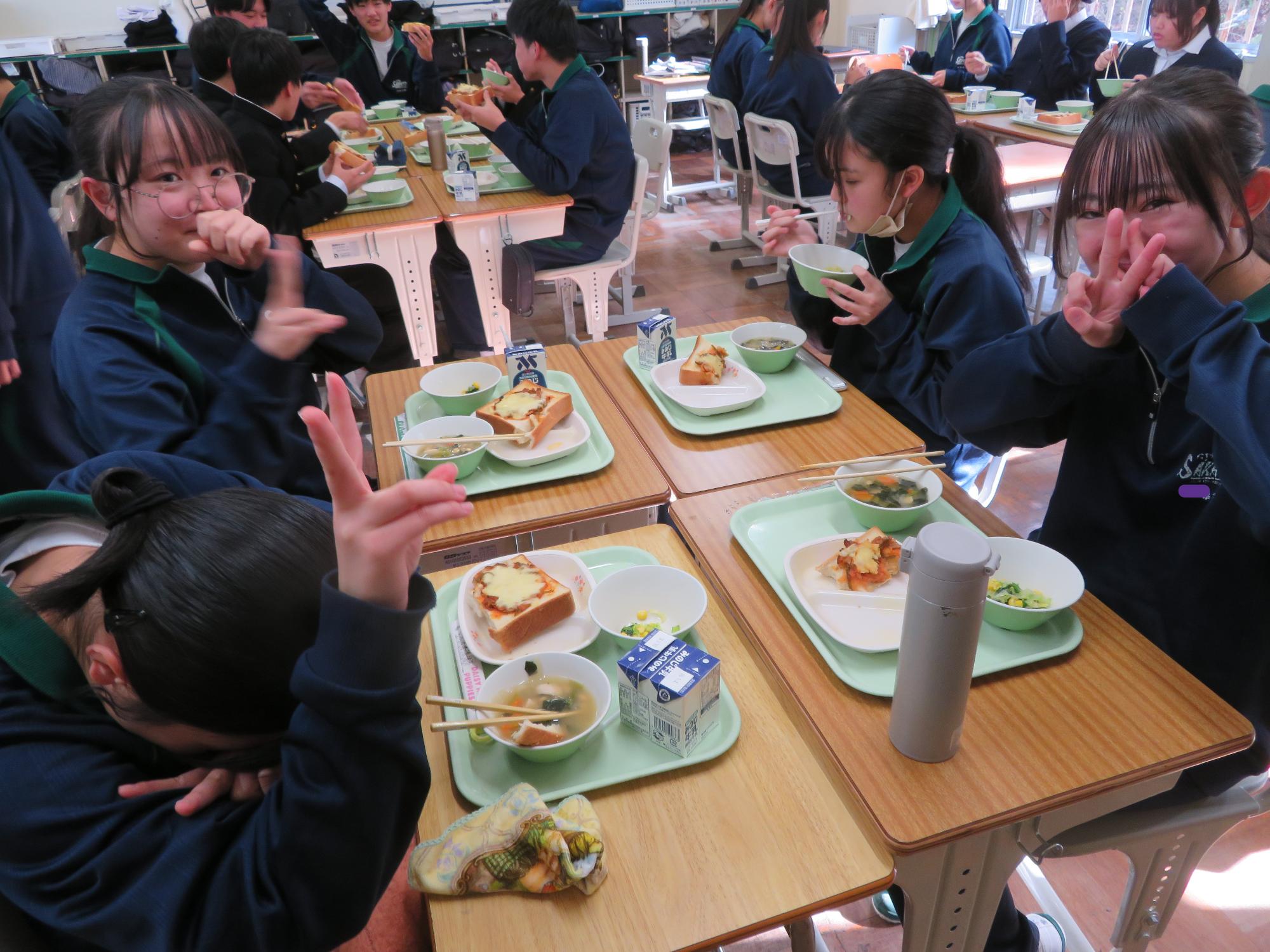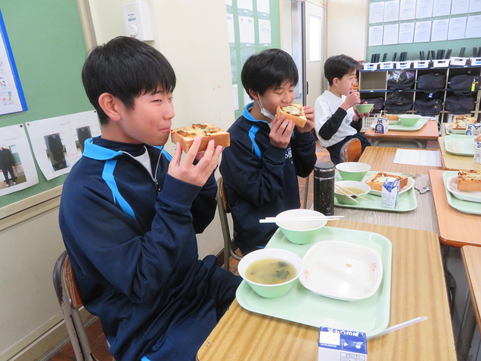 連日の給食情報です。今日の給食メニューは「ピザトースト」。初めての登場です。期末テスト2日目の3年生からも、朝からテスト勉強をしながら「ピザトーストってどんな形で給食に出るんですか?」と純粋な質問を受けました。登場したのは厚切りパンにピーマンや玉ねぎのスライスがのり、ピザソースとチーズがコーティングされた見た目もおいしそうなトースト。調理員さんの工夫で温かさも少し残って給食に登場しました。坂中生が大きな口を開け、ピザトーストをおいしそうに食べる給食時間の光景でした。