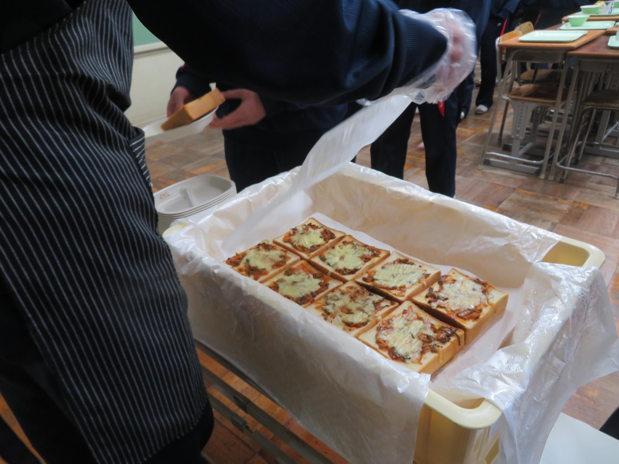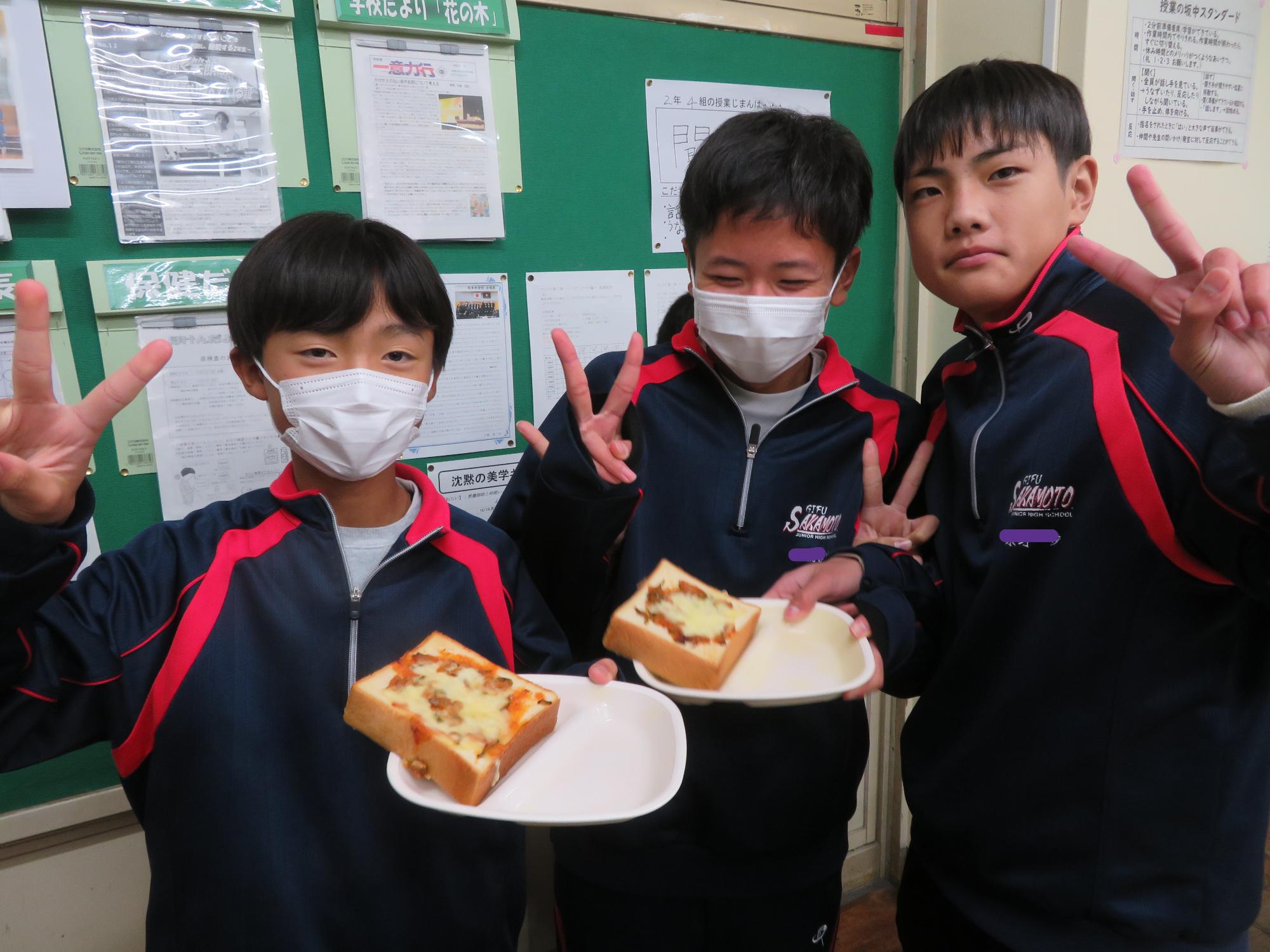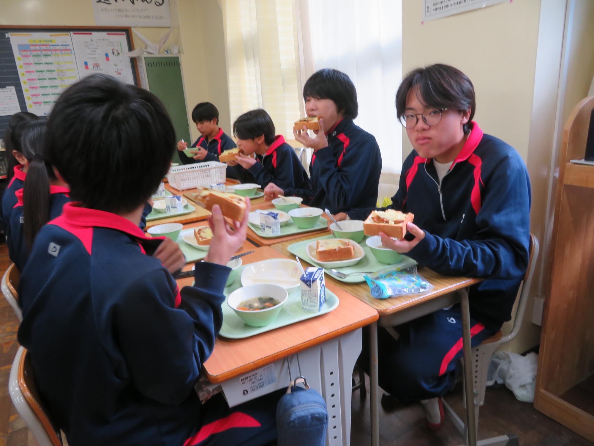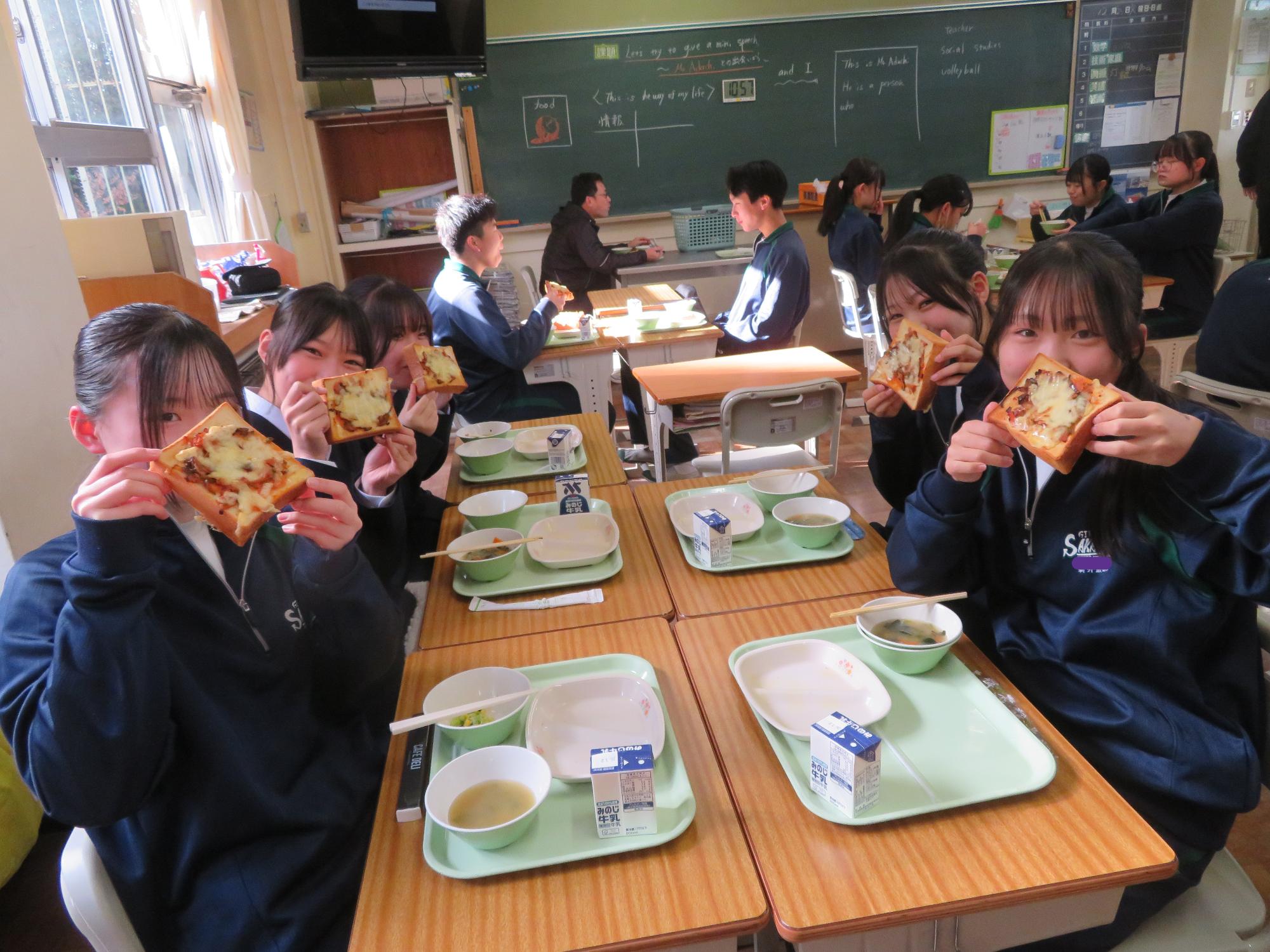 連日の給食情報です。今日の給食メニューは「ピザトースト」。初めての登場です。期末テスト2日目の3年生からも、朝からテスト勉強をしながら「ピザトーストってどんな形で給食に出るんですか?」と純粋な質問を受けました。登場したのは厚切りパンにピーマンや玉ねぎのスライスがのり、ピザソースとチーズがコーティングされた見た目もおいしそうなトースト。調理員さんの工夫で温かさも少し残って給食に登場しました。坂中生が大きな口を開け、ピザトーストをおいしそうに食べる給食時間の光景でした。