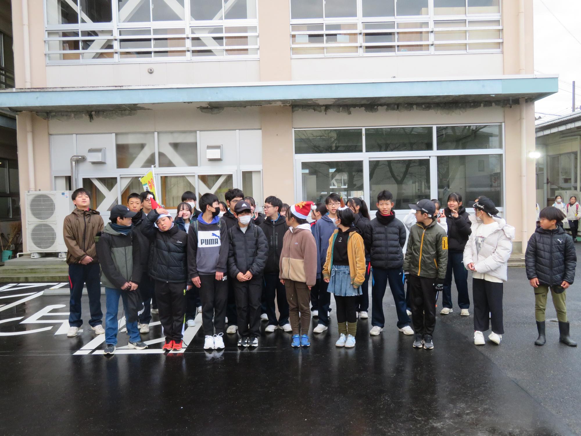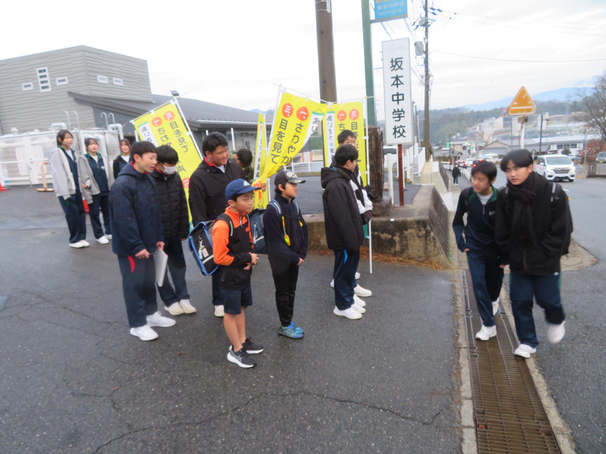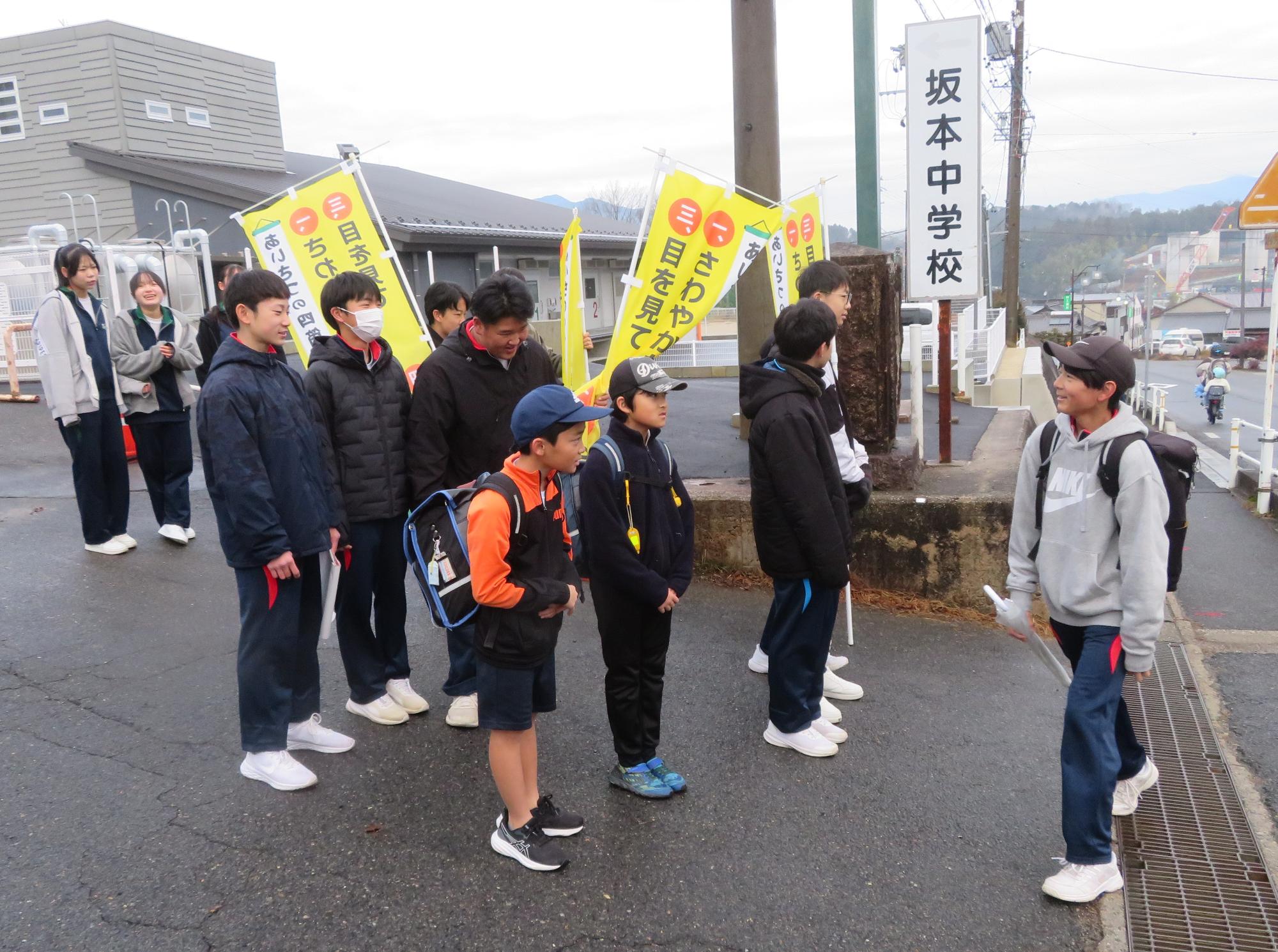 冬休み前最後の小中合同あいさつ運動 更新日:2025年12月25日 冬休み前最後の生徒会主導あいさつ運動を行いました。生徒会の呼びかけにより、今日は、小中合同で行いました。坂中生は約50名が小学校に出向き、小学生と一緒にあいさつ運動を行い、逆に小学校から約10名の児童会役員が坂中に来て、坂中生と一緒にあいさつ運動を行いました。ちょうどクリスマスということもあり、『メリークリスマス』とあいさつをしあう様子も見られ、ほのぼのとしたあいさつ運動の光景でした。