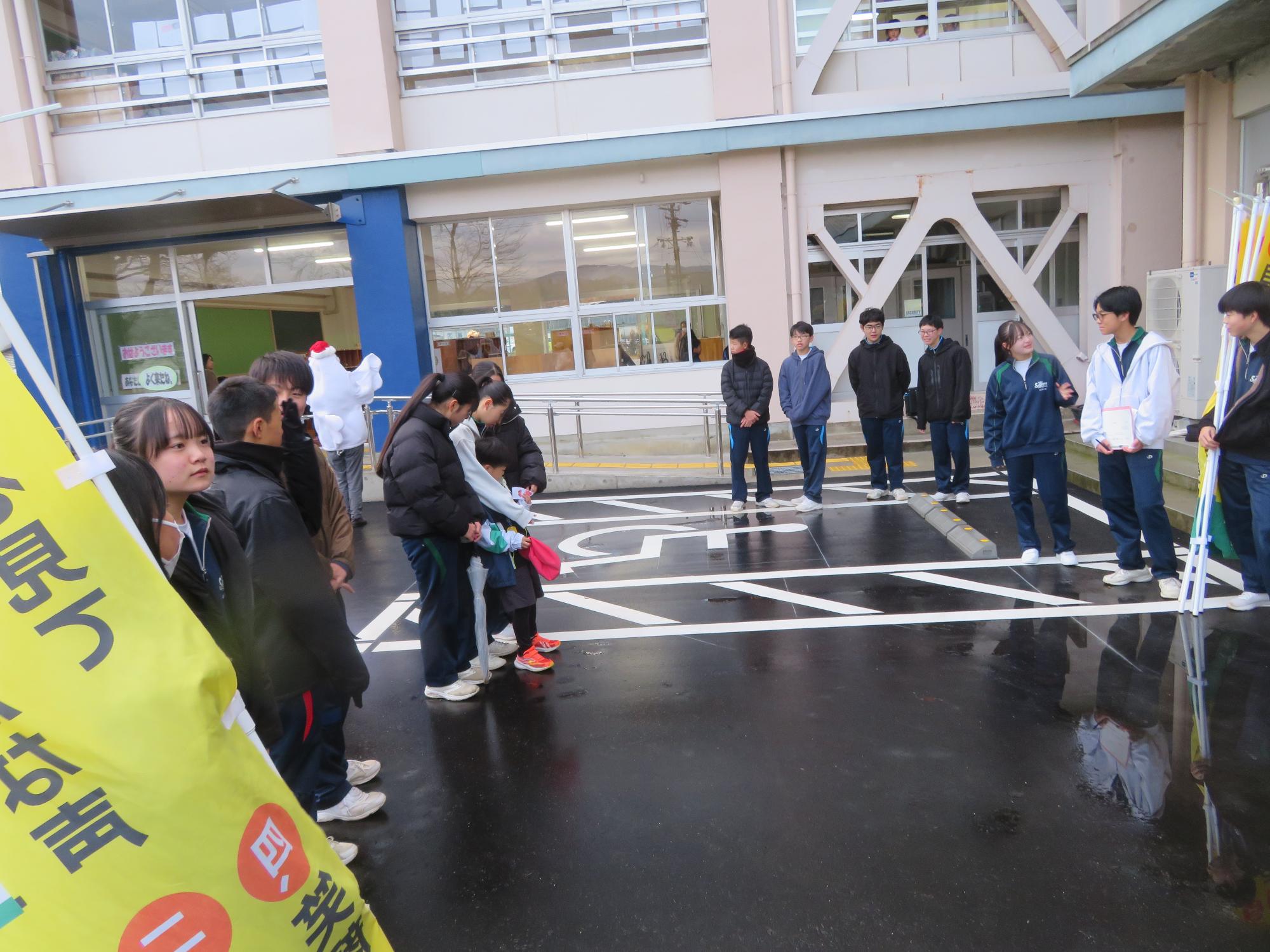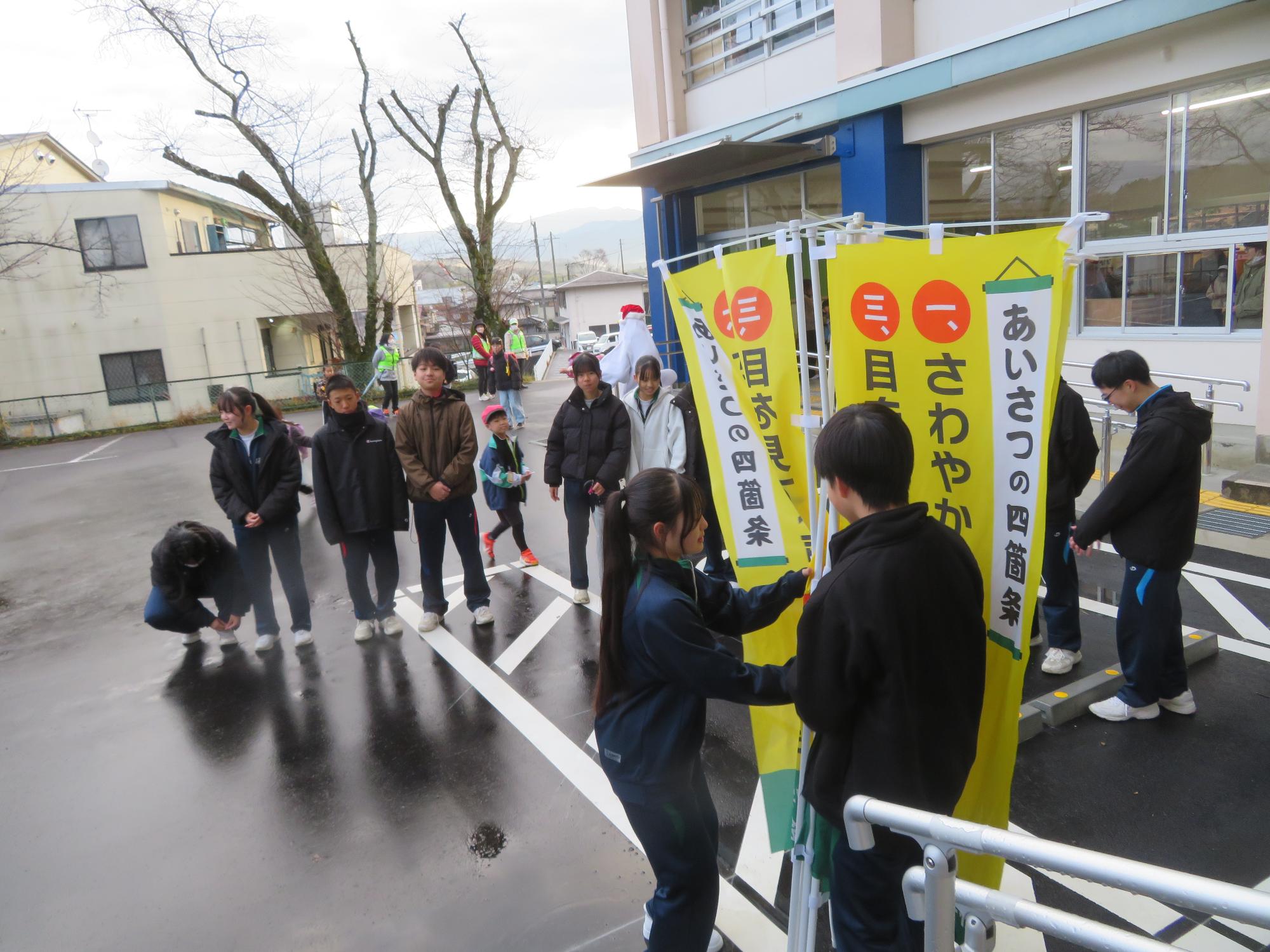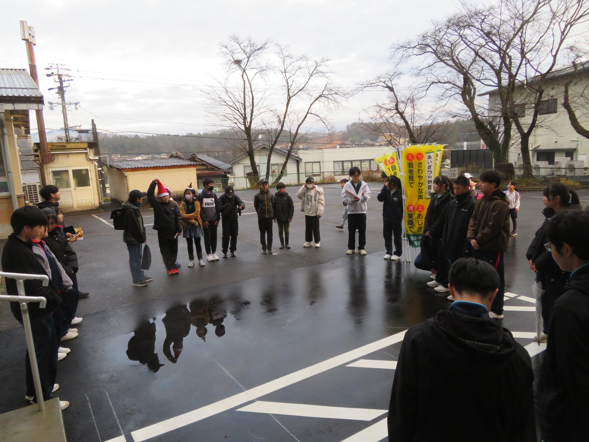 冬休み前最後の小中合同あいさつ運動 更新日:2025年12月25日 冬休み前最後の生徒会主導あいさつ運動を行いました。生徒会の呼びかけにより、今日は、小中合同で行いました。坂中生は約50名が小学校に出向き、小学生と一緒にあいさつ運動を行い、逆に小学校から約10名の児童会役員が坂中に来て、坂中生と一緒にあいさつ運動を行いました。ちょうどクリスマスということもあり、『メリークリスマス』とあいさつをしあう様子も見られ、ほのぼのとしたあいさつ運動の光景でした。