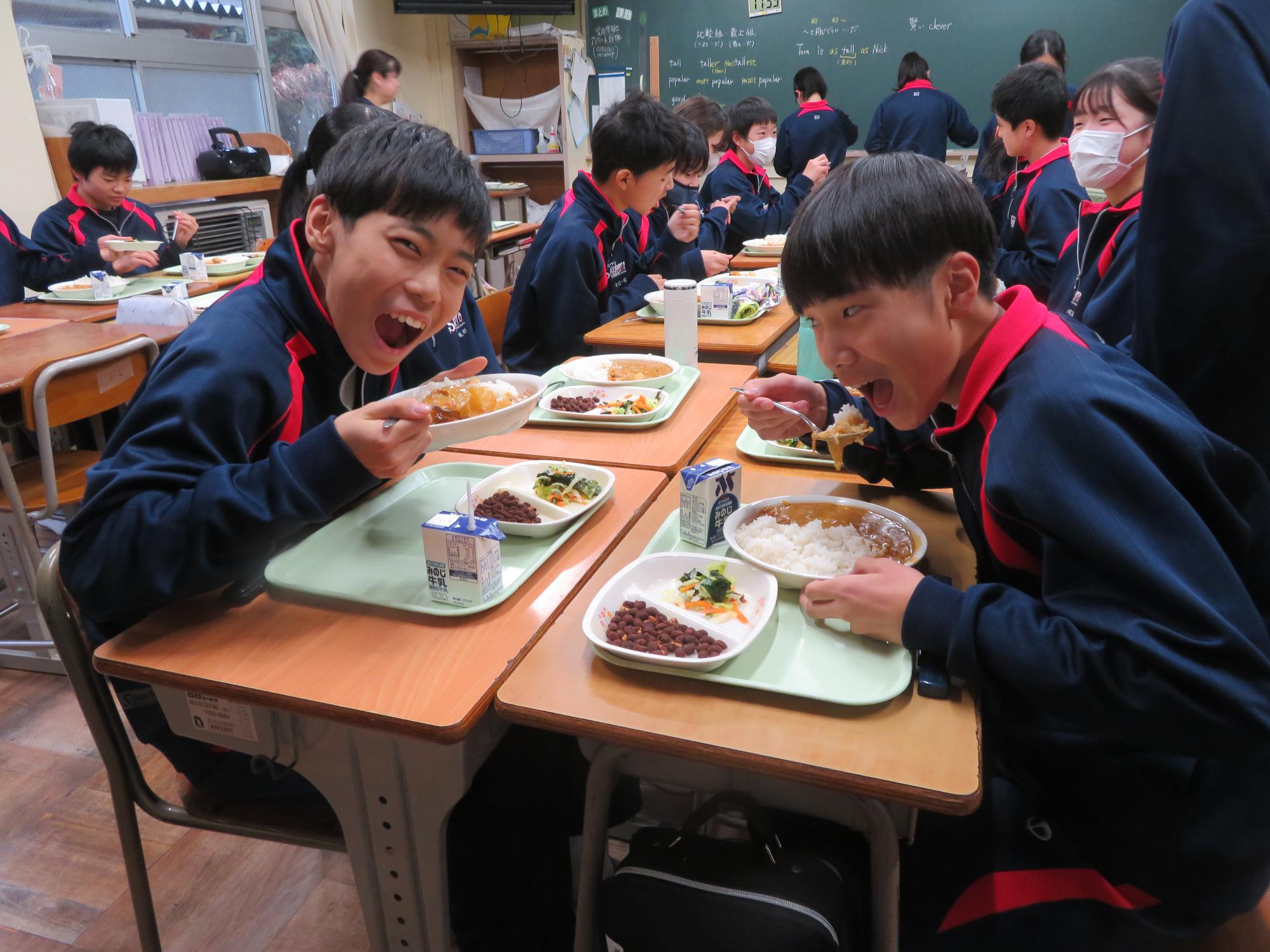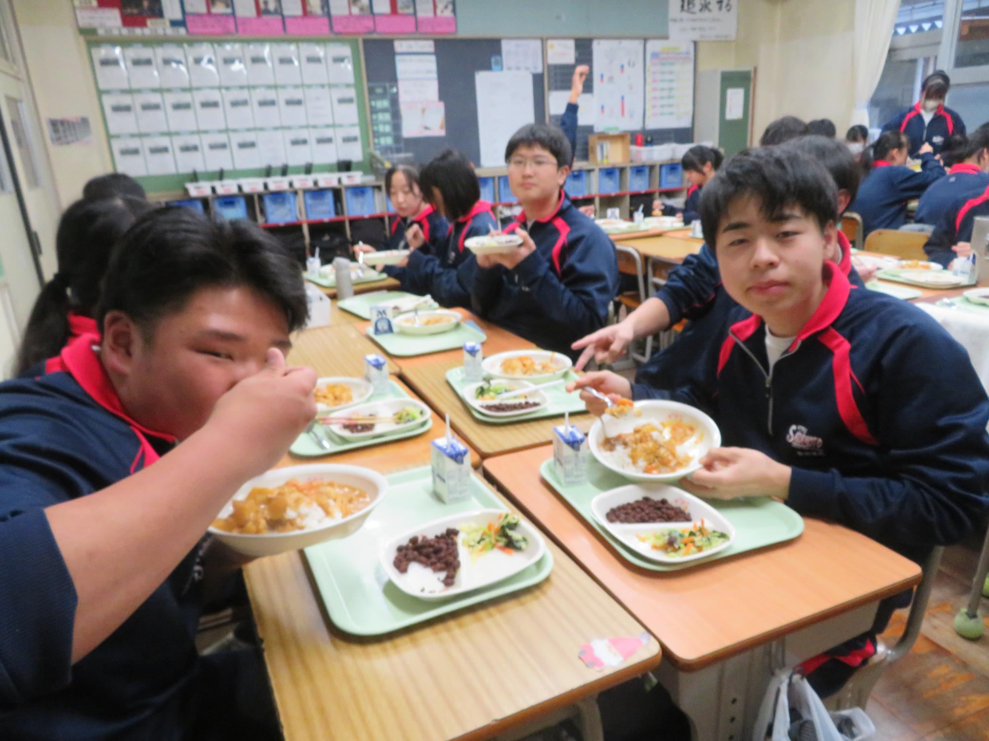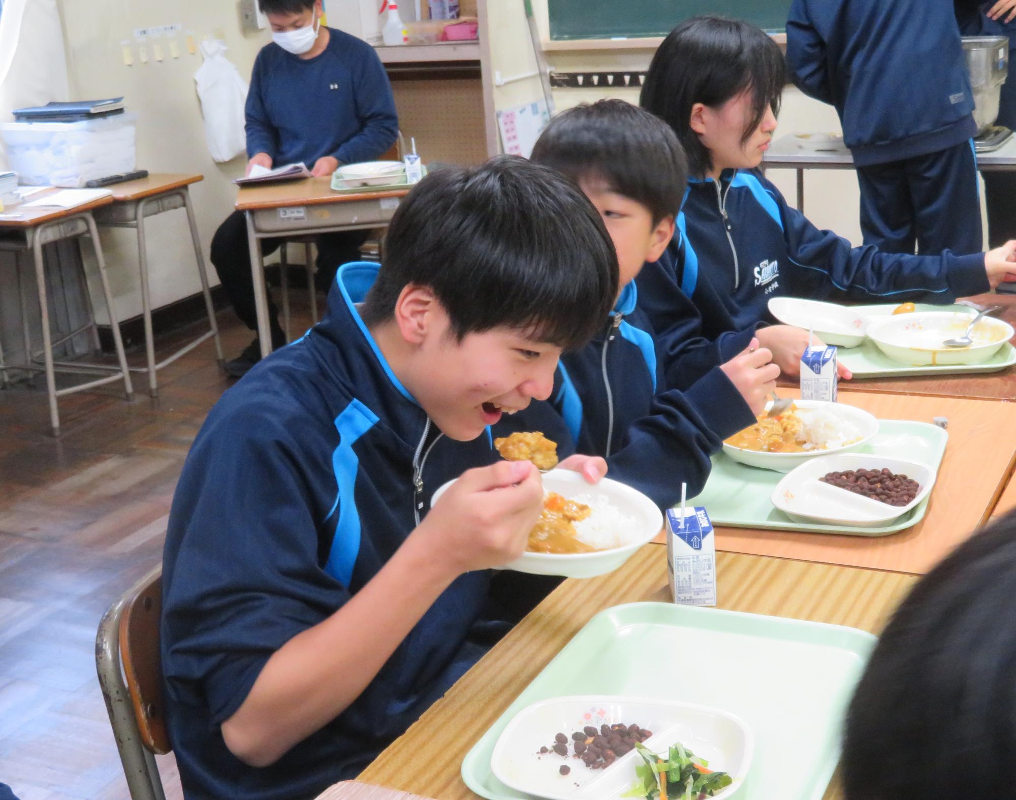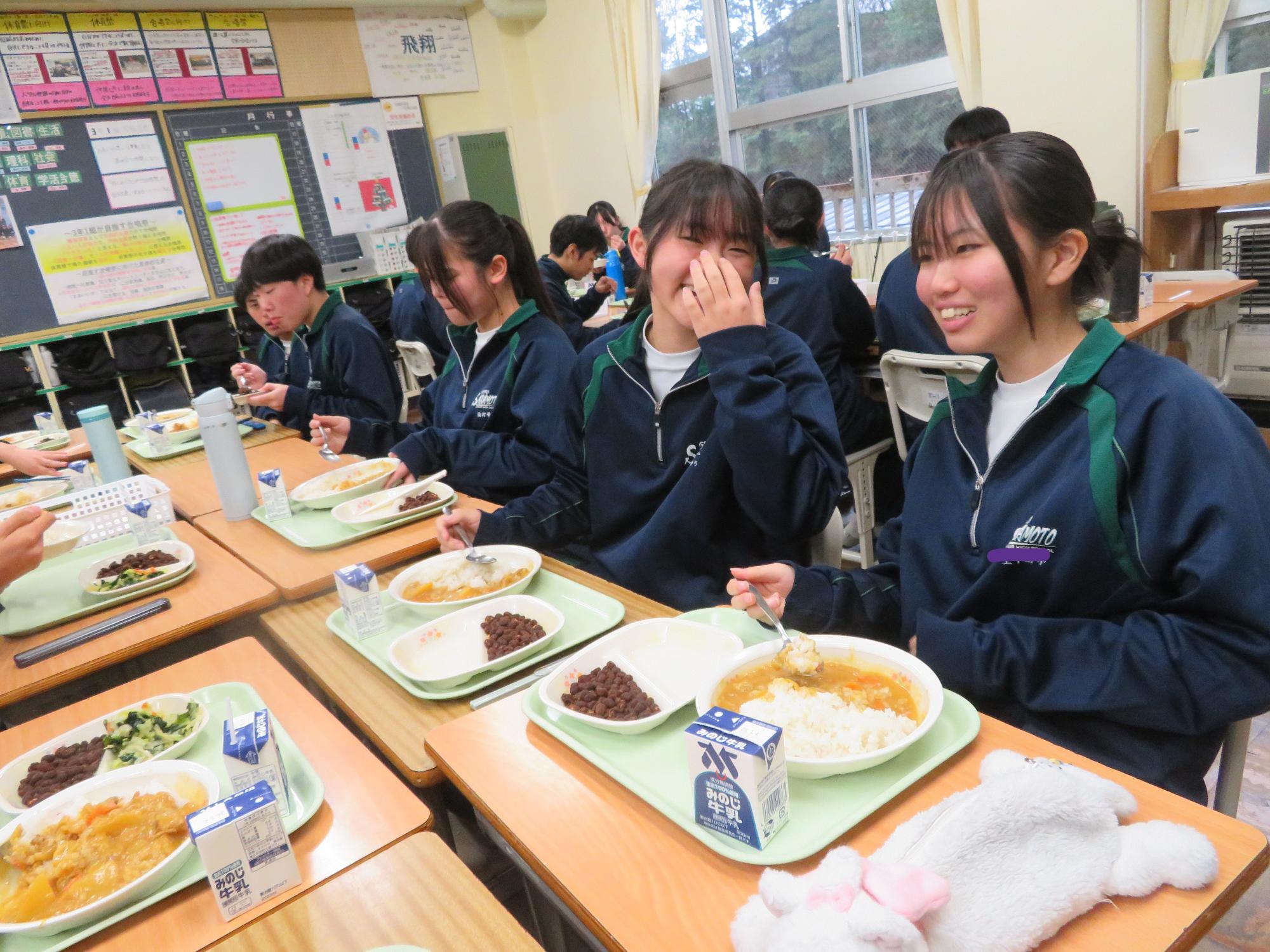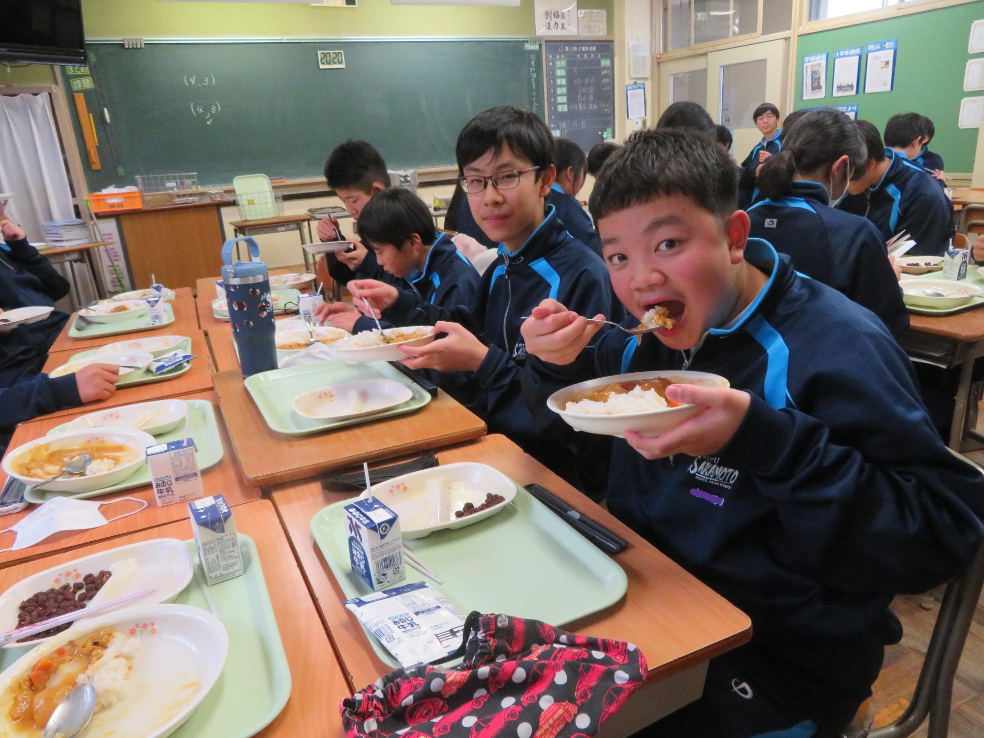 坂本中学校調理場の利用は本日で終了です。1月からは新坂本地区調理場で給食が作られます。本日、坂本中調理場のお別れということもあり、生徒たちは「今までありがとうございました!」と感謝の気持ちを込めて、給食の食器や食缶を返却する生徒がたくさん見られました。また、前期と後期の給食委員長が、調理員さんたちと給食調理場の施設にお礼にいく場面も見られました。最後のメニューはカレーライス。どのクラスも残量ゼロとなるよう意識しながら、感謝の気持ちを込めてもりもり食べていました。