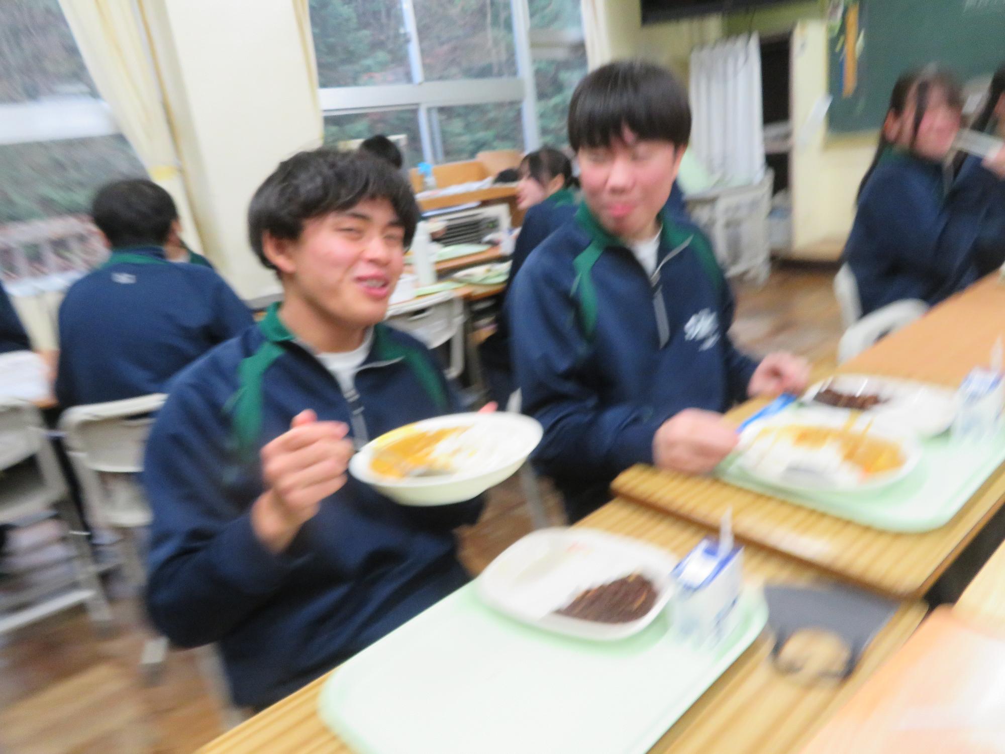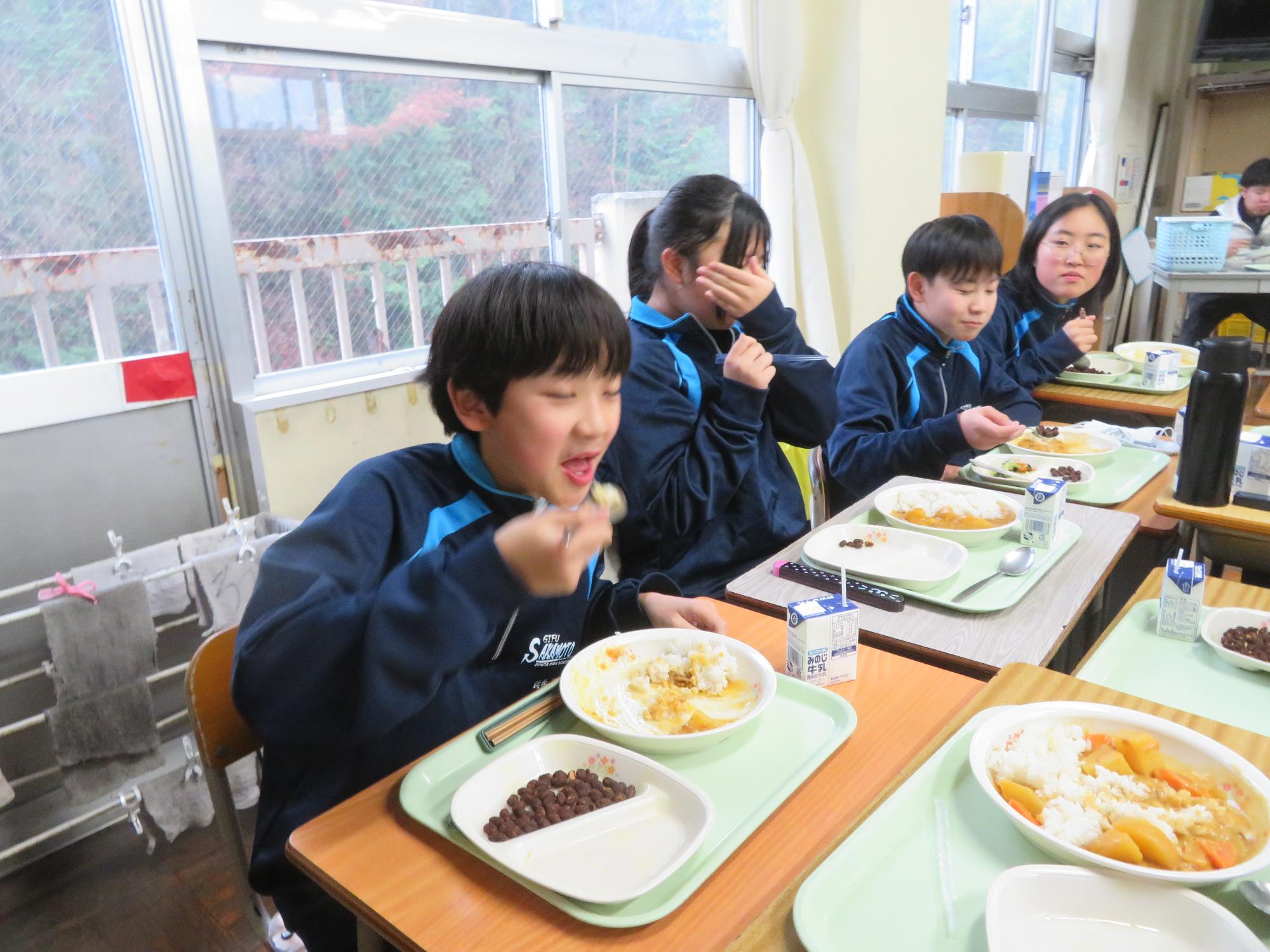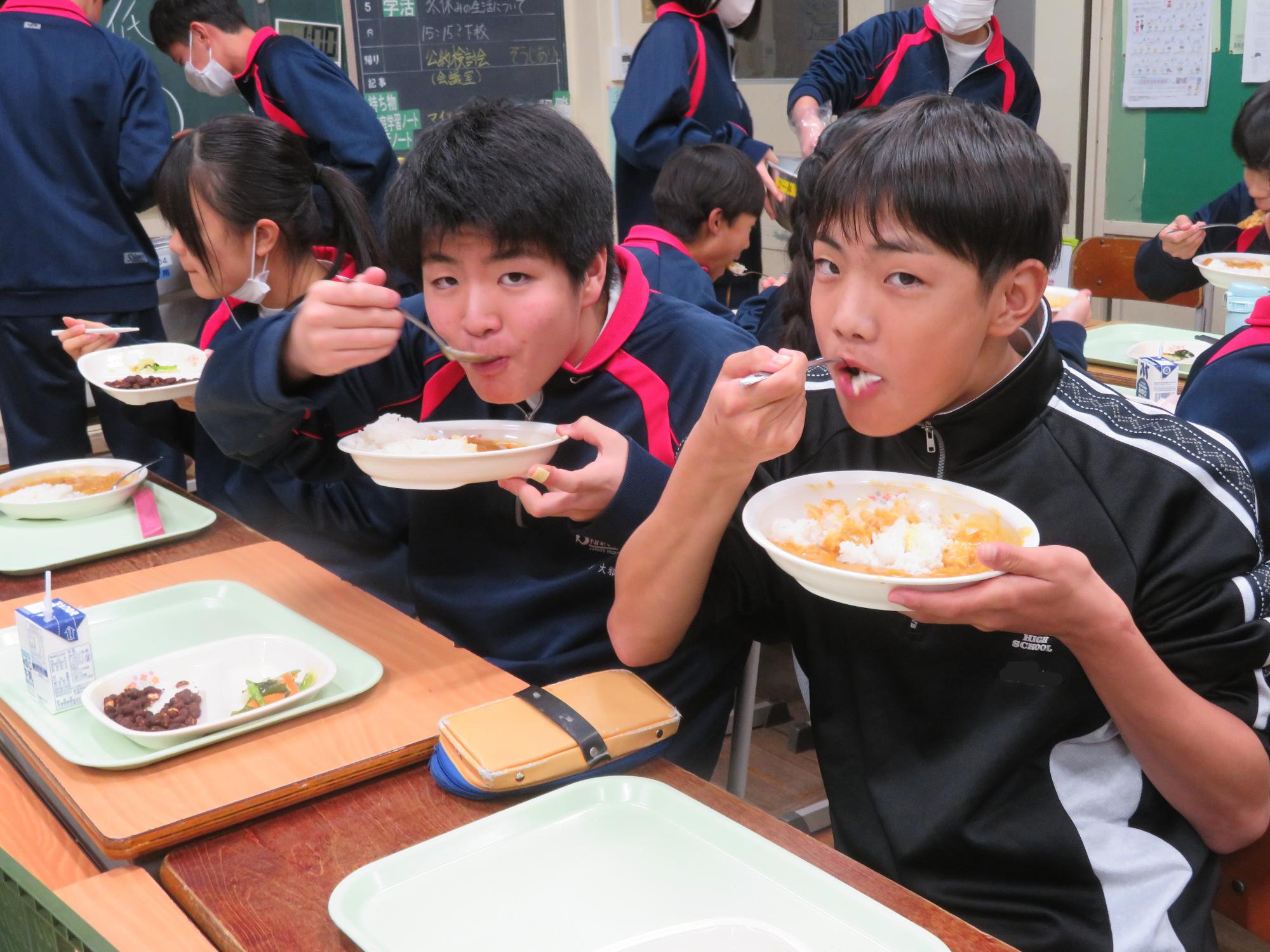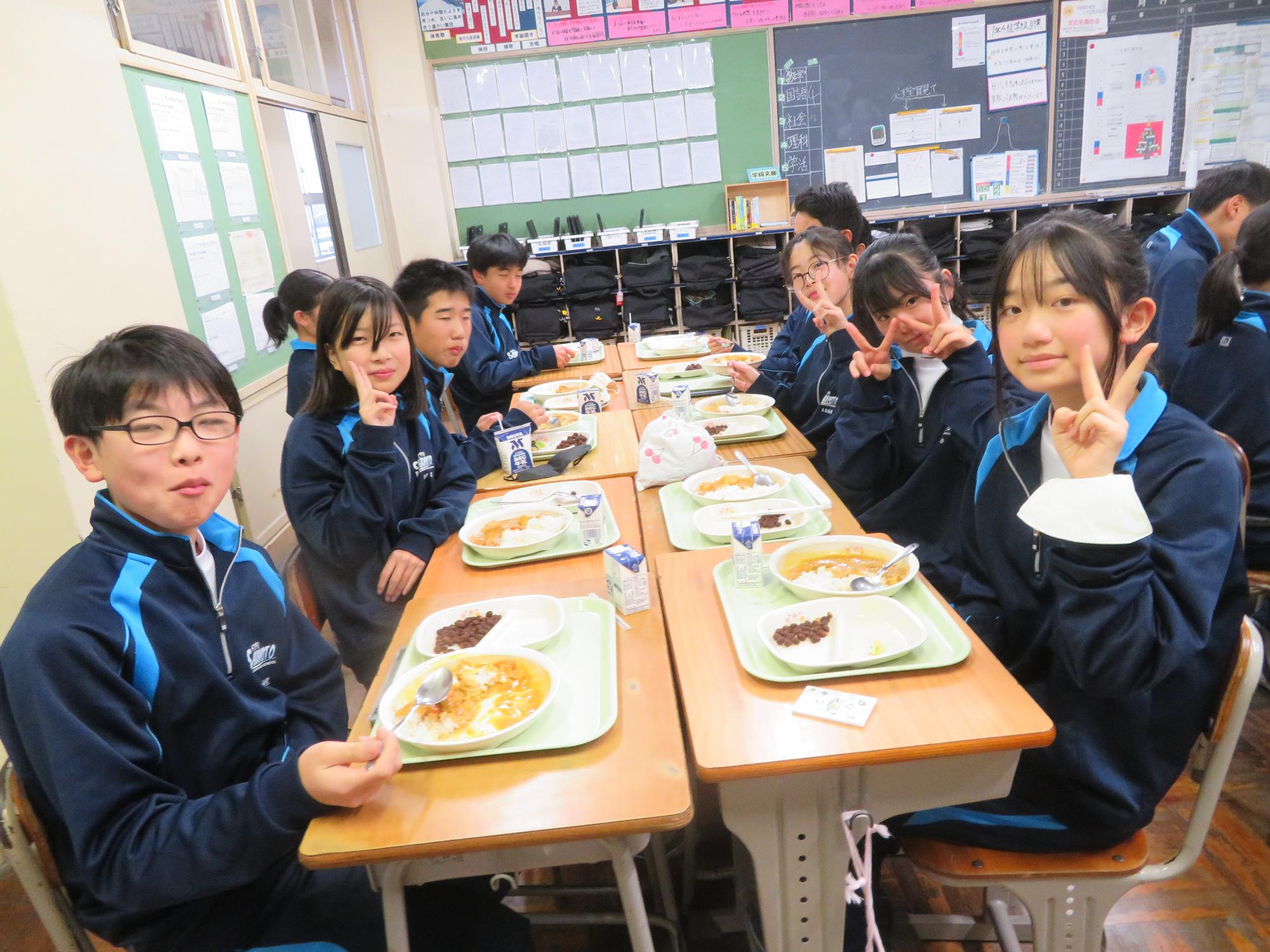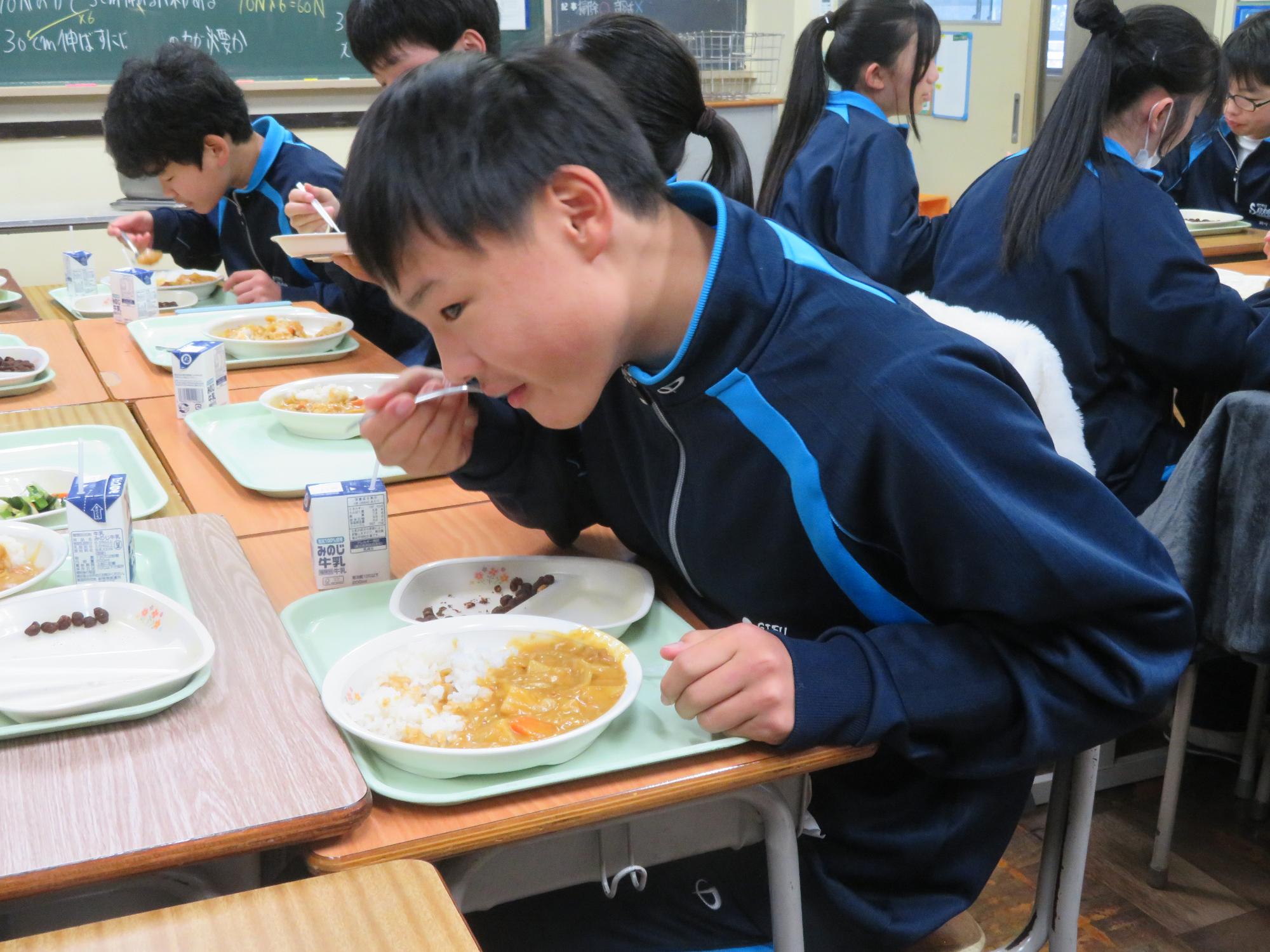 坂本中学校調理場の利用は本日で終了です。1月からは新坂本地区調理場で給食が作られます。本日、坂本中調理場のお別れということもあり、生徒たちは「今までありがとうございました!」と感謝の気持ちを込めて、給食の食器や食缶を返却する生徒がたくさん見られました。また、前期と後期の給食委員長が、調理員さんたちと給食調理場の施設にお礼にいく場面も見られました。最後のメニューはカレーライス。どのクラスも残量ゼロとなるよう意識しながら、感謝の気持ちを込めてもりもり食べていました。